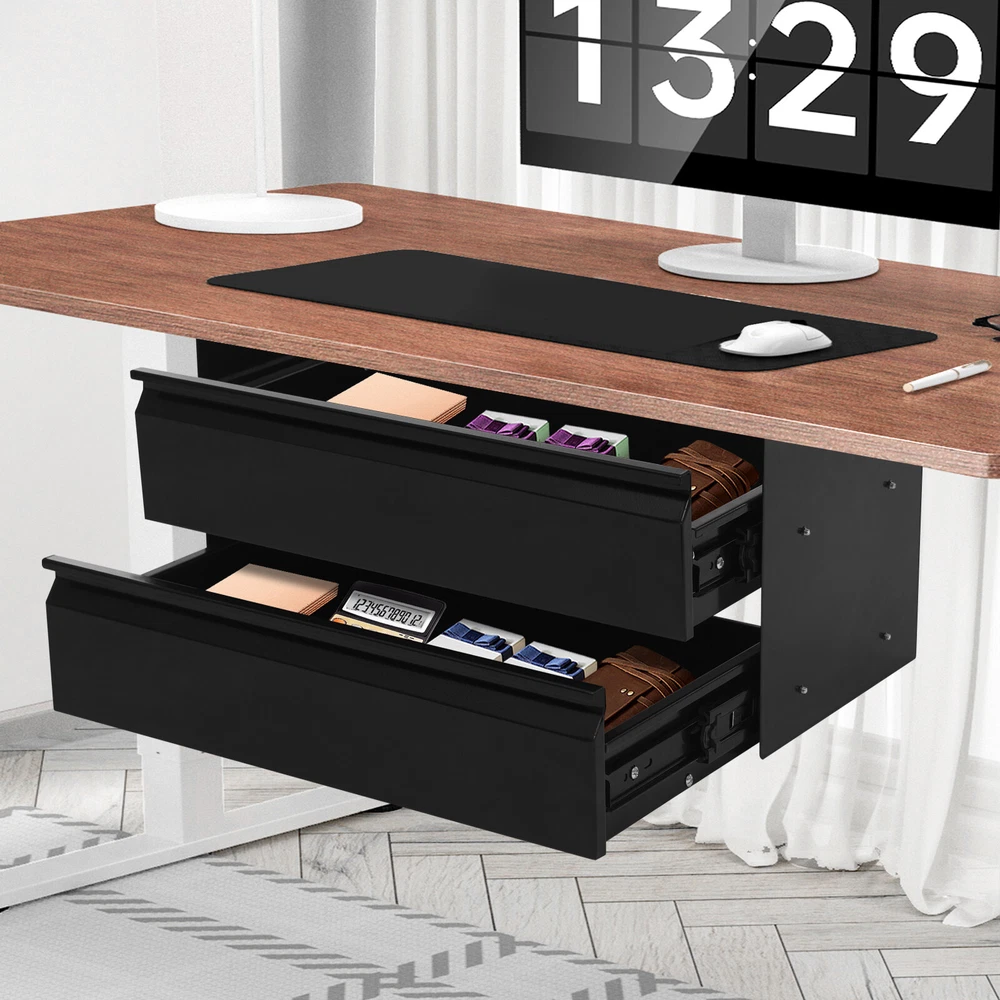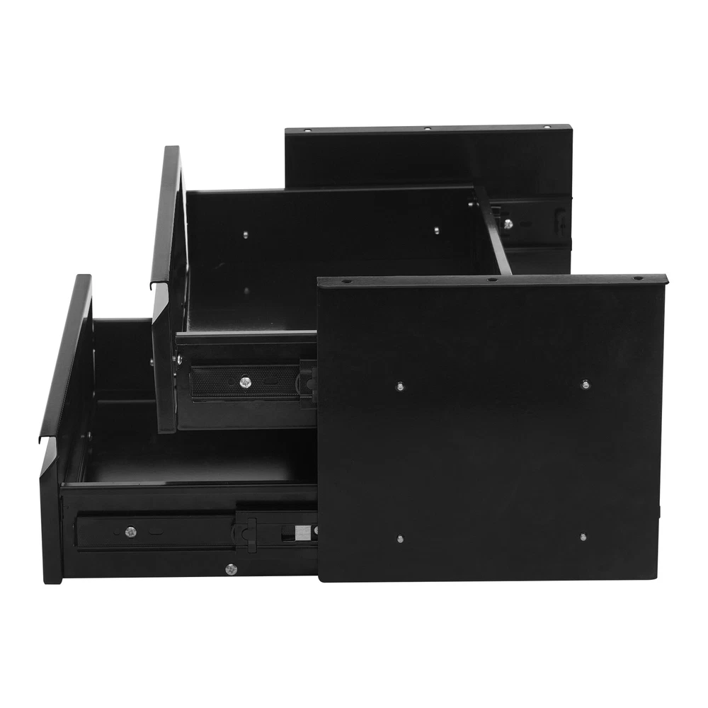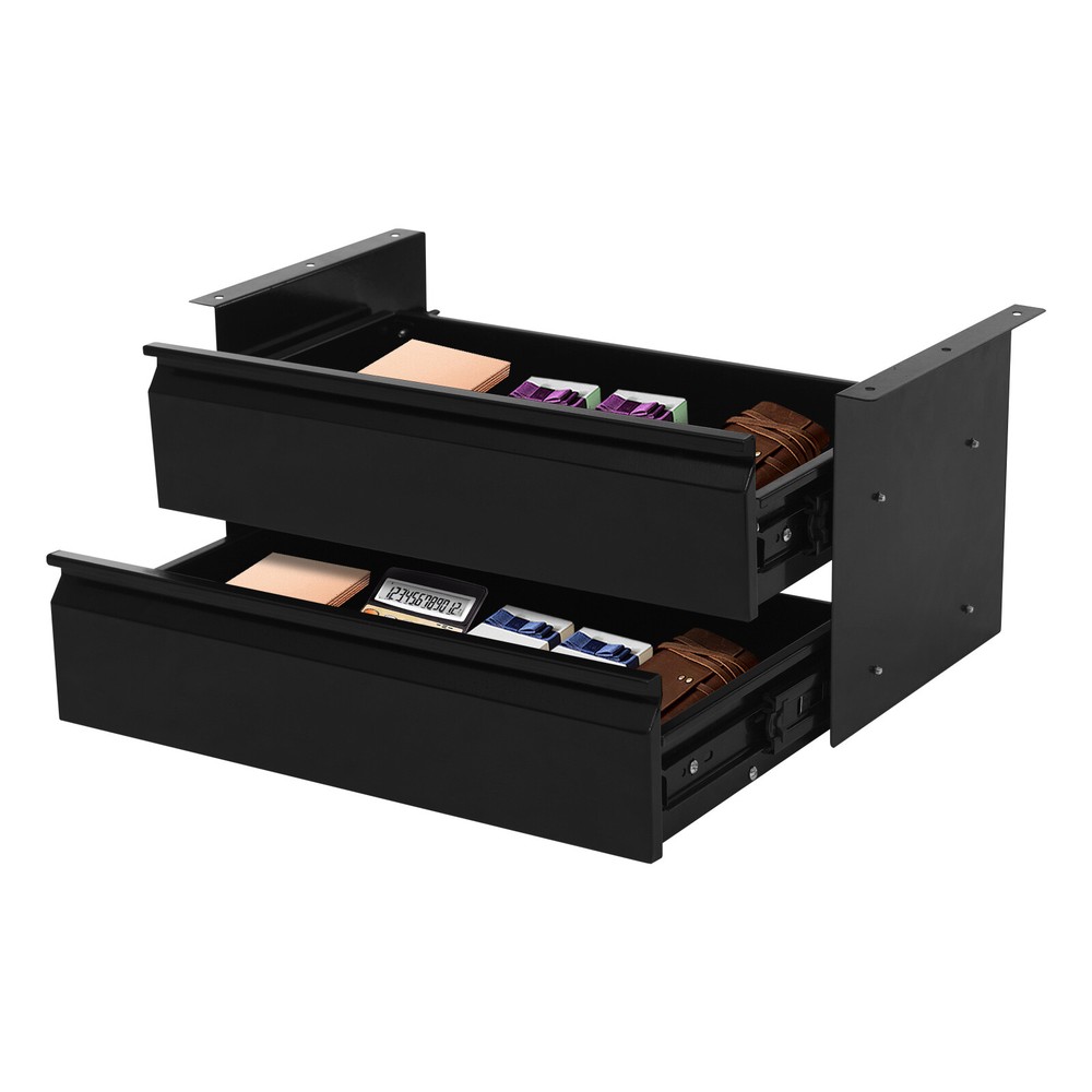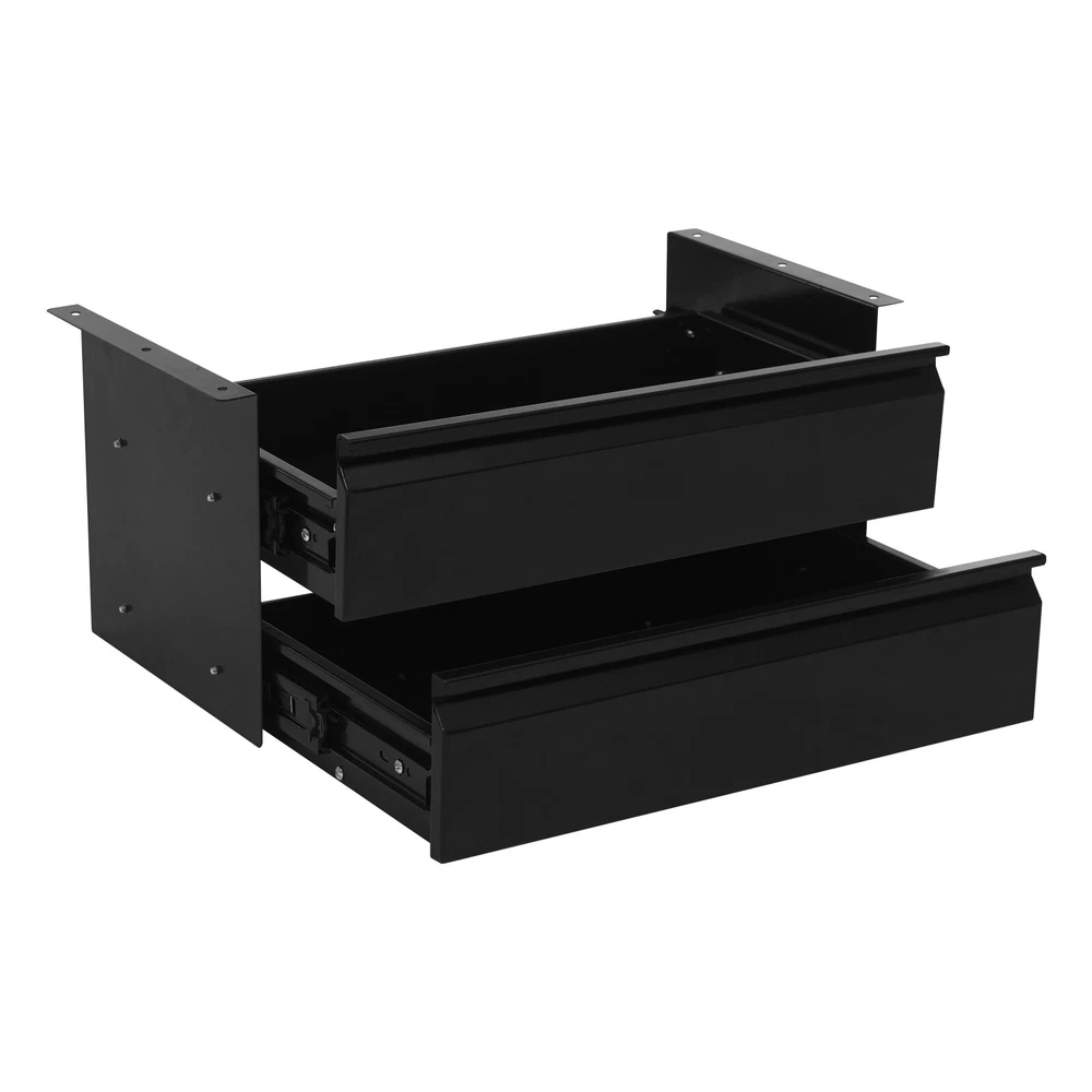 This under-desk sliding drawer is a game-changer for keeping my workspace clutter-free! The sturdy steel construction feels durable, and the smooth gliding tracks make accessing items a breeze. It was easy to assemble and fits snugly under my desk without wobbling. The two-tier design maximizes vertical space, perfect for storing small supplies, cables, or snacks. The black finish looks sleek and blends well with any setup. Even with a full load, it stays secure and stable. Super practical and space-saving—highly recommend for anyone needing extra organization!