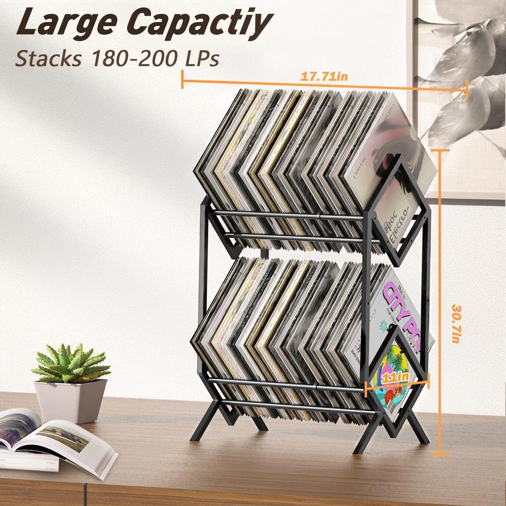 2-Tier-Vinyl-Record-Storage-Holder With Dividers, 200 LPs 2 Tier, Black Product Details Material: Metal Color: Black Special Feature: Scratch Resistant Product Dimensions: 17.7"D x 11"W x 30.7"H Shelf Type: Tiered Shelf Number of Shelves: 2 Room Type: Bedroom, Living Room, Home Office, Study Room Finish Type: Powder Coated Assembly Required: Yes Mounting Type: Floor Mount Recommended Uses For Product: Media Included Components: record stand Brand: RUILALIFE Style: Modern Item Weight: 6.03 pounds Manufacturer: RUILALIFE Country of Origin: China Item model number: vinyl record storage shelf holder stand Finish types: Powder Coated Batteries required: No Upgraded Divider:Metal supporting bar of vinyl record storage rack were upgraded, which has 3 supporting point to keep divider steady on the place to keep vinyl records always upright or separate from the different collections, and won’t let them fall over even when the rack is not filled. Specially finished divider make it not easy to scratch rack. Sturdy Construction:Vinyl record storage display shelf made of carbon steel, it is painted with high quality smooth powder coatings to protect your beloved records from scratches. Triangular structure make metal vinyl record holder stable and not easy to fall. The 45°tilt angle makes music records easy to store and find. No flipping through a crate to find a particular record. Large Capacity Efficient Storage:Dimension of 2-tier vinyl record organizer shelf is 17.7*11*30.7 inch which can hold 180-200 LPs Albums in an organized and stylish manner. Y'all know how heavy vinyl albums can get and this bad-boy handles the load without a hitch. Thoughtful Design:Vinyl record storage holder is equipped with small anti-slip rubber pads for the legs that prevents scratching of countertop. Vinyl record shelf with soft silicone pads on square frame that won't damage or scratch your album. Side baffles prevent albums from tilting and slipping. Vinyl record player stand and storage could be assembled in about 5 minutes without any difficulty. Display Your Record Perfectly:If you are looking for a better and stylish solution for your precious vinyl collection, look no further, choose our minimalist design vinyl record stand right now ,which not only provide you with a clean and organized space, but also allow you to have a exclusive music area to play them from time to time and enjoy great music.