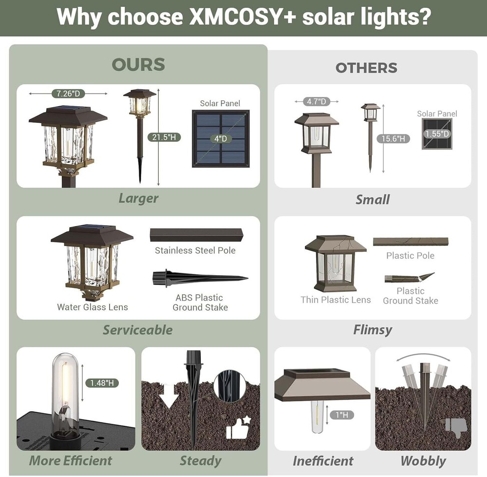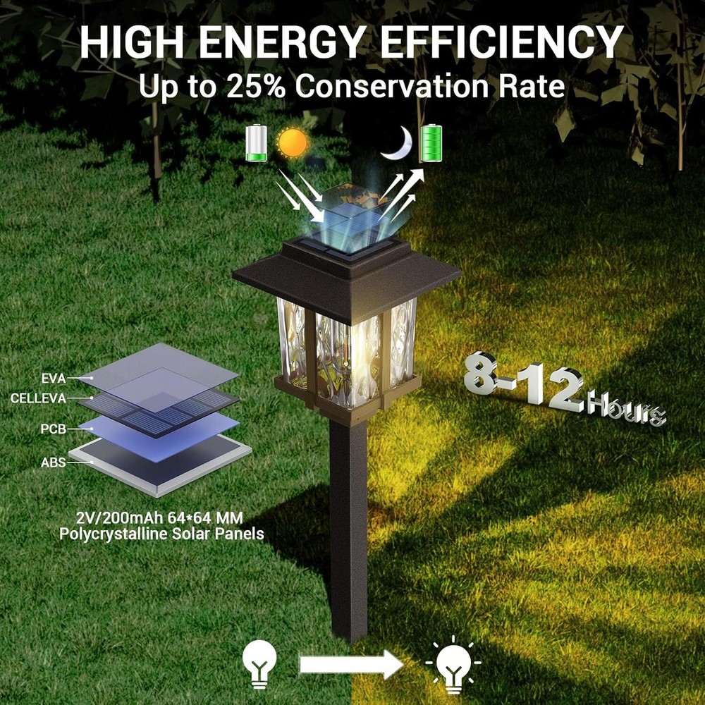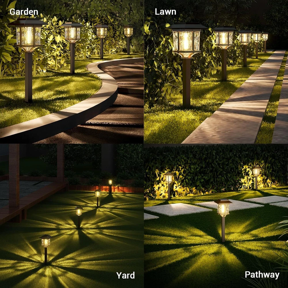 Product Description Solar Outdoor Lights 15 LM Garden Lights with Metal Glass, 2-Tone Bronze & Wood (Color) Pathway Lights, IP65 Waterproof LED Lighting for Yard Landscape Walkway Driveway (4 Pack, Warm White) Dusk to Dawn Lighting Time: Solar outdoor lights will continue ALL nighttime illumination for up to 8-10 hours after fully charged 4-6 hours in the day, automatically turn on at dust, and turn off at dawn. Long-lasting LED lights are maintenance-free. 100% Solar-Powered & Low Carbon Footprint: Built-in 1.2V 1000mAh NI-MH AA rechargeable battery (included) and crystalline solar panel, Solar Landscape Lights absorb and convert sunlight effectively into electricity, making them more cost-effective. Elegant & Attractive Illumination Pattern: Innovative 2-tone bronze Tone & wood Tone Solar Outdoor Pathway Lights with high transmittance water glass Len, integrated LED with vintage bulb for a beautiful 15-lumen warm white lighting effect and atmosphere. Simple Installation: With no wiring necessary and LED bulbs, solar path lights are easily installed and practically maintenance free, stake into the ground wherever the sunshine is. Product Size: 5.25"*5.25"*22" Height (including ground insertion). IP65 Waterproof: Made of specifically designed to withstand extreme weather conditions materials: corrosion-resistant stainless steel, robust ABS plastic ground stake, walkway solar lights can stand up to the bad weather for multi-season outdoor use. About Us We are a reputable seller with many years of experience selling on eBay. Our goal is to provide high-quality products and excellent customer service. Shipping Items will be shipped within 1-3 business days when we received payment. (Orders are not processed on weekends & holidays) Tracking information will be sent once item is shipped. Delivery time depends on destination and other factors Item is shipped to ebay address. Leaving correct address can minimize delay. For international shipping and shipping to Guam, Hawaii and Alaska, Please contact us before placing the order. International buyers please note: Import duties, taxes and charges are not included in the item price or shipping charges. These charges are buyer’s responsibility. We will try our best to reduce the risk of the custom duties. Local pick-up is unavailable at the moment. Contact Us We reply any email messages within 1 business / working days(off-duty at weekend). If you do not get a response from us, then please check your junk or spam mailbox. Our Business hours: Mon-Fri 9:00-18:00, UTC/GMT +8 hours. Please contact us either by clicking "contact seller" in the "purchase history" section or simply click "ask a question" at the bottom of this page. If you are unsatisfied with our item or service, please contact us before leaving any feedback. We are committed to resolve all issues in a friendly and satisfactory manner.
