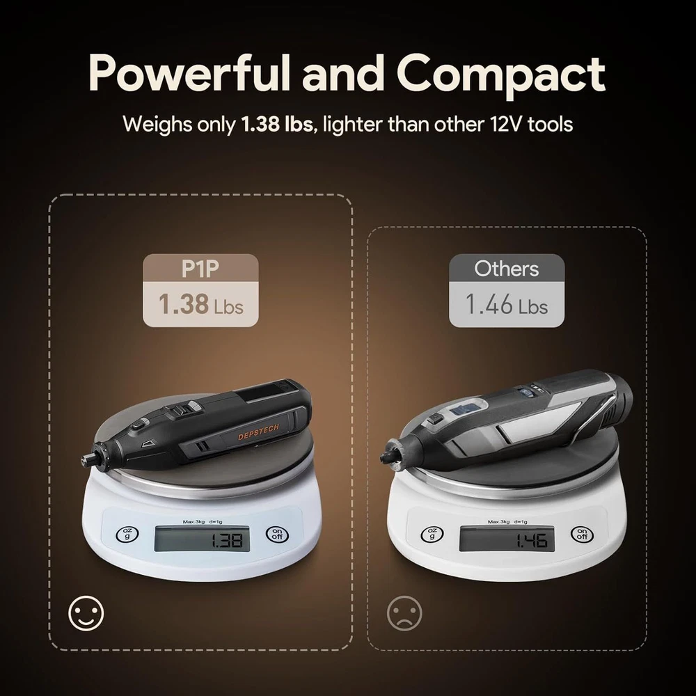 Voltage 12 Volts Power Source Battery Powered Recommended Uses For Product Carving, Cutting, Drilling, Sanding, Engraving, Cleaning, Polishing, DIY Craft, Household Repairs and Automotive Maintenance Carving, Cutting, Drilling, Sanding, Engraving, Cleaning, Polishing, DIY Craft, Household Repairs and Automotive Maintenance Special Feature Large Display Screen, 12V Powerful Motor, 3x 2.5Ah Battery, Support Fast Charging, 5 Variable Speed 5,000RPM to 35,000RPM, 48pcs Enduring Accessories Large Display Screen, 12V Powerful Motor, 3x 2.5Ah Battery, Support Fast Charging, 5 Variable Speed 5,000RPM to 35,000RPM, 48pcs Enduring Accessories About this item ใ๐๐๐ ๐๐จ๐ฐ๐๐ซ๐๐ฎ๐ฅ ๐๐จ๐ญ๐จ๐ซ, ๐๐๐๐-๐๐๐๐๐๐๐๐ใDEPSTECH P1P 12V cordless rotary tool is able to cover most family handcraft scenarios from DIY, home repair, auto repair to garden maintenance etc. It support 5 variable speeds up to 35,000RPM, capable of handling heavy-duty work than the 4V/8V electric grinder. ใ๐๐๐ ๐ ๐๐ฌ๐ญ ๐๐ก๐๐ซ๐ ๐ข๐ง๐ & ๐.๐๐๐ก ๐๐จ๐ง๐ ๐๐๐ญ๐ญ๐๐ซ๐ฒ ๐๐ข๐๐ใDEPSTECH P1P rotary tool kit built-in ๐ ๐ฑ ๐.๐๐๐ก lithium-ion batteries to deliver longer runtime. The convenient USB-C charging cable ensures you're always ready to charge with a power bank, car charger or wall charger. And it supports ๐๐๐ ๐๐๐ฌ๐ญ ๐๐ก๐๐ซ๐ ๐ข๐ง๐ (๐๐ก๐๐ซ๐ ๐ข๐ง๐ ๐ข๐๐จ๐ง ๐๐ฅ๐๐ฌ๐ก๐๐ฌ ๐ช๐ฎ๐ข๐๐ค๐ฅ๐ฒ), allowing you to complete charging in a short time and resume work promptly. ใ๐๐๐ซ๐ ๐ ๐๐ข๐ฌ๐ฉ๐ฅ๐๐ฒ ๐๐๐ซ๐๐๐งใCompared with traditional multi tools, this rotary tool has a more modern and technological appearance design, It comes with a large digital screen that accurately monitors remaining power and speed, so that you can easily control your working status at every moment. ใ๐ ๐๐ข๐ง๐ฌ ๐๐๐ฆ๐จ๐ซ๐ฒ ๐ ๐ฎ๐ง๐๐ญ๐ข๐จ๐งใThis carving tool can remember the speed setting you last used within 5 minutes of shutting down, remains enough time to change accessories or take a break, no need to re-adjust it every time. After 5 minutes, it will return to the default 3rd speed. ใ๐๐ซ๐ ๐จ๐ง๐จ๐ฆ๐ข๐ ๐๐๐ฌ๐ข๐ ๐ง & ๐๐จ๐ฐ ๐๐จ๐ข๐ฌ๐ใErgonomic & Compact design with larger area soft rubber for anti-slip and comfortable grip, maximizing comfort and control during long work sessions. DEPSTECH P1P has less noise and vibration than other rotary tools of the same power, which can reduce interference to the surrounding environment and other people. ใ๐๐ฎ๐ฅ๐ญ๐ข๐ฉ๐ฎ๐ซ๐ฉ๐จ๐ฌ๐ ๐๐ซ๐๐๐ญ ๐๐จ๐จ๐ฅใEnduring 48pcs rotary tool accessories are packed in a EVA carrying bag. These high-quality accessories allow the tool to handle various tasks like cutting, sanding, engraving, drilling and metal processing effortlessly. Equipped with a universal keyless chuck, able to compatible with Dremel accessories & attachments. Voltage โ12 Volts Power Source โBattery Powered Recommended Uses For Product โCarving, Cutting, Drilling, Sanding, Engraving, Cleaning, Polishing, DIY Craft, Household Repairs and Automotive Maintenance Special Feature โLarge Display Screen, 12V Powerful Motor, 3x 2.5Ah Battery, Support Fast Charging, 5 Variable Speed 5,000RPM to 35,000RPM, 48pcs Enduring Accessories Included Components โ1 X Cordless Rotary Tool, 1 X Plastic Case, 1 X Storage Box, 1 X C to C Cable, 1 X Universal Chuck, 1 X Drill Locator, 1 X Cover Shield, 8 X Sanding Paper , 1 X Sanding Shank, 3 X Diamond Burr Bit, 3 X Woodworking Milling Cutter, 1 X HSS Drill, 10 X Double Mesh Cutting Disc, 1 X Cut-off Wheel Mandrel, 3 X Abrasive Stone, 3 X Rubber grinder with Shank, 4 X Felt Wheel, 1 X Felt Wheel Mandrel, 1 X Wire Brushes, 1 X Plastic brushes, 1 X Wrench Item Weight โ1.37 Pounds Maximum Rotational Speed โ35000 RPM Number of Batteries โ1 AAA batteries required. (included) Style โCordless Rotary Tool Item dimensions L x W x H โ9.33 x 1.92 x 2.12 inches Minimum Speed โ5000 RPM Part Number โP1P Item Weight โ1.37 pounds Product Dimensions โ9.33 x 1.92 x 2.12 inches