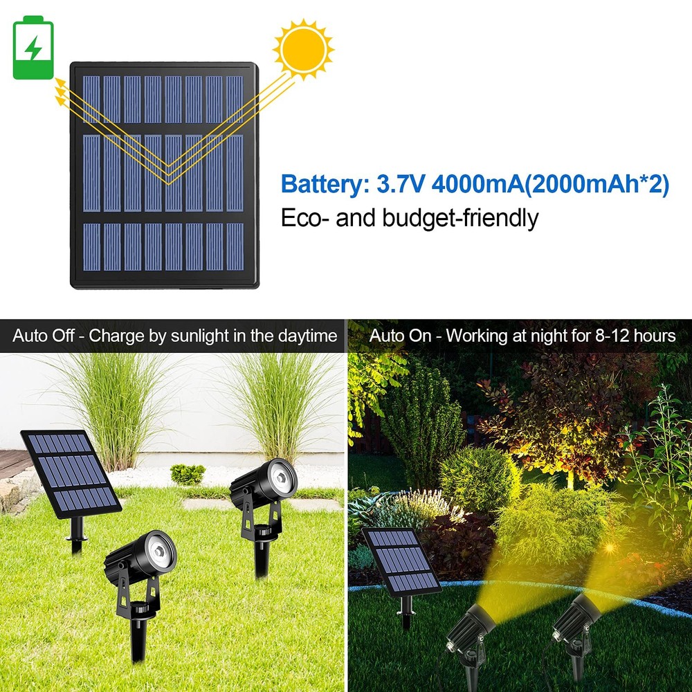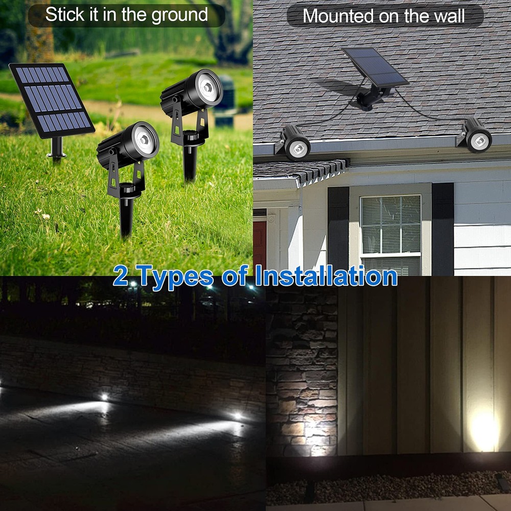 【 Solar Spotlights 】Poly-crystalline bigger sized 2W solar panel, holding the efficiency up to 17% conversion of solar energy. Built-in the rechargeable battery providing more than 12 hours working after 8 hours fully charged. Auto on in the darkness and auto off at sunrise, no wiring required, power and bill saving. 【 2 Mode & 2 Types of Installation 】High and low light modes, high light continuously last for 8 hours and low light for 12 hours. solar lights can be inserted in the ground or mounted on the wall with included accessories, easy to install and convenient to use. 【 Adjustable & Fully Cover】270° Adjustable dual headlight with a separate solar panel, and the line between the landscape lights and the solar panel is 10.8 feet long, it's not only able to illuminate your desired spot but also to get optimum sun exposure. Extra 5m extension cable available: Please search B095314R6J. 【 Durable & IP65 Waterproof 】solar landscape lights is made of aluminum alloy with great heat dissipation. Higher level IP65 waterproof can withstand rain and snow. Very suitable for outdoor use, such as garden, patio, yard, tree, driveway, swimming pool and other areas. 【 Widely Used for】Solar landscape spotlights are perfect for your garden, pool area, yard, driveway, pathway, pond ,trees and etc..