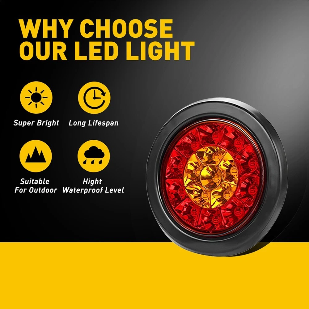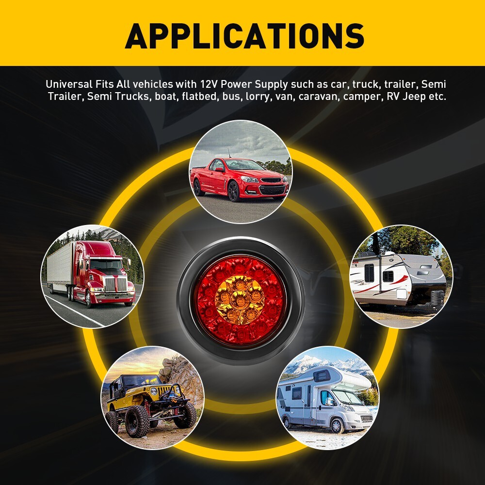 Specification Material: ABS & Rubber Voltage:12V-24V Waterproof grade:IP67 Service life: 50000H+ Light color: Red(10 leds),amber(6 leds) LED quantity: 16 LEDs per unit Universal for: Trucks, trailers, tractors, semi-trailer, Dump Truck, bus, boat, special vehicle, and etc. Features: *High brightness: Adopts 16 pieces of advanced LED lamp beads glowing brightly but not dazzlingly. 100% Brighter than halogen bulbs but more Energy-saving. *Waterproof: The tail light is highly silicon sealed with an IP67 waterproof rating, which works even under extreme conditions such as rain and snow. *Easy to install: 2X 4inch Amber Red Round LED Truck Trailer Tail Lights Stop Turn Brake DRL Lamp Specification Material: ABS & Rubber Voltage:12V-24V Waterproof grade:IP67 Service life: 50000H+ Light color: Red(10 leds),amber(6 leds) LED quantity: 16 LEDs per unit Universal for: Trucks, trailers, tractors, semi-trailer, Dump Truck, bus, boat, special vehicle, and etc. Features: *High brightness: Adopts 16 pieces of advanced LED lamp beads glowing brightly but not dazzlingly. 100% Brighter than halogen bulbs but more Energy-saving. *Waterproof: The tail light is highly silicon sealed with an IP67 waterproof rating, which works even under extreme conditions such as rain and snow. *Easy to install: Easy installation with direct replacement, other modifications are not required. *Connection Black wire connects to negative. Red wire:Braking light (Red light with high brightness) Blue wire:Driving light(Red light with low brightness) Yellow wire: Turn signal light(Amber light) *Functions Tail Light, Running Light, Stop Light, Turn Signal Light, etc. *Wide application: Universal Fits All vehicles with 12V Power Supply such as car, truck, trailer, Semi Trailer, Semi Trucks, boat, flatbed, bus, lorry, van, caravan, camper, RV Jeep etc. Note: Please check the detail information carefully before purchasing. Your satisfaction is our utmost concern, please feel free to contact us for any questions and concerns. Package Include: Tail light*2 Item Specifics Brand AUXITO Placement on Vehicle Rear, Left, Right, Outer, Bed Type Rear Tail Lights/Brake Lights Bar Manufacturer Part Number Does Not Apply Voltage 12V Color Red Brake Light Amber Turn light Fitment Type Performance/Custom To Fit Tail Lights Material ABS Housing ++++ PC Lens Lighting Technology LED Applications Universal For Any 12V Vehicles Heavy trucks LED Type 16 Lighting Type Trailer Lights Waterproof IP67 Position 1 Stop turn tail brake marker Clearance Light Position 2 3rd brake Light, ID Bar Light Widely used Trucks, trailers, tractors, semi-trailer Widely used 1 Dump Truck, bus, boat, special vehicle Widely used 2 Dump Truck, bus, boat, special vehicle Widely used 3 Cab Rails ORV Golf Cart Freightliner Widely used 4 Bus semi-trailer motorhome tractors Dump Truck Widely used 5 travel trailer, boat trailer, horse trailer Widely used 6 camper trailer, cargo trailer etc. Warranty 1 Year Payment Returns DESCRIPTION PAYMENT SHIPPING RETURN POLICY CONTACT US Shop Category Store Home LED Headlight ◈ H4 ◈ H13 LED Reverse Light ◈ T15/921/W16W LED License Plate Light LED Side Marker Light Car Parts & Accessories Tail Light assemblies Other Hot Item Red 15" LED Truck Trailer Strip 3rd Light Brake Rear Turn Stop Tail Light Bar USD 18.99 2x 4inch Round LED Truck Trailer Stop Turn Tail Brake Lights Reverse Waterproof USD 18.99 Red 2X 15" LED Truck Trailer 3rd Strip Brake Lights Rear Turn Tail Light Bar US USD 18.99 2X 4inch Amber Red Round LED Truck Trailer Tail Lights Stop Turn Brake DRL Lamp USD 16.14 2PCS 15" Red LED Truck Trailer Strip Brake Lights 3rd Rear Turn Tail Light Bar USD 18.99 Picture New List Item AUXITO 2*H7 LED Bulb Headlight 120W 20000LM Super Bright Kit High Low Beam White USD 22.41 Fits 2001 02 2003 Honda Civic Chrome Housing Clear Corner Headlight Head Lamps V USD 66.49 For 2007-2018 Jeep Wrangler JK Smoked Lens Amber Front LED Side Marker Lights 2X USD 18.99 For 2004-2009 Mazda 3 Sedan Black Housing Amber Corner Projector Headlight 2pcs USD 104.49 Black Left & Right Projector Headlights For 2010-2014 Subaru Legacy&Outback USD 138.69 Help & Info Payment Policy Shipping Policy Return Policy FAQ About Us 2X 4inch Amber Red Round LED Truck Trailer Tail Lights Stop Turn Brake DRL Lamp Specification Material: ABS & Rubber Voltage:12V-24V Waterproof grade:IP67 Service life: 50000H+ Light color: Red(10 leds),amber(6 leds) LED quantity: 16 LEDs per unit Universal for: Trucks, trailers, tractors, semi-trailer, Dump Truck, bus, boat, special vehicle, and etc. Features: *High brightness: Adopts 16 pieces of advanced LED lamp beads glowing brightly but not dazzlingly. 100% Brighter than halogen bulbs but more Energy-saving. *Waterproof: The tail light is highly silicon sealed with an IP67 waterproof rating, which works even under extreme conditions such as rain and snow. *Easy to install: Easy installation with direct replacement, other modifications are not required. *Connection Black wire connects to negative. Red wire:Braking light (Red light with high brightness) Blue wire:Driving light(Red light with low brightness) Yellow wire: Turn signal light(Amber light) *Functions Tail Light, Running Light, Stop Light, Turn Signal Light, etc. *Wide application: Universal Fits All vehicles with 12V Power Supply such as car, truck, trailer, Semi Trailer, Semi Trucks, boat, flatbed, bus, lorry, van, caravan, camper, RV Jeep etc. Note: Please check the detail information carefully before purchasing. Your satisfaction is our utmost concern, please feel free to contact us for any questions and concerns. Package Include: Tail light*2 Payment Returns All rights reserved. On Dec 16, 2024 at 06:20:40 PST, seller added the following information: