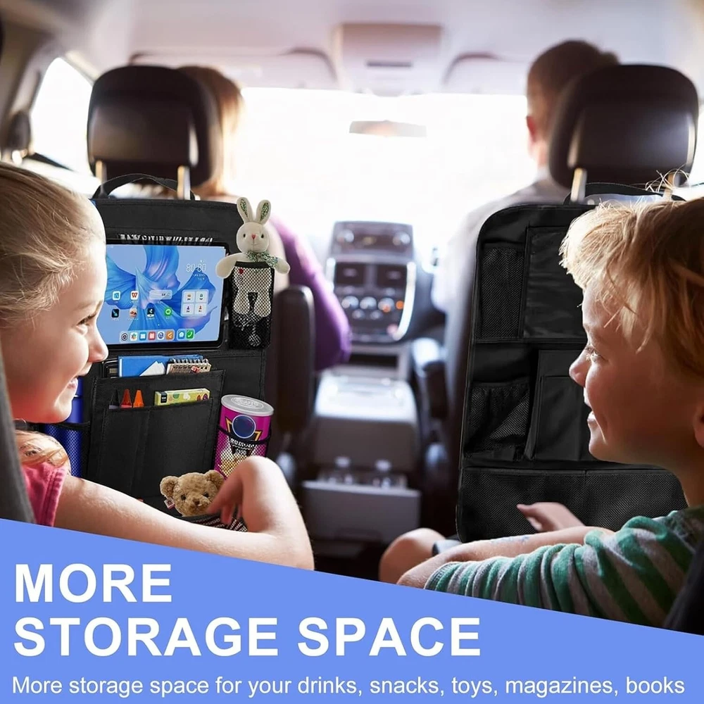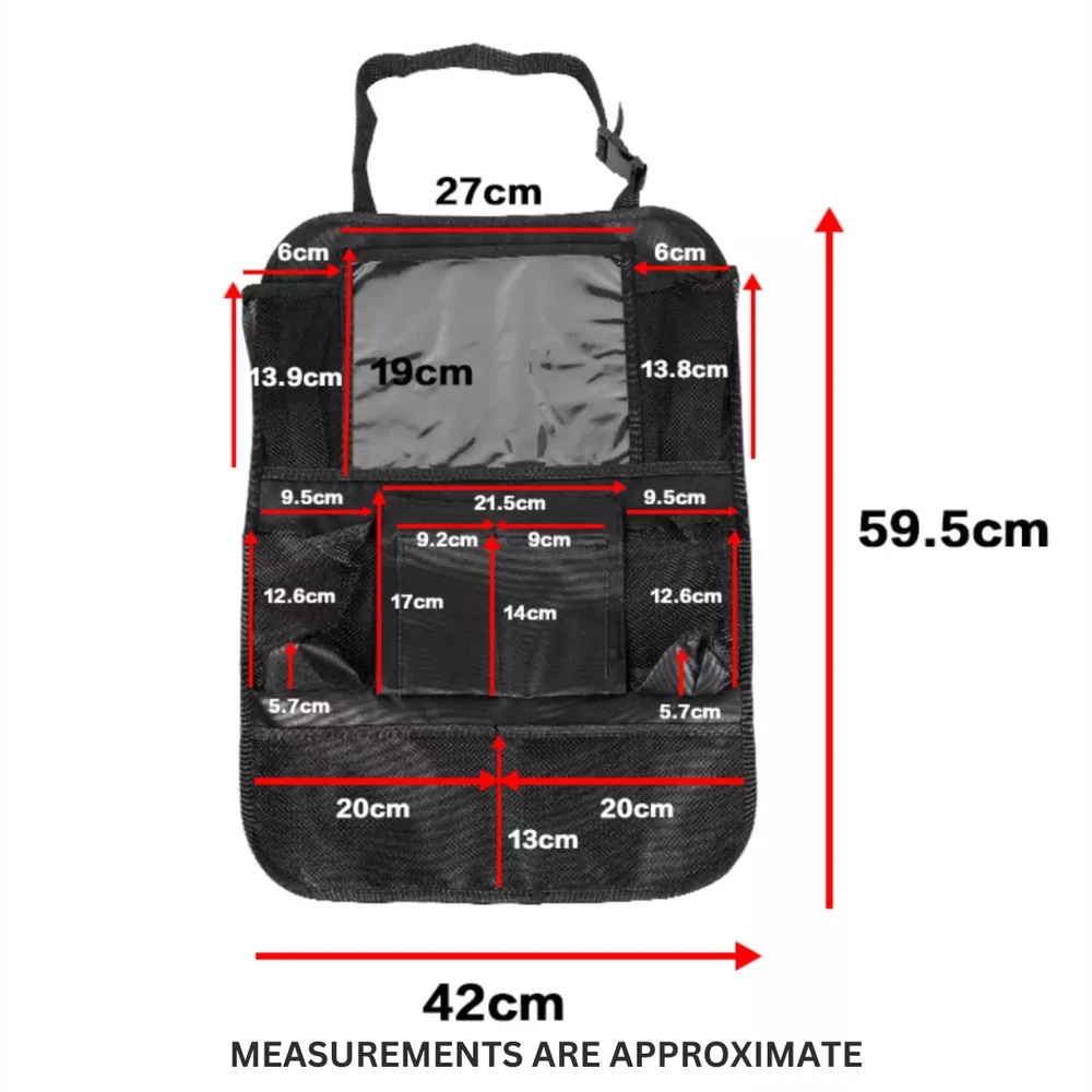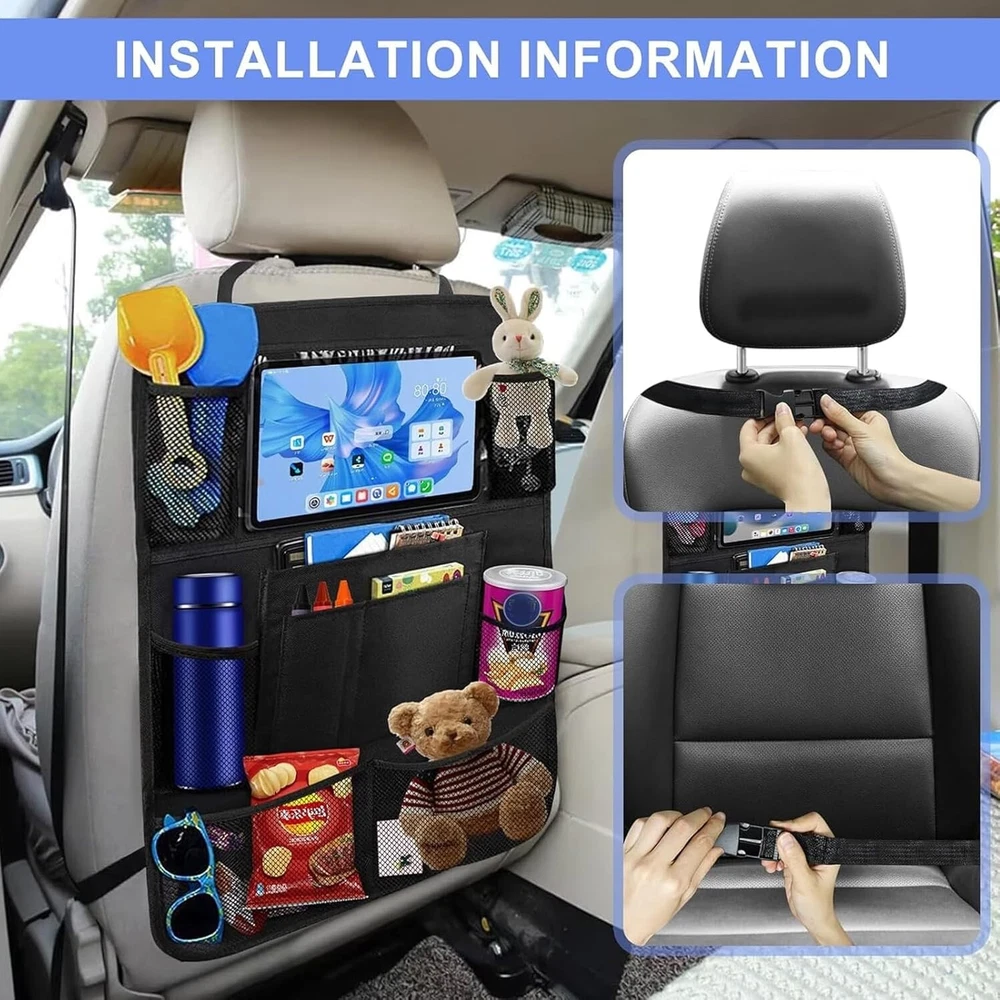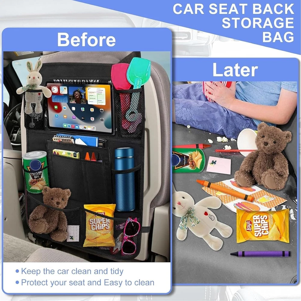 Description: • Protect your car from kids dirty footprints, scribble, scratches etc. • An useful storage pockets to keep your car tidy and neat. • A tablet holder to take your ipad or tablet for children entertainment. • An organizer to hold kids' books, toys, bottles and some other small items. Features: -Suitable for most of cars and SUV -Waterproof, easy to clean -Environmentally friendly materials, health and safety -Extra-long straps to ensure a perfect fit for any car -Six organizer pockets, enough space for storage -Support tablet up to 9.7" -Fits the entire back seat of most vehicles, measuring 24" Wide x16" Long -Fold able storage, saving space and easy to carry Specifications: Material: Oxford Fabric+PVC Colour: Black Size: 16x24 Inch Package Included: 2x Car Back Seat Organiser