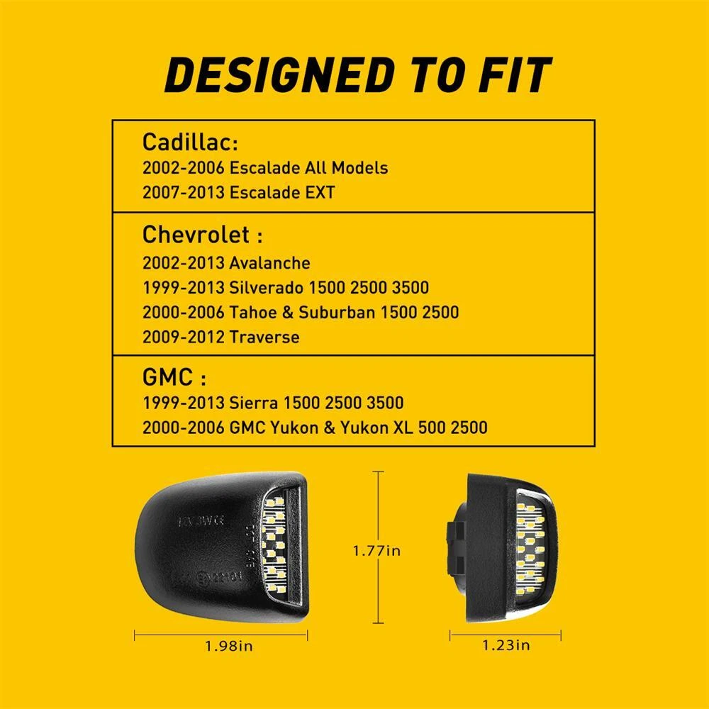 Package included: 2XLED License Plate Light Fitment: for 2002-2013 Chevy Avalanche for 1999-2013 Chevrolet Silverado 1500 for 1999-2013 Chevrolet Silverado 2500 for 1999-2013 Chevrolet Silverado 3500 for 2000-2006 Chevrolet Tahoe & Suburban 1500 2500 for 2009-2012 Chevrolet Traverse for 1999-2013 GMC Sierra 1500 2500 3500 for 2000-2006 GMC Yukon for 2000-2006 GMC Yukon XL 1500 for 2000-2006 GMC Yukon XL 2500 for 2002-2006 Cadillac Escalade (All Models) for 2007-2013 Cadillac Escalade EXT Description : 2X License LED Plate White Lights For 2000-06 Chevy Tahoe Suburban GMC Yukon XL Package included: 2XLED License Plate Light Fitment: for 2002-2013 Chevy Avalanche for 1999-2013 Chevrolet Silverado 1500 for 1999-2013 Chevrolet Silverado 2500 for 1999-2013 Chevrolet Silverado 3500 for 2000-2006 Chevrolet Tahoe & Suburban 1500 2500 for 2009-2012 Chevrolet Traverse for 1999-2013 GMC Sierra 1500 2500 3500 for 2000-2006 GMC Yukon for 2000-2006 GMC Yukon XL 1500 for 2000-2006 GMC Yukon XL 2500 for 2002-2006 Cadillac Escalade (All Models) for 2007-2013 Cadillac Escalade EXT Description : 1.Type:Full LED License Plate Light 2. Voltage: 12V 3. Size: 1.77*1.23*1.98in 4. Light Temperature: 6500K 5. Light Source: LED 6. Body Color: Black 7. LED Type: Built-in 18 SMD LED Light 8. Light Color: White 9. Material: ABS and Clear PC Lens Feature: 1. One pair full LED assemblies, powered by 18 pieces super bright xenon white LED diodes. 2. Directly replace and upgrade the factory original license plate lamp housing/lens and the 168 194 or 6418 C5W light bulb inside. 3. These all new super bright 3-watt high power LED license plate light assy are at least 3 times brighter than the factory ones, will give your car a modern and luxurious appearance with enhanced safety at night. 4. For a super bright spotlight on your rear license tag, try out our pair of LED license plate lights! ? How to install: Use a screwdriver to pry out the original license plate light. Unplug the plug behind the original license plate light directly. Plug the original car's line plug directly into the LED license plate light. Simply press the LED license plate light, simple and non-destructive modification. Note: 1. Please kindly confirm the fitment before ordering to make sure this item is perfectly fit. Please make confrim whether it can fit your car. 2. It is easy to install, but professional installation is always recommended. 3. Please allow 0.5-1 inch difference due to manual measurement.(1inch=2.54cm) 4. Due to the different display and different light, the picture may not reflect the actual color of the item. AUXITO 10x T10 White Light Specifications: AUXITO LED Light Bulb has specialized in LED lights for many years. Our mission is to produce high quality automotive LED light bulbs. We believe in our LEDs and offer warranty on item(s) confirm to be manufacturer defect. Socket:T10 194 168 192 2825 W5W Lamp beads: 2835SMD Input voltage: 12V-24V Product color temperature: 6000K. Product brightness: 240LM per light Life: 30,000 hours. Working environment: -40 °C ~ 105 °C Waterproof rating: IP65 Lifespan: 50000 working hours ,Adopt imported chips, stable quality, long service life Cross Reference: W5W 194 147 152 158 159 161 168 184 192 193 259 280 285 447 464 555 558 585 655 656 657 1250 1251 12522450 2652 2921 2825 906 579 Application: Interior Door Light Bulb / side Marker Light Bulb rear / front Tail Light Bulb Inner / License Light Bulb / Glove Box Light Bulb Stepwell light bulb / Trunk or Cargo Area Light Bulb/ Dome Light Bulb Check Engine Light Bulb / Courtesy Light Bulb / Parking Light Bulb Center High Mount Stop Light /Dome Light Bulb / Map Light Bulb Door Mirror illumnination light bulb Package Included: 10x LED Bulbs Item Specifics Features CANbus Compatible Bulb Fitment Code W5W (168) Manufacturer Warranty 2 year Fot for Cadillac, Chevrolet, GMC OE/OEM Part Number AUXITOLED Voltage 12V Fitment Type Direct Replacement Lighting Technology LED Suitable For License Plate Light Color Temperature 6000k white Light Color Cold White Number of Bulbs 2 Placement on Vehicle Rear, Left, Right Manufacturer Part Number Does Not Apply Brand AUXITO Type LED license plate light FAQ ♥ If you have a decoding problem or any other problems, please contact us first, we will help you with it. We will reply you within 24 hours in working days. I'm a new seller, thanks a lot for your trust and convince! I will serve you with all my heart. ♥ Q1: Will this bulb fit my vehicle? A: We can match almost any vehicle to one of our bulb sizes. eBay only lets us include some vehicle fitments per listing, but if your vehicle does not show up on the compatibility table at the top of our listings, welcome you to contact us for free consulation before purchasing a product. Q2: My item has not arrived, what's taking so long? A: Sometimes items take longer than expected, especially if it’s going far or to rural area. Check with your post office to see if your item has been held up. Sometimes Royal Mail will not update a tracking number until it has arrived at its destination. If your item still don't arrive after a few days, let us know so we can double check for you and help solve it asap. Q3: My bulbs won't fit, help! A: Special bulb holder may be required. See if you can take the holder from the stock bulb. If not, let us know. The bulb size may be wrong, double check the item you received with the item you ordered. Do you have an aftermarket lighting housing? These may not be perfectly fitted for aftermarket bulbs and will require some manual modifications. Q4: Neither side lighting up? Both sides flicker, hyper flash, or work inconsistantly. A:Check the light fuses, and then check the ballast plugs to insure correct installation. If this doesn't work, there may be a voltage problem with the vehicle. You probably just need a relay or capacitor. Even though some bulbs are builtin resistors, they may still need a decoder. Pay & Ship (1). We gladly accep