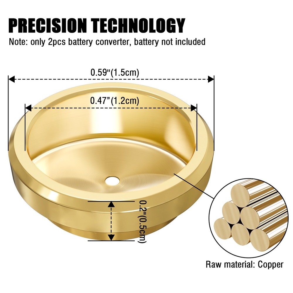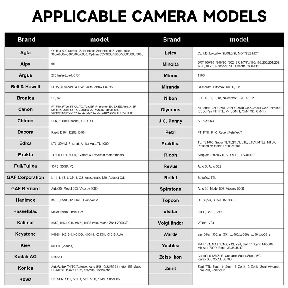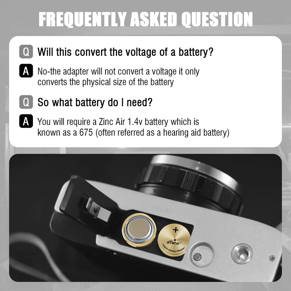 Brass Metal Battery Adapter LR44 to PX625,PX13,MR9 ,LR9,V625U,S62 5PX,MRB625 Description: 1.Made of high quality brass metal. 2.Battery Adapter for Film Camera Exposure Meter MR-9 PX625 PX13. 3.The adapter fits for LR44 or a 1.4v Zinc air battery. 4.The bottom is the positive electrode of the battery. Package Contents: 2pcs battery adapter( Battery is not included.) PX625 cameras The following cameras and finders were designed for and require a 1.35 volt cell: 625 mercury cell, an alternative cell of the correct voltage or an adapter. One cell per camera or finder unless indicated. The exposure meter in these cameras and finder require a 1.35 volt cell to be accurate, and some may require such a cell to work at all.