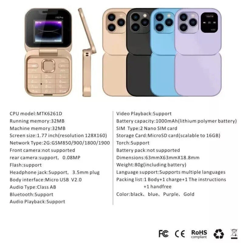 SAFE & SECURE SHOPPING 100% SATISFACTION GUARANTEED FAST SHIPPING For i16Pro Mini Unlocked Flip Mobile Phone 2 SIM Card Small Display Foldable New Product Description For i16Pro Mini Unlocked Flip Mobile Phone 2 SIM Card Small Display Foldable New Product Parameter: Model : i16 Pro Screen Size :1.77 inch HD Screen Phone Size : 63mmX63mmX18.8mm /118.3X63X12mm Phone Weight :80g (Including battery) Battery : 1000mAh Battery Phonebook : 500 Phone SMS: 90 Camera : Rear Camera SIM Card Quantity :2 Nano SIM card and 1TF card Memory Card : 32Mb RAM , 32Mb ROM , Maximum support 16GB expansion (The system will occupy part of the memory,It is recommended to install a memory card before using the phone) Charging Interface Type :Micro USB V2.0 Network 2G : GSM850/900/1800/1900 Features: Dual SIM Card Simultaneous use of 2 nano SIM cards and 1 TF card. Easy to answer phone calls Foldable Phone It is only the size of powder when folded. Fashionable item that easily fits into your pocket Rear HD Camera Rear mounted high-definition camera. Convenient recording of the beauty life whether videos or photos LED Flashlight Power saving, and strong brightness. Long press the middle button to quickly turn on About Us Payment Shipping Returns Contact Us About Us If you have any questions, then kindly please contact us via the ‘ Ask a question ’ Tab which is located on the bottom of the listing page. Thank you for shopping with us and we hope to see you soon! Payment After Auction Close, You can Go ahead and Checkout with Ebay System, We Do not Offer Combine Shipping Payment . We accept Paypal only. We only ship to the delivery address in your Paypal payment, please ensure that the shipping address and phone number on your paypal payment is correct. If you have any change for address, please inform us in paypal note or send an email before shipping. Payment must be fulfilled within 7 days since auction's ending. All non-paying bidders will receive an unpaid reminder from eBay. Shipping Once we have received cleared full payment, your items will be dispatched in 3-5 days. If your shipment delays, we hope you can be patient, and at the same time contact us, we will try our best to help you. Our price DOES NOT include Import duties / Tax. It is buyer's responsibility for it Returns If any item is defective upon receipt or do not work, please contact us for the return address, return is accepted within 30 or 60 days after the buyer receiving the item. Returned item has to be in its original condition. Buyer is responsible for return shipping costs . After receiving the return we will make a replacement depends on our available stock, if not available, a refund will be issued. Contact Us Working Time: 9:00AM-6:30PM (GMT+08\China) From Monday -Saturday, If There is any holiday, please see the notice we send out thanks. Please take free to contact us if have any questions. Copyright © 2022 Tongtool