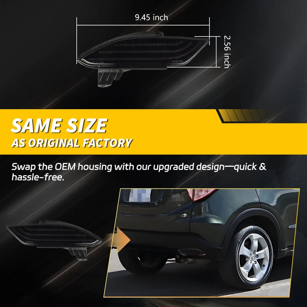 Product Detail Copyright©MotoringPlus Details This page features One Pair (2 Pieces) Smoked / Tinted Lens Sequential red LED Rear Bumper Tail Reflectors Light Kit For 2016-2022 Honda HR-V These reflectors are made with high-quality Polymethy l Methacrylate (PMMA) and Polycarbonate (PC) plastics 50% Brighter red LED lighting for tail light; 100% Brighter red LED lighting for brake light; Sequential red LED lighting for signal light Give your ride upgraded LED rear bumper lights with an unique and modern look as well as increased safety, visibility, and style at night! Specifications: 100% Brand new and quality Lens Color: Smoked / Tinted LED Color: Red Voltage: 12-24V DC; Power: 4W A complete set of two LED rear reflector lights, replacement for the driver side & passenger sides Compatible With 2016-2022 Honda HR-V Directly replace or repair your car's rear bumper reflectors with red LED strips CE DOT SAE approved Application: For 2016 2017 2018 2019 2020 2021 2022 Honda HR-V Replace OEM # 33505T7SA01, HO1185109, 33555T7SA01, HO1184109 Please make sure you have available space in your car for these reflectors to fit before placing or der. Package include: 2PCS Driver & Passenger side rear bumper LED reflector Lights (Smoked / Tinted Lens) Installation: To install these LED bumper reflectors, you simply need to access to the back of the rear bumper, push to remove the stock bumper reflectors and directly replace back with these LED reflectors and then tap the wires accordingly. Connect black wire to brake light negative, white wire to tail lights positive, yellow wire to signal light positive and red wire to brake light positive. Note: Professional installation is highly recommended! Returns Policy Shipping Policy Payment Method About US Contact Us Returns Policy Please check actual stock bulb model & housing size before purchasing replacement bulbs. Compatibility list on eBay listing is not a complete list and it is a known issue that there are errors on it. Half year warranty from the purchased date. Please contact us via ebay message before returning the defectived item. Our warranty does not extended to any products that are physically damaged or that are not under normal operating conditions as a result of misuse or improper installation on the buyers/user's part. Return items should include the original packaging and all accessories. Buyers MUST contact us for the returning address. In all cases, buyers pay shipping fees at their own cost to return products for exchange or refund. We will be responsible for the postage of replacements. Refund will be made upon receipt of the returned item. Our goal is to make sure you are a happy buyer and pleasant shopping with us. If you have any problems, please contact us immediately before leaving us any negative or neutral feedback. We understand the concerns and frustrations you might have, and will do our endeavor to resolve the issues. Please give us the opportunity to resolve any problem. Shipping Policy Item will be shipped from China / Hongkong Post by Standard International Post. All orders will be shipped to buyer's paypal shipping address within 24 hours after receiving your verified payment (Excluding Weekends and Public Holidays) International order may takes about 15-25 business day delivery time for most countries. Transactions on weekends or public holidays,item will be sent later on work time. Payment Method We accept Paypal ONLY. Unpaid transaction will be cancelled after 8 days About US Contact Us We are dedicated to providing you the best shopping experience and high quality items at a very low price. If you are satisfied with our service,Please remember to leave us 5 STAR for All Detailed Seller Ratings If you found any problem/issue of our merchandise/service,please let us know before leaving any negative feedback! Please feel free to contact us if you have any question. Any message will be replied within 24 hours. We will try our best to help! Home Payment Shipping About us Contact us Copyright©MotoringPlus Home Payment Shipping About us Contact us Store Categories Store Categories SIDE MARKER LIGHT TURN SIGNAL LIGHT TAIL BRAKE LIGHT LICENSE PLATE LIGHT DECODER OTHERS Other Product Detail Copyright©OFFKAT Why Buy From Us Why Buy From Us Details This page features One Pair (2 Pieces) Smoked / Tinted Lens Sequential red LED Rear Bumper Tail Reflectors Light Kit For 2016-2022 Honda HR-V These reflectors are made with high-quality Polymethy l Methacrylate (PMMA) and Polycarbonate (PC) plastics 50% Brighter red LED lighting for tail light; 100% Brighter red LED lighting for brake light; Sequential red LED lighting for signal light Give your ride upgraded LED rear bumper lights with an unique and modern look as well as increased safety, visibility, and style at night! Specifications: 100% Brand new and quality Lens Color: Smoked / Tinted LED Color: Red Voltage: 12-24V DC; Power: 4W A complete set of two LED rear reflector lights, replacement for the driver side & passenger sides Compatible With 2016-2022 Honda HR-V Directly replace or repair your car's rear bumper reflectors with red LED strips CE DOT SAE approved Application: For 2016 2017 2018 2019 2020 2021 2022 Honda HR-V Replace OEM # 33505T7SA01, HO1185109, 33555T7SA01, HO1184109 Please make sure you have available space in your car for these reflectors to fit before placing or der. Package include: 2PCS Driver & Passenger side rear bumper LED reflector Lights (Smoked / Tinted Lens) Installation: To install these LED bumper reflectors, you simply need to access to the back of the rear bumper, push to remove the stock bumper reflectors and directly replace back with these LED reflectors and then tap the wires accordingly. Connect black wire to brake light negative, white wire to tail lights positive, yellow wire to signal light positive and red wire to brake light positive. Note: Professional installation is highly recommended! Returns Policy Shipping Policy Payment Metho