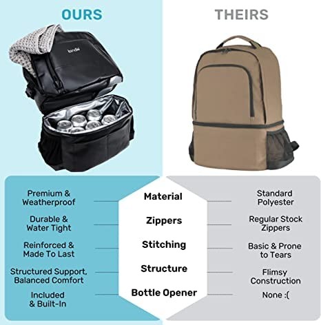 2-IN-1 BACKPACK WITH COOLER Make your outdoor adventures, beach time, festivals, concerts, and even work, a bit more enjoyable with the Backpack With Cooler Compartment. Designed to deliver rigidness, large storage space, and practical use with number of handy features, it's the insulated cooler backpack that'll make your moments of leisure more delightful. ► Large Storage Space Have peace of mind knowing that this backpack cooler for men and women has large storage space to store all your essentials. The 18l capacity upper pack gives you enough space to bring your everyday items along for the ride. Not only that, but the lunch box backpack also features a front zipper pocket that can easily store keys, cell phone, and other essentials. For all your food and drinks, you can use the backpack lunch box 12L insulated cooler. Meaning you are set to eat delicious food and enjoy fresh drinks anywhere, anytime. ► Premium Design That Lasts Our cooler lunchbox backpack for men and women is specifically crafted with weather-resistant outer shell and superior stitching so it withstands the expected wear and tear. Even in harsh weather conditions. We use rugged materials and heavy duty zippers, handle, buckles that were subjected to variety of tests for quality and rigidness. The result is a 2-in-1 backpack cooler for women and men that you can use daily for years to come. ► More Reasons to Love Your Insulated Beach Bag with Cooler: ● easily open your glass bottles with the in-built bottle opener ● carry blankets, balls, and other gear with the 4 side nylon buckles of the insulated backpack cooler ● store bottles, umbrellas in similar gear in the side outside pockets ● enjoy balanced comfort with the thick shoulder straps (includes stabilizer strap with buckle too), backpack handle, and added ventilation for longer treks ● Lightweight construction - just 2.4lbs. CONQUER THE OUTDOORS: Feel at your very best refreshed and with all your things right beside you with the 2-in1 backpack cooler. Featuring 18L High-Capacity Upper Pack and 12L Insulated Cooler (stashes up to 12 cans), this backpack with built in cooler is sure to store all your drinks, food, gear, accessories, clothes for all your adventures at the beach, light hikes, picnics, camping, bike rides, and more. RIGIDNESS YOU CAN COUNT ON: Rest assured knowing that the 2 in 1 backpack is designed with outer shell and weather-resistant materials to withstand the weight, wear and tear, as well as harsh weather conditions. But the durable material and superior stitching doesn't mean we sacrificed weight and compactness. Our cooler backpacks for men and women are still just 2.4 lbs with dimensions of 18"(Height)x12.5"(Width)x8"(Depth). EASY STORAGE & ACCESS: Enjoy simple and practical use whenever you use the picnic insulated backpack. With 4x Side Buckles, 2x Side Pockets, 2x Large Compartments, 4x Pockets there is enough room to organize all your accessories, gear, and clothes. You can use the zipper pockets of the fridge backpack for your keys, phone, wallet; the buckles for your blankets; the net side compartments for bottles; and so on. BUILT-IN BOTTLE OPENER: Unlike most backpack cooler insulated black designs, insulated cooler bookbag features an in-built bottle opener so you can enjoy your favorite drinks, such as an ice-cold beer, right from glass bottles. Additionally, the Cooler Backpack for Men & Women features a stabilizer strap with buckle for balanced comfort and added ventilation for the longer treks. QUALITY YOU CAN TRUST: Like all products, this cooler back pack was subjected to extensive tests for quality and durability. All our backpack coolers for women and men are crafted to perfection with balanced comfort that will help you carry everything that makes you happy. A great beach bag, hiking backpack, or travel backpack. Anywhere, anytime!