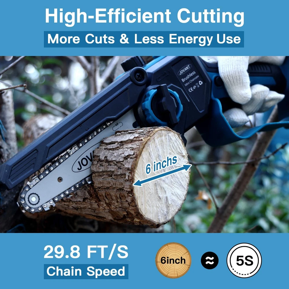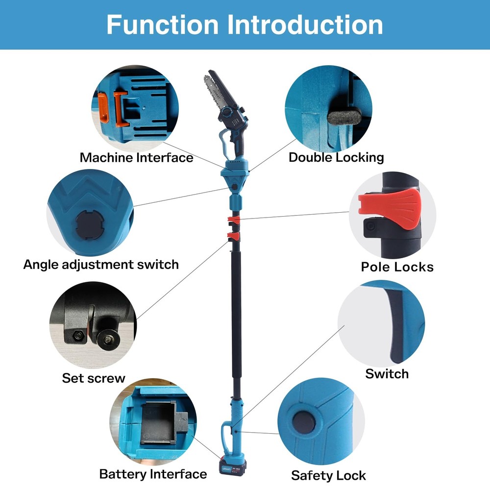 2-in-1 Pole Saw combines a mini chainsaw and a telescopic pole to provide a versatile tool for gardening. The mini chainsaw cordless can be used for low-position work, while the telescopic pole can be used in hard-to-reach high-position areas. When you encounter a hard-to-reach branch, but for safety reasons, don't want to risk climbing a ladder, you deserve to have this pole saws for tree trimming. Telescoping pole extends from 5.3 ft. to 9.3 ft. for up to 15 ft overhead reach(based on a 6-foot user holding the pole). This combination kit offers excellent cutting power and high efficiency, which helps you handle almost all plants in your gardens, yards, parks, farms, large pastures, orchards, greenhouses and can be used for cutting bamboos, bushes, crepe myrtles, cypress trees, pepper trees, palm fronds, wood logs, trees limbs, bonsai trunks, tree stumps, vines, oaks, camphor trees, deciduous trees, fruit trees, etc. 【2-IN-1 Design 】2-in-1 pole saw include a electric chainsaw and a telescopic pole to provide a versatile tool for gardening. The chainsaw can be used for low-position work, while electric pole saw can be used in hard-to-reach high-position areas. Note that the product weighs 6.6 pounds with the pole attached, making it more suitable for individuals with greater physical strength. 【Extends Up To 15-Feet Height】When you encounter branches that are difficult to reach, but for safety reasons, you don't want to take the risk of climbing the ladder, you deserve to have this pole saw for tree trimming. Telescoping pole extends from 5.3 ft. to 9.3 ft. for up to 15 ft overhead reach(based on a 6-foot user holding the pole) 【2 Pack 4000mAH Large Capacity Battery】20V 4.0Ah battery can be used for battery powered chainsaw. After being fully charged, it can work continuously for 8-10 hours.You don't have to worry about running out of electricity all day outdoors! The rechargeable battery with self-overload and temperature protection provide a much longer battery life. 【6 inch Mini Chainsaw】Electric chainsaw is equipped with high-powered bruless motors,29.8 ft/sec ultra-high chain speed takes only about 5 seconds to cut a 6" diameter log. It is equipped with upgraded external refueling device, Just pour the lubricant into the oil tank and then you can freely lubricate the chain. Chainsaw Oil is available on the market, or search for ASIN: B0D6DZJZKG 【Wide Applications】Cordless pole saw have excellent efficiency, which help you cutting almost all plants in your garden, yard, park, farm and greenhouses. Electric chainsaw can be used for crepe myrtles, cypress trees, pepper trees, palm fronds, trees limbs, bonsai trunks, vines, fruit trees, etc 【Package Include & Warranty】6 inch mini chainsaw x 1, telescopic extension pole x1, 4.0Ah battery pack x2, chain ×3 (1 has been mounted on the chainsaw), chain plate ×2(1 has been mounted on the chainsaw), Quick charger ×1, guide plate cover×1, chain protectio cover×1, chain filing×1, storage bagx1.User manual×1. All items are packed in the portable storage bag, suitable for fields. We offer a 12 month warranty. If you have any questions, please contact us