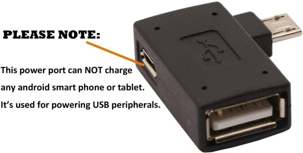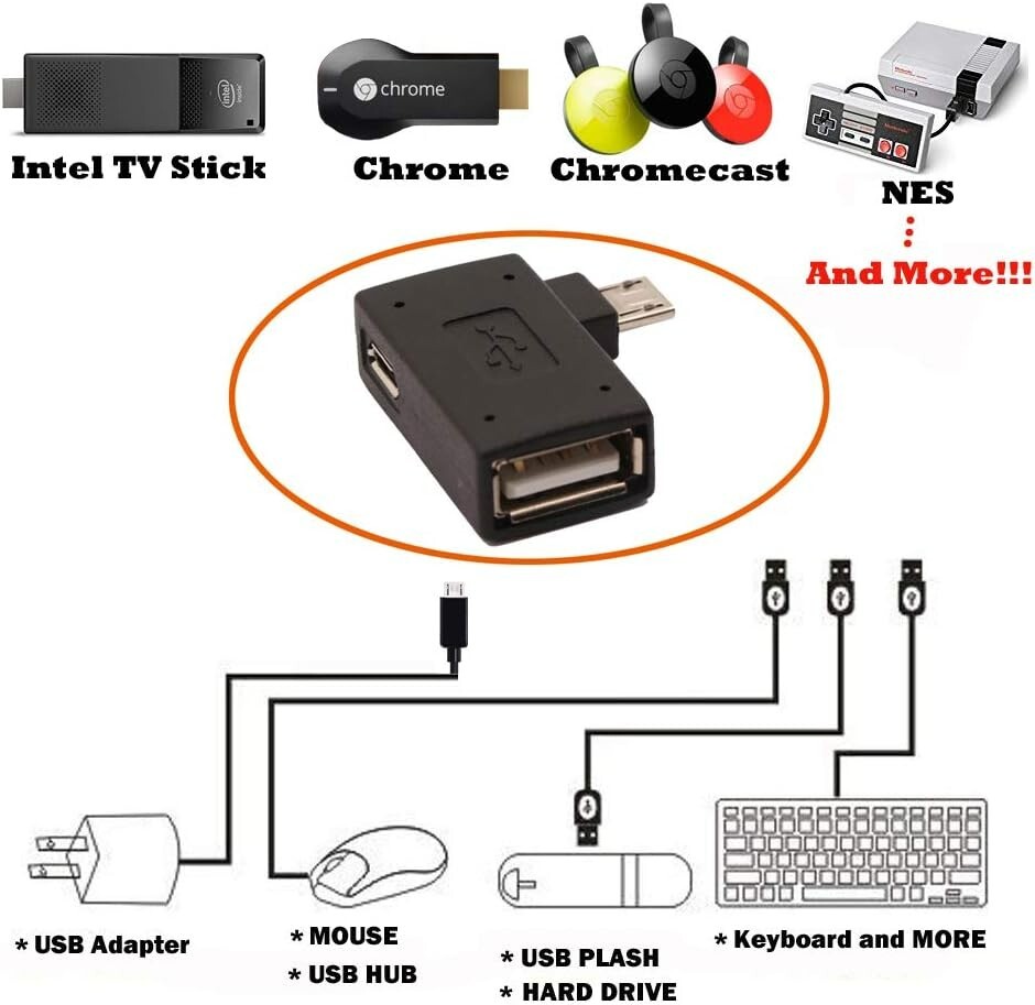 2-in-1 Powered Micro USB to USB OTG Adapter 90 Degree Right Angled for FireStick, S/NES Classic Mini, Sega Genesis and More - 2 Pack π Specially designed for adding any USB peripherals to your host devices, Suitable for Android, Windows and other systems, no system restrictions. π Expansion Capability - Add on any USB peripherals such as keyboards, mouse, flash drives, external hard drives, USB card readers, USB ethernet adapter, game controllers or whatever to your Host devices with the 2-in-1 OTG Adapter. π Provide power for USB peripherals so that the battery of your android smart or tablet will not be drained so quickly like others ordinary OTG cable. Note: It can not power your android smart or tablet itself. π Plug and play - Simply connect the micro USB male port to your host devices and the micro USB female port to your usb power cable, then it is ready to go. Set it up in minutes without any extra effort or configuration. π 24/7 customer service, add to cart & get 2-in-1 Micro USB OTG Adapter Now! NOTE: Please make sure that your devices support OTG function before you place an order! 2-in-1 Powered OTG Adapter provides an all-new solution for your host devices to connecting any USB peripherals such as keyboards, mouse, flash drives, external hard drives, HDD, SSD, USB card readers, USB ethernet adapter, game controllers or whatever to enjoy more fun. Suitable for Android, Windows and other systems, no system restrictions. Matters Need Attention: It can NOT charge any or does NOT work with PlayStation Classic or Roku devices. So why we still have to choose ? Because the can not only support OTG function for your Android Smart or Tablet, But also it can provide power for any USB peripheral devices which attached to your Android devices so that the battery of your Android devices will not be drained so quickly when compared to others ordinary OTG cable. Besides, we can also connect HDD, SSD to our android or tablet now with the powered OTG adapter. WHAT'S MORE, the can provide both Power and OTG simultaneously for your Streaming TV Stick, Chromecast, Raspberry Pi Zero, Sega Genesis Mini, S/NES Classic Mini, Google home mini. Package Included: 2 x Right Angled OTG Adapter