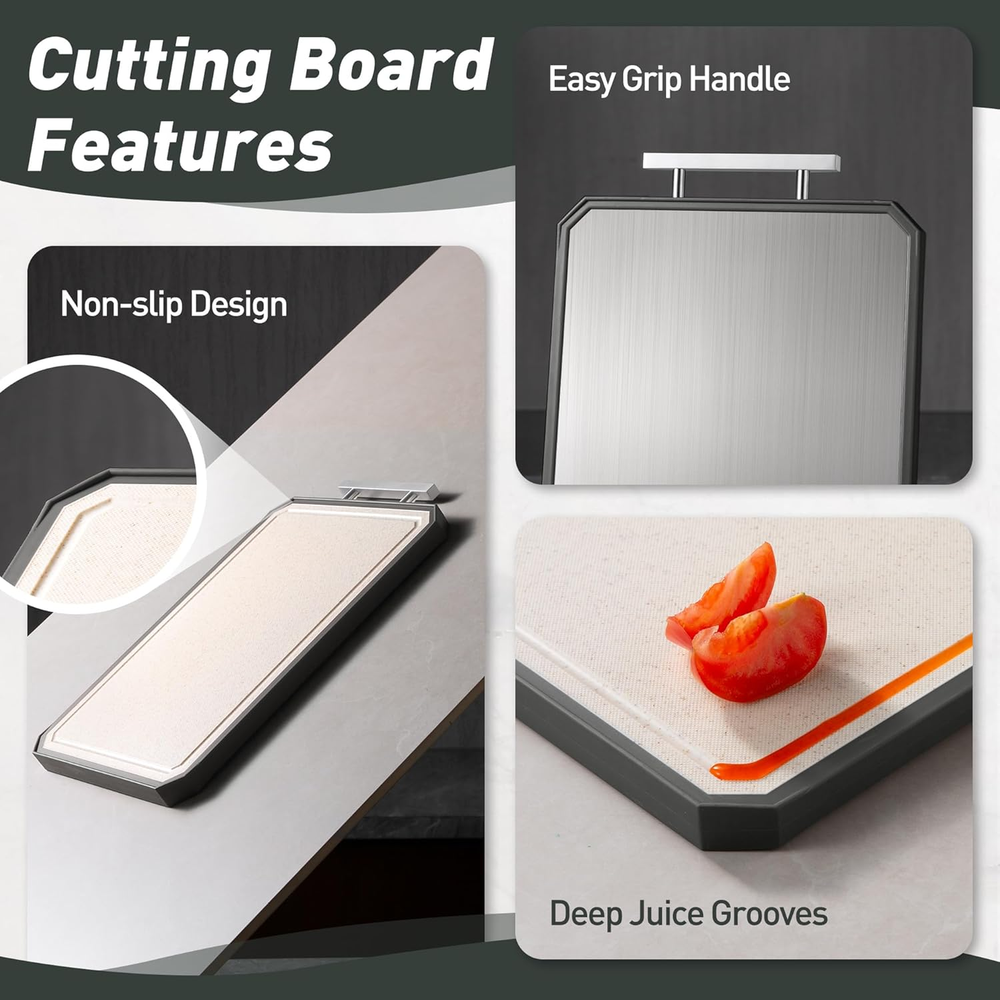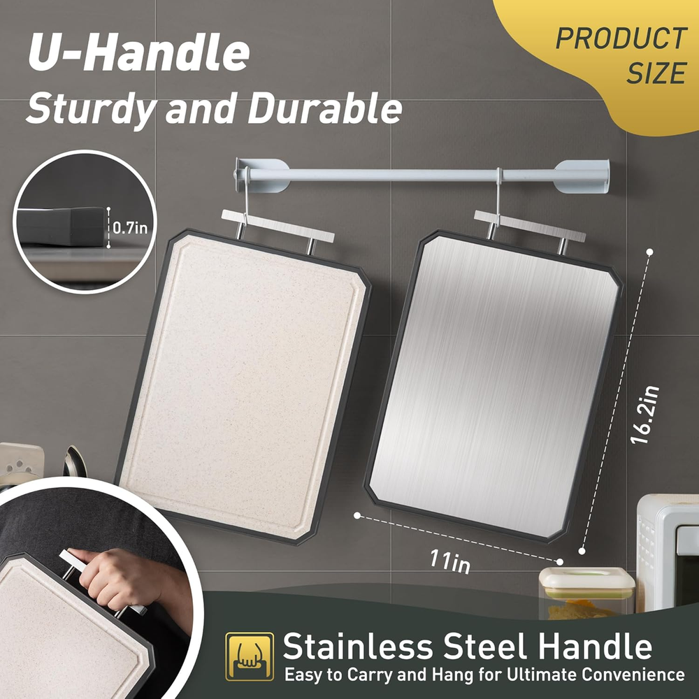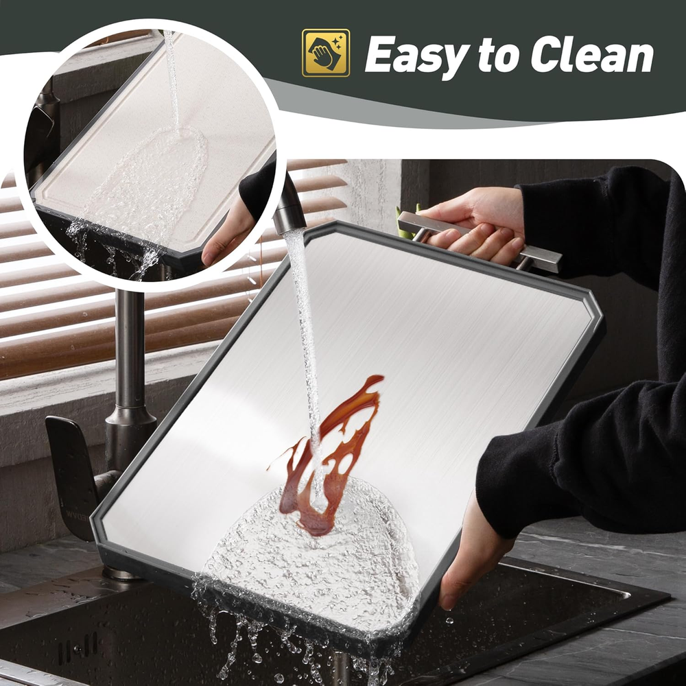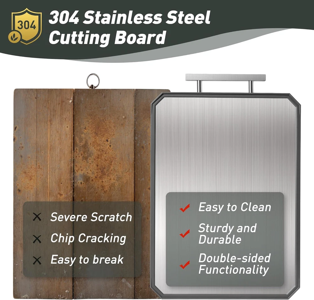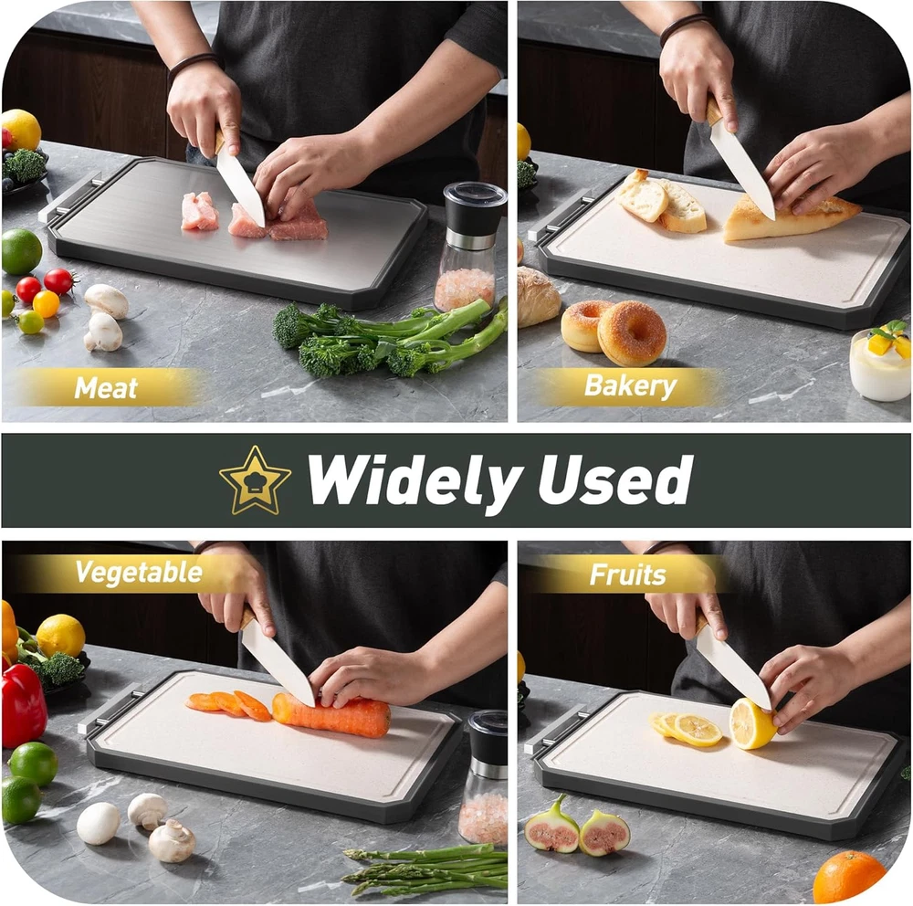 Dual-Sided Cutting for Versatile Use:The Socisen cutting boards for kitchen features a stainless steel side for slicing meats and a PP side for fruits and vegetables. This dual-sided design ensures food safety and versatility, letting you handle different ingredients efficiently. Perfect for everyday cooking, this cutting board providing a durable and practical cutting solution for your kitchen needs. Good Design:The unique U-shaped handle, combining sleek aesthetics with ergonomic design, offers a comfortable and secure grip, making it easy to carry around the kitchen or take along for outdoor cooking. The built - in juice groove is a practical addition, efficiently catching the juices from meats, fruits, and vegetables, thus keeping your kitchen countertops clean. Complemented by non - slip mats on all four sides, the cutting board ensures stability during use. Durable & Food-Safe Materials: The Socisen cutting board features 304 stainless steel on one side and food-grade PP on the other, ensuring durability and safety. This dual-sided cutting board is BPA-free, making it safe for direct food contact. Perfect for slicing meats or chopping fruits and vegetables, its sturdy construction resists wear and tear, providing a reliable, long-lasting solution for all your kitchen tasks. Easy to Clean & Dishwasher Safe:The Socisen stainless steel cutting board is designed with non-stick surfaces, allowing for easy cleaning by simply rinsing with water and wiping dry. The cutting board is also dishwasher safe. We suggest using Quick Wash, Gentle Wash, or Normal Wash cycles for optimal results. Our cutting board's easy - clean features make it a great kitchen essential. Ideal Gift for Any Occasion: With its stylish design and elegant packaging, the Socisen stainless steel cutting boards for kitchen makes a thoughtful gift for Thanksgiving Day, Christmas, Mother's Day, Father's Day, birthday, anniversary, or housewarming event.And this cutting board can be used in the office or camping. Its versatile functionality and durable build appeal to anyone who loves cooking. Whether for a professional chef or a home cook, it’s a practical gift they’ll use every day. Product Description The video showcases the product in use. The video guides you through product setup. The video compares multiple products. The video shows the product being unpacked. Socisen Double-sided Cutting Board Merchant Video 1 Grip Handle 2 Hygienic Design 3 Non-Slip Design 4 Deep Juice Groove 5 Easy to Clean What materials are used in this stainless steel cutting board? Are they safe for food preparation? The non toxic cutting board features a dual-sided design: one side is made of food-grade 304 stainless steel, and the other side is crafted from wheat straw polypropylene (PP). How should I properly use each side of the double-sided cutting board? The stainless steel side is great for meats and easy to clean. The wheat straw side is ideal for fruits and veggies, and features a juice groove to help reduce mess on your countertop. Does the cutting board have features to prevent slipping during use? Yes, the 2 sided cutting boards for kitchen is designed with anti-slip rubber-wrapped edges and bottom, reducing noise and ensuring stability during use. This feature helps prevent the board from moving on the countertop while cutting. Can the stainless steel side be used as a defrosting tray? Yes, the 304 stainless steel side has good thermal conductivity, allowing it to function effectively as a defrosting tray for frozen foods, facilitating quicker thawing. Can I use this board for serving food as well? Absolutely! Its sleek, modern design and dual textures make it suitable for light serving — such as placing bread, cheese, or fruit. Just be sure to wash thoroughly between uses if switching between raw prep and serving. Socisen OTHER PRODUCTS! Add to Cart Add to Cart Add to Cart Add to Cart Add to Cart Add to Cart Add to Cart Customer Reviews 4.4 out of 5 stars 53 4.4 out of 5 stars 53 4.4 out of 5 stars 53 4.4 out of 5 stars 53 4.7 out of 5 stars 146 4.7 out of 5 stars 146 4.7 out of 5 stars 146 Price $18.99 $ 18 . 99 $28.49 $ 28 . 49 $29.99 $ 29 . 99 $28.49 $ 28 . 49 $23.99 $ 23 . 99 $35.99 $ 35 . 99 $45.99 $ 45 . 99 Quantity 1 1 1 1 1 1 2 Size 16.2"L x 11"W 16.2"L x 11"W 16.2"L x 11"W 16.2"L x 11"W 16"L x 11"W 16"L x 11"W 16"L x 11"W+18"L x 12"W Food Grade ✔ ✔ ✔ ✔ ✔ ✔ ✔ Easy to Clean ✔ ✔ ✔ ✔ ✔ ✔ ✔ Multiple Options ✔ ✔ ✔ ✔ ✔ ✔ ✔