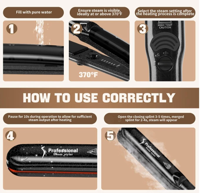 2-In-1 Professional Steam Flat Iron Hair Straightener Styler Ceramic Tourmaline HOW TO USE: Open the splint and adjust the temperature. We recommend using the medium steam gear with temperature range from 340℉ to 370℉, or the high steam gear with temperature range from 410℉ to 430℉ for better results. The higher the temperature, the longer the heating time (30-130 seconds/6 speeds selectable). The indicator lights stop flashing, showing that the heating is complete. Turn on the steam gear, open and fuse the splint, steam will appear. NEW STEAM TECHNOLOGY: Compared with traditional hair straightener, our item adopts the latest steam technology. 5 conditioning steam outlets, steam water adds moisture and shine to hair, making it healthier and safer. Conditioning steam settings OFF/MED/HIGH. For your safety, please do not touch the splint while it is working and keep it away from children. CERAMIC TOURMALINE PLATE: 1 1/4 inch even and stable heating plate, heats up in 1 minute. Ceramic coating plate provides a shiny and healthy finish, reduces hair loss and damage. Note: The steam is not as strong as the steam in the picture, so it is heavy or obvious to see with the naked eye. (Visual effect of the picture) 2 IN 1 STRAIGHTENING AND CURLING: Save time with 2 IN 1 design (straightening and curling) and two ways of use. 3D floating plates to straighten and curl hair to perfection. You can use the Styler as a regular flat iron without steam by turning off the steam function or use the styler with pure water steam. Note: Please keep the container filled with pure water and do not use other liquids, such as oil. ADJUSTABLE TEMPERATURE & PERFECT DESIGN: Digital LED display with adjustable modes of 6 different temperature settings (150-235℃/302-455℉) can meet your different needs from fragile to thick hair. Auto shut-off 60 minutes; 360° swivel cord; Cool tip end. Worldwide dual voltage 110V-240V and lockable plates (lock switch) for storage and travel. Anti-static and anti-scald hair straightener. UPGRADE 2.0: The premium ceramic straightening iron features a sleek design with glitter accents, evoking the captivating beauty of celestial stars. Effortlessly style your hair with enhanced smoothness, ideal for both straightening and curling. Upgraded PTC system ensures stable heating plates for consistent performance and long-lasting results. Indulge in a 20% increase in steam volume, while reducing hair damage by 80%, ensuring optimal hydration for a vibrant, healthy look. SHIPPING: We offer FREE shipping on all orders! We ship within Three business days of payment, usually sooner. We use a selection of shipping services such as UPS, FedEx, USPS etc. We only ship to the lower 48 states, no APO/FPO addresses or PO Boxes allowed. Local pickups and combined shipping options are not provided at this time. PAYMENT: We accept payment by any of the following methods: PayPal Please pay as soon as possible after winning an auction, as that will allow us to post your item to you sooner! FEEDBACK: Customer satisfaction is very important to us. If you have any problem with your order, please contact us and we will do our best to make you satisfied. Thank you for shopping with us!