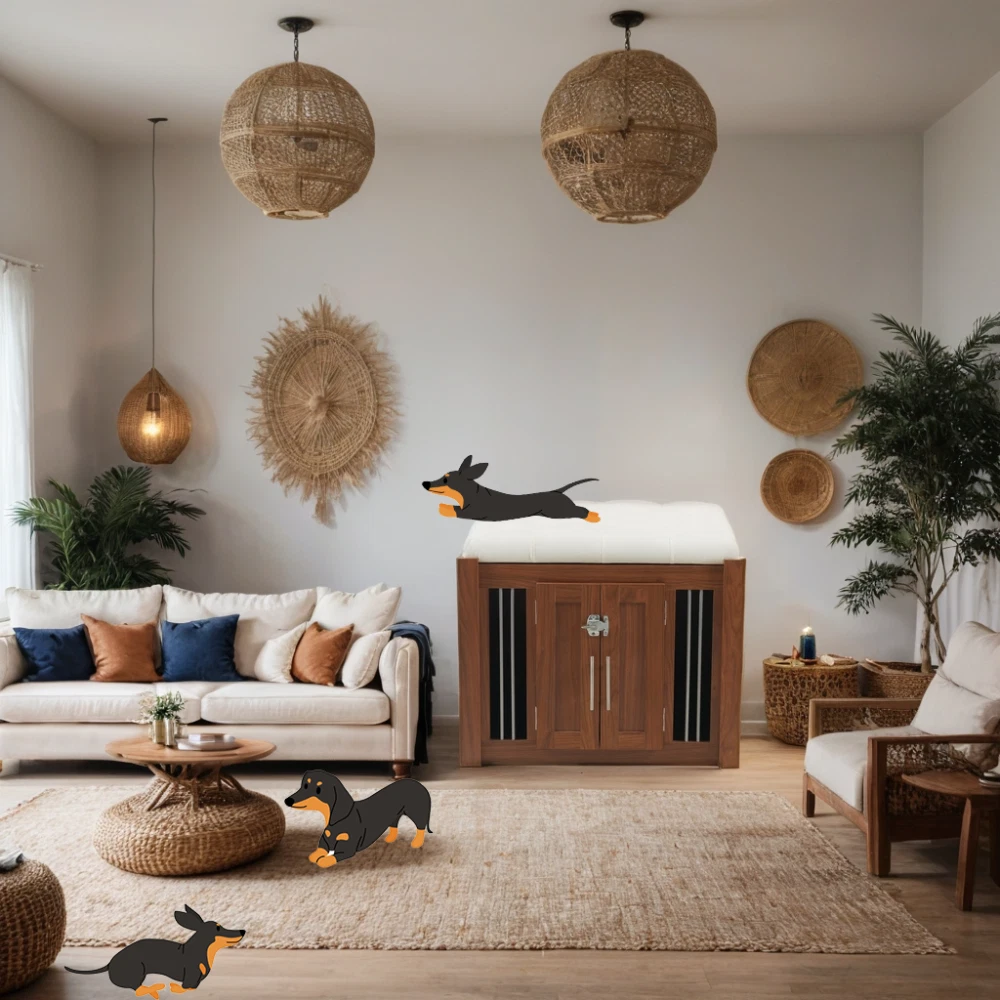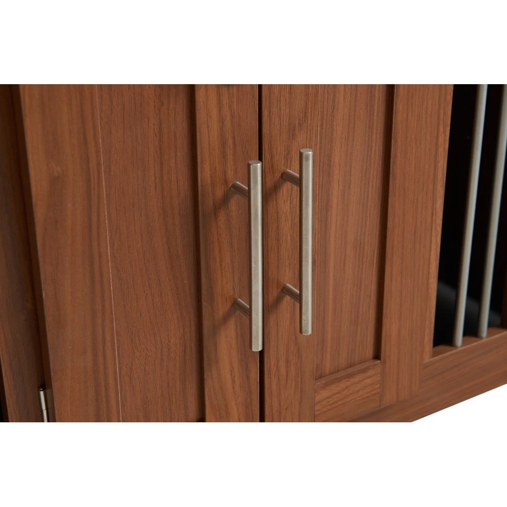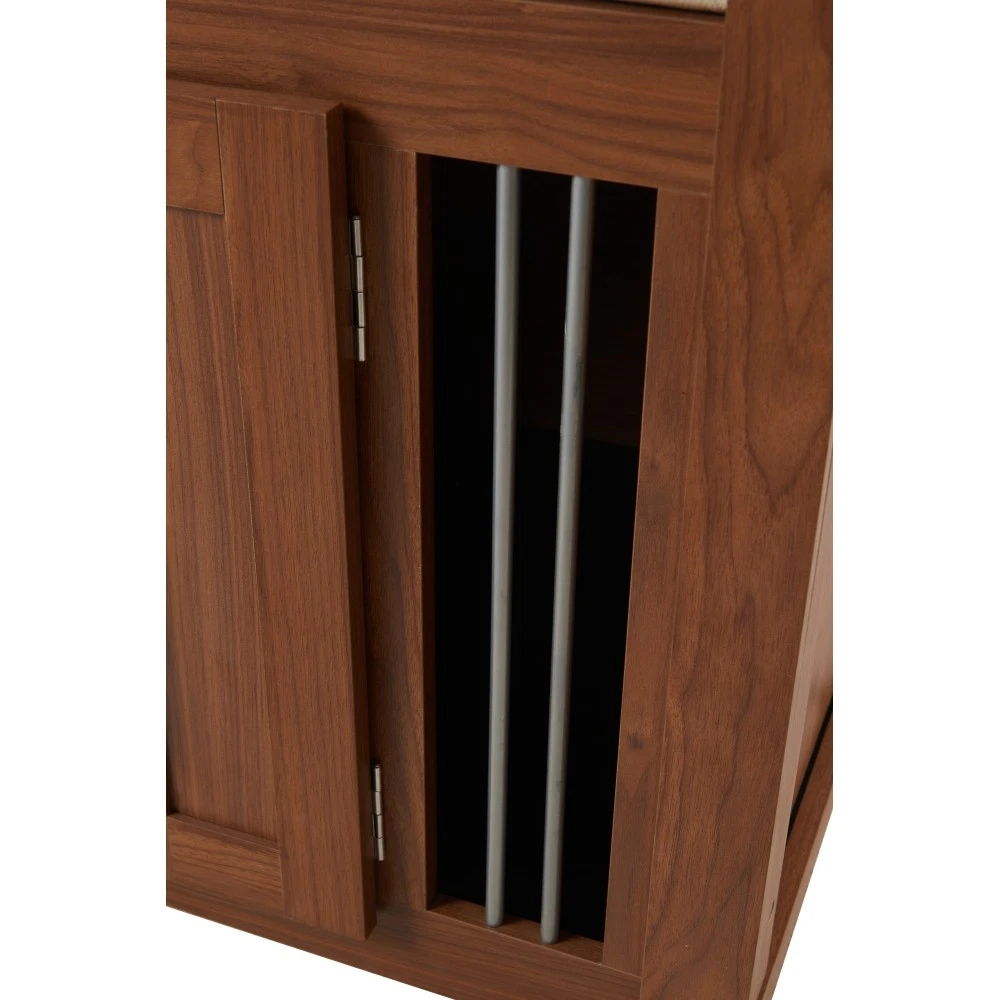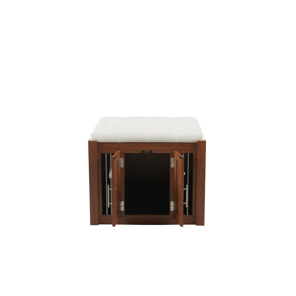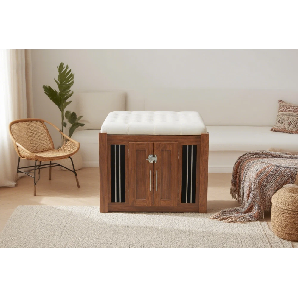 MULTI-USAGE AND VINTAGE DESIGN: Our multi-functional dog crate end-bench combines elegance and practicality. This unique piece of furniture doubles as a comfortable seating area and a secure pet space, effectively utilizing your living area. COMFY AND ROBUST SEATING: This wooden dog ottoman comes equipped with a high quality easy clean cushion, offering a comfortable seating option. Whether you're taking a break or putting on your shoes, this sturdy structure can handle up to 300 lbs, promising durability. DURABLE METAL AND DESIGNED LOCKER: This Pet Friendly ottoman features specially designed style buckles and sturdy, durable metal components that make it easy and safe for both you and your pet to use. MOVABLE BASE WITH WHEELS: This product is equipped with a movable base featuring wheels, providing convenient functionality and making it easier to clean and maintain. ROOMY AND SAFE: The bench dog ottoman measures 30.25"L x 25.1"W x 25"H, providing ample internal space of 28.9"L x 22.6"W, suitable for small to medium dogs. It features a designed sturdy vintage door with black metal locks and handles, ensuring easy access and safety for your pet. The steel bars offer excellent ventilation and visibility, making a comfy space for your pet. EASY UPKEEP: This dog crate bench design prioritizes your convenience. With a removable cushion and easily accessible doors, cleaning and maintenance are effortless, promoting a clean living space for your pet. MORE APPLICATIONS: May in various home space, as a organizer, decor piece, storage solution, it is very stylish and cozy. EFFORTLESS ASSEMBLY: We strive to make assembly as smooth as possible. Detailed instructions and essential hardware are provided for an easy assembly journey. DETAIL&CARE Product Dimensions 30.25”L x 25.1”W x 25”H, 64.46 LBS Package Size 34”L x 27.5”W x 9”H, 68.45 LBS Material Particle Board+MDF Style Mid-Century Modern Color Walnut Indoor Outdoor Usage Indoor Country of Origin CHINA About Finish Liquids should be immediately blotted with a damp cloth. Do not use surface cleaners that could remove the finish. About Hardware Hardware may loosen over time; periodically check to make sure all connections are tight. About Color Real Product's Color may be a little different from the image due to the different lighting or monitor's display. MORE APPLICATIONS May in various home space, as a organizer, decor piece, storage solution, it is very stylish and cozy. COMFY AND ROBUST SEATING This wooden dog ottoman comes equipped with a high quality easy clean cushion, offering a comfortable seating option. Whether you're taking a break or putting on your shoes, this sturdy structure can handle up to 300 lbs, promising durability. DURABLE METAL AND DESIGNED LOCKER This Pet Friendly ottoman features specially designed style buckles and sturdy, durable metal components that make it easy and safe for both you and your pet to use. MOVABLE BASE WITH WHEELS This product is equipped with a movable base featuring wheels, providing convenient functionality and making it easier to clean and maintain.