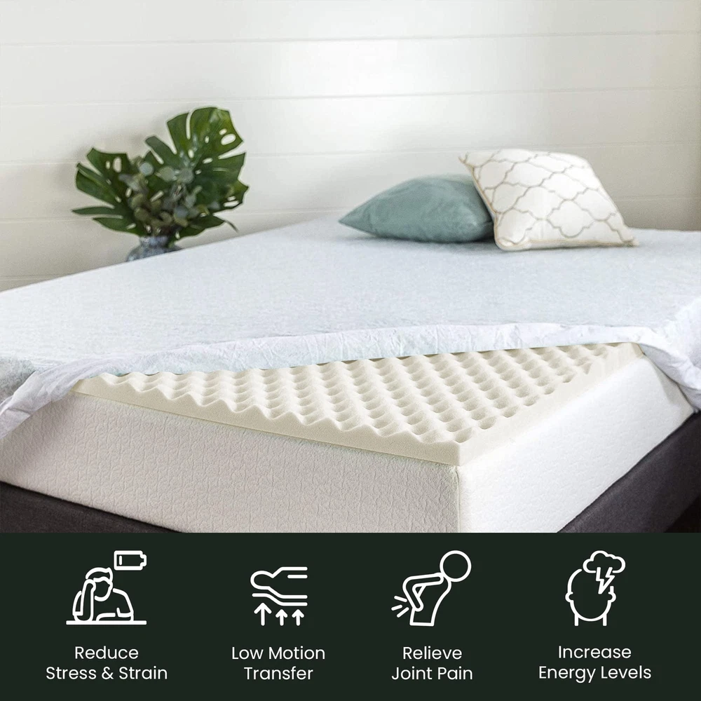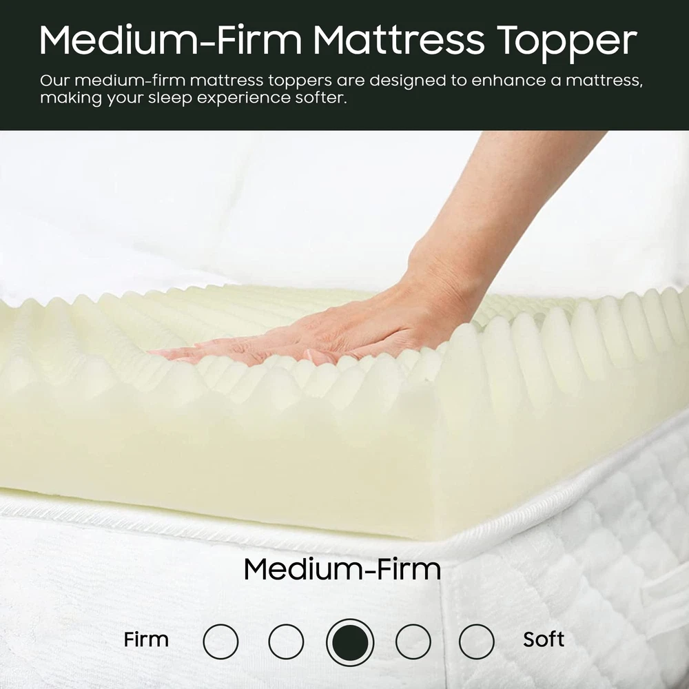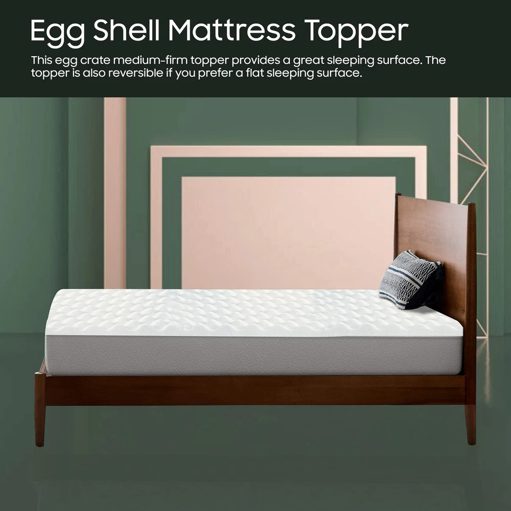The premium foam adds luxurious softness while not taking away from the support of the mattress. These bed toppers have been effective in enhancing the comfort level of new and old mattresses alike, providing a better sleep experience for most people. This Convoluted Egg Shell Breathable Foam Topper is made from good quality foam that gently cradles you in individualized comfort and support. It also provides you with pressure-relieving cushioning in the hip and shoulder areas while still supplying enough support, so the body doesn't get imbalanced. These unique mattress toppers are to be used on top of your mattress for additional comfort. This prevents your body from sinking and curling while sleeping and promotes a better posture, which reduces and strain on your spine and increases energy levels during the day. Our premium-level mattresses are here to help you get the best possible comfort at all times when you sleep or lie down to relax. Pressure : The convoluted design of the foam helps to distribute weight evenly, which can help reduce pressure points on the body. This can be particularly helpful for people who suffer from joint pain or other conditions that make it difficult to get comfortable in bed. Increased comfort: The convoluted design can also make the mattress topper feel softer and more comfortable, which can lead to a more restful night's sleep. CertiPUR-US certified foam: Rest easy knowing that the topper's foams are CertiPUR-US certified, meeting stringent standards for durability, performance, and content. Quality you can trust. Motion isolation: The convoluted foam design can help to absorb movement, which can be helpful for people who share a bed with a partner. This can prevent motion from transferring across the bed and disturbing the other person's sleep. Versatility: Convolute foam mattress toppers are making them versatile and suitable for use with different types of mattresses. Toppers can be used on a variety of surfaces, such as futons or camping cots, to provide extra cushioning and comfort.