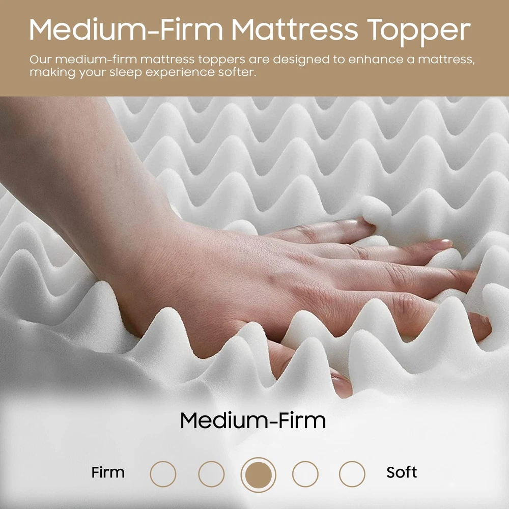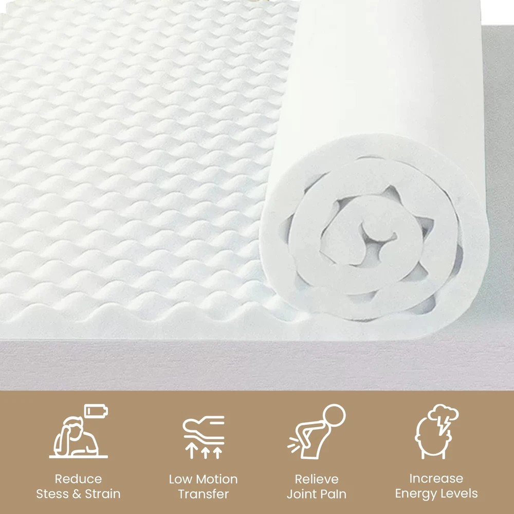 The premium foam adds luxurious softness while not taking away from the support of the mattress. These bed toppers have been effective in enhancing the comfort level of new and old mattresses alike, providing a better sleep experience for most people. This Convoluted Egg Shell Breathable Foam Topper is made from good quality foam that gently cradles you in individualized comfort and support. It also provides you with pressure-relieving cushioning in the hip and shoulder areas while still supplying enough support, so the body doesn't get imbalanced. These unique mattress toppers are to be used on top of your mattress for additional comfort. This prevents your body from sinking and curling while sleeping and promotes a better posture, which reduces and strain on your spine and increases energy levels during the day. Our premium-level mattresses are here to help you get the best possible comfort at all times when you sleep or lie down to relax. Pressure : The convoluted design of the foam helps to distribute weight evenly, which can help reduce pressure points on the body. This can be particularly helpful for people who suffer from joint pain or other conditions that make it difficult to get comfortable in bed. Increased comfort: The convoluted design can also make the mattress topper feel softer and more comfortable, which can lead to a more restful night's sleep. CertiPUR-US certified foam: Rest easy knowing that the topper's foams are CertiPUR-US certified, meeting stringent standards for durability, performance, and content. Quality you can trust. Motion isolation: The convoluted foam design can help to absorb movement, which can be helpful for people who share a bed with a partner. This can prevent motion from transferring across the bed and disturbing the other person's sleep. Versatility: Convolute foam mattress toppers are making them versatile and suitable for use with different types of mattresses. Toppers can be used on a variety of surfaces, such as futons or camping cots, to provide extra cushioning and comfort.