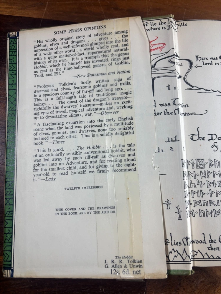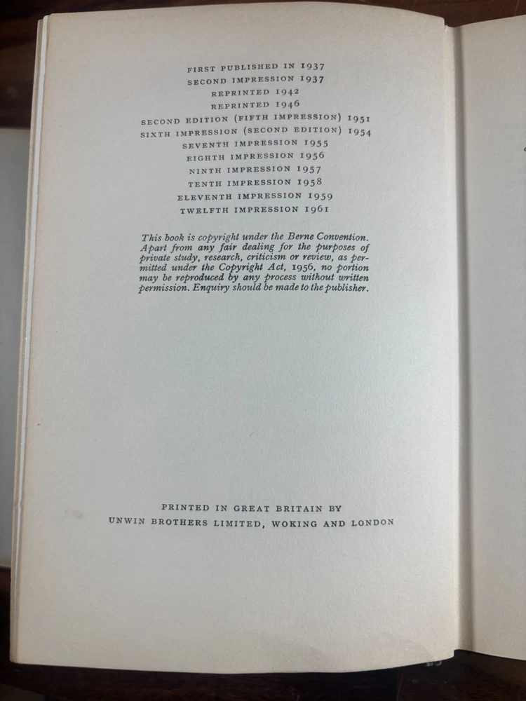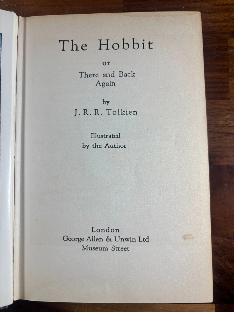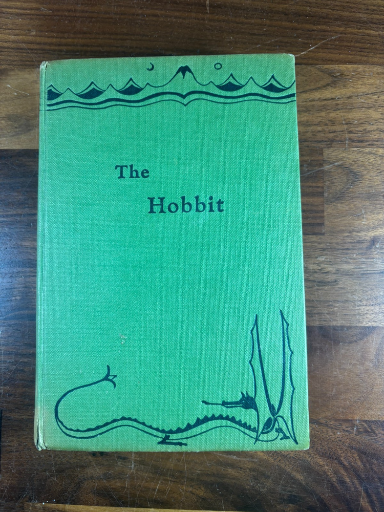 An original Second Edition, 8th Impression (1961) of The Hobbit , by J. R. R. Tolkien, published by George Allen & Unwin Ltd, London. This is a genuine early UK printing, confirmed by the publisher’s imprint page listing the 8th Impression (1961), with the full printing history present and intact. The book retains its original Tolkien-designed dust jacket, featuring the iconic mountain, forest, and runic border artwork by the author himself, a highly desirable collector feature. Complete with all original illustrations and maps, including the Desolation of Smaug map and Tolkien’s internal artwork. Publication Details: Title: The Hobbit, or There and Back Again Author: J. R. R. Tolkien Illustrated by: The Author Publisher: George Allen & Unwin Ltd, London Printer: Unwin Brothers Ltd, Woking and London Edition: Second Edition Impression: 8th Impression Year: 1961 Original price: 12s. 6d. net Dust jacket: Original, Tolkien-designed Maps: Present and complete Illustrations: Present and complete Condition: Book: Green cloth boards clean and bright Binding firm and intact Spine artwork clear Pages clean and well preserved No inscriptions or ownership marks No loose pages Maps and illustrations intact Dust Jacket: Edge chipping and tears Spine splits and creasing Old internal tape repairs to flaps Small losses at folds and edges On Tolkien and the Hobbit The Hobbit was first published in 1937, marking the literary debut of Middle-earth and the beginning of one of the most influential mythologies in modern literature. Tolkien initially wrote the story as a children’s tale for his own family, but its depth, linguistic richness, and mythic structure quickly distinguished it from contemporary fantasy. The success of The Hobbit directly led to the creation of The Lord of the Rings, transforming Tolkien from a university professor of philology into one of the most important literary figures of the 20th century. The Second Edition (1951) introduced Tolkien’s first major textual revisions, aligning the story more closely with the emerging legendarium of Middle-earth. These post-1951 editions represent the canonical version of the text as integrated into Tolkien’s wider mythology. The 1961 8th Impression belongs to the early post-war Tolkien publishing era, a period when Tolkien’s readership expanded rapidly in the UK and internationally, prior to the mass-market paperback boom. Books from this period remain highly collectible as early authentic Allen & Unwin printings, produced before Tolkien became a global cultural phenomenon. The dust jacket artwork, designed by Tolkien himself, is considered one of the most iconic pieces of fantasy book design in literary history, making original jackets especially desirable among collectors. Collection Details: Genuine early UK printing Original Allen & Unwin publication Original Tolkien-designed dust jacket Complete maps and illustrations Verified printing history page Highly collectible Tolkien period edition