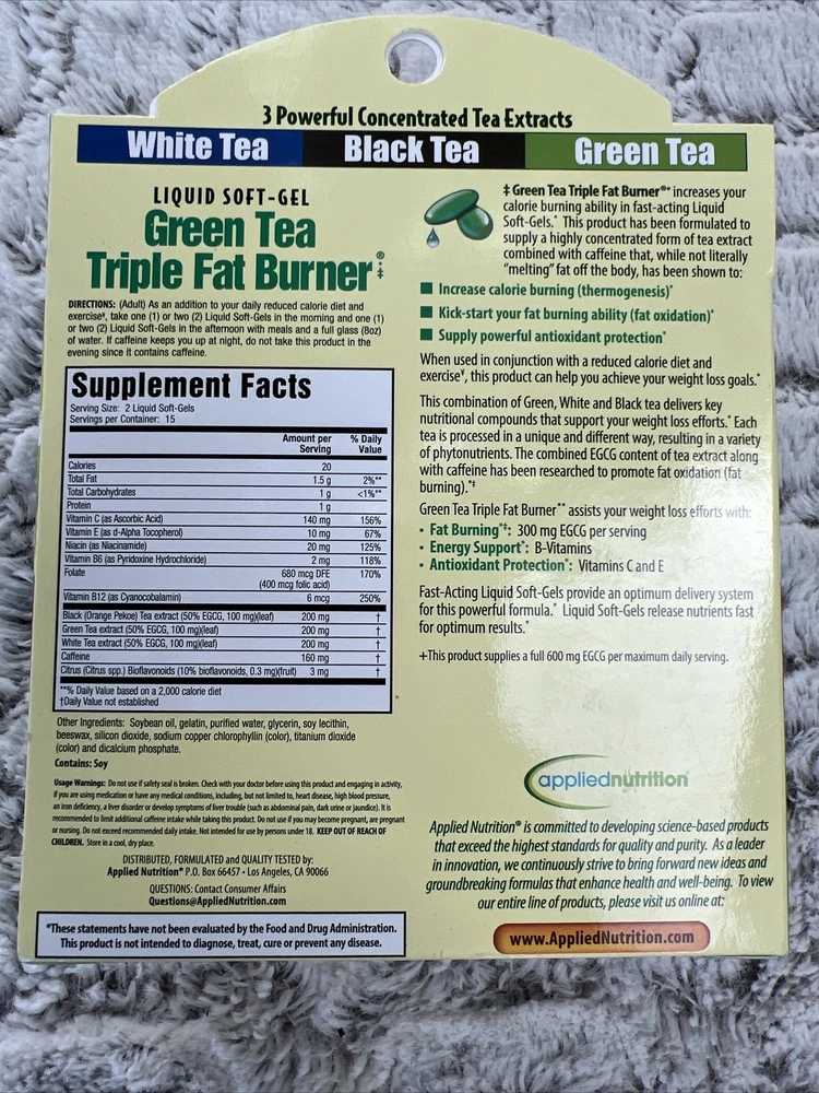 Item Weight:0.9 lbsIngredients:Water, White Tea, Vitamin E, Beeswax, Soy Lecithin, Silicon, Green Tea, CaffeineType:SupplementFormulation:SoftgelUPC:0710363568450Brand:Applied NutritionMain Purpose:Weight LossActive Ingredients:Vitamin C (Ascorbic Acid), Black Tea, Green Tea, Caffeinegtin13:0710363568450MPN:AN056983Number of Pills:30