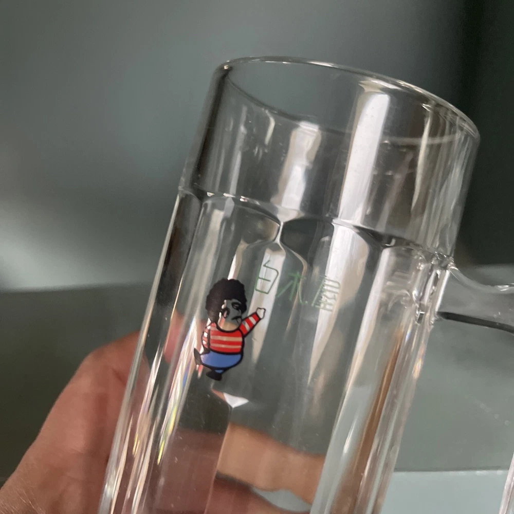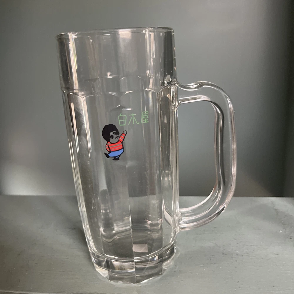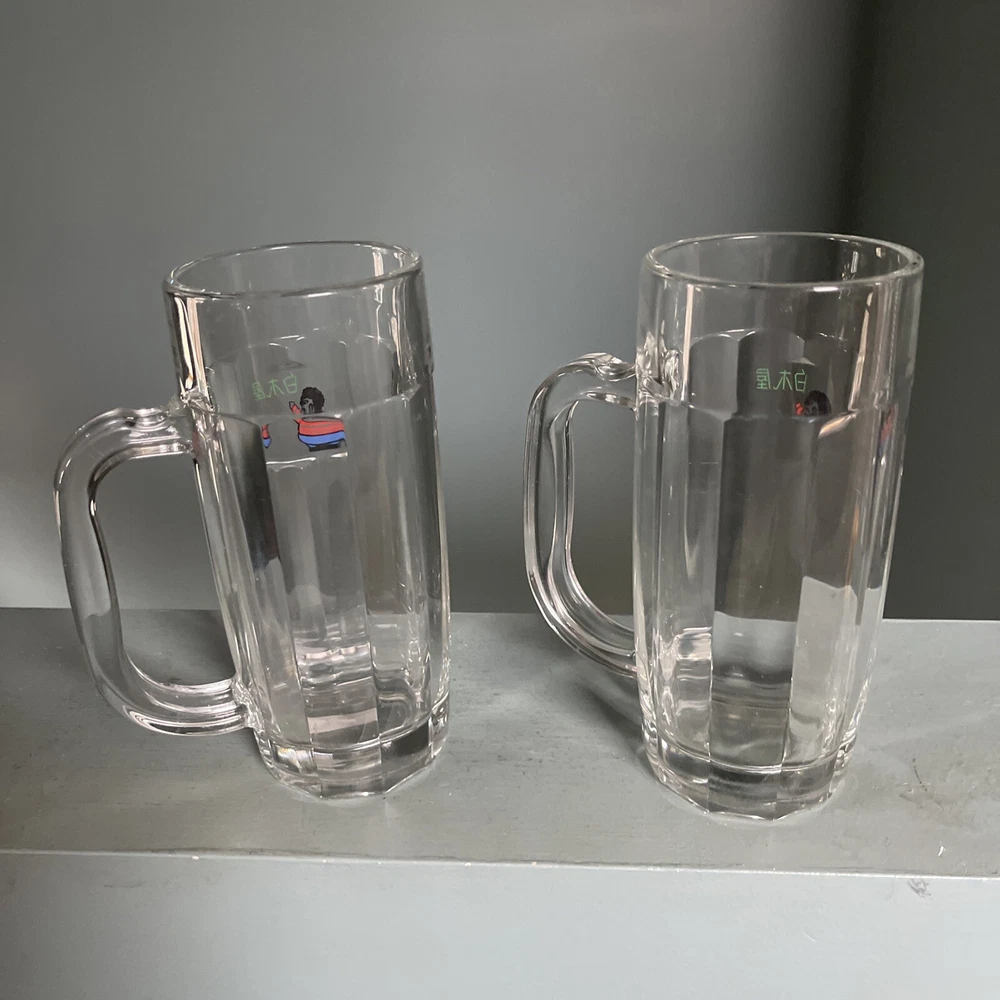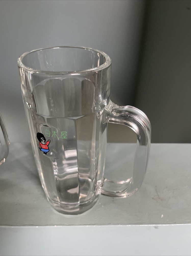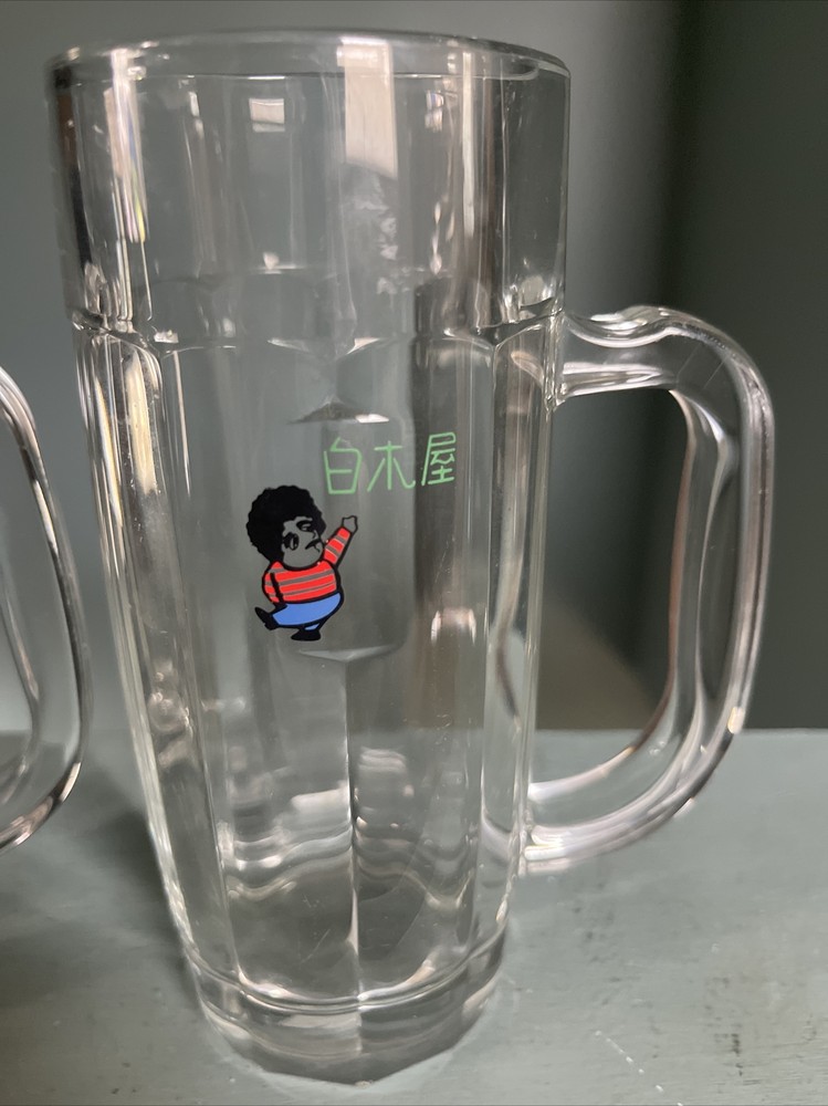 These glasses have a great shape that is slightly more unusual than a typical beer mug. Finer in a way, more svelte. You’ll know what I mean when you hold them in your hand. Really cool graphics too, cartoonish sad mime which have a Yoshitomo Nara feel, and both are in excellent condition. Measure 6.5” tall Opening is 2.5” Width to outer handle is 4-3/8”