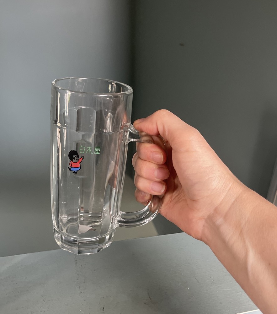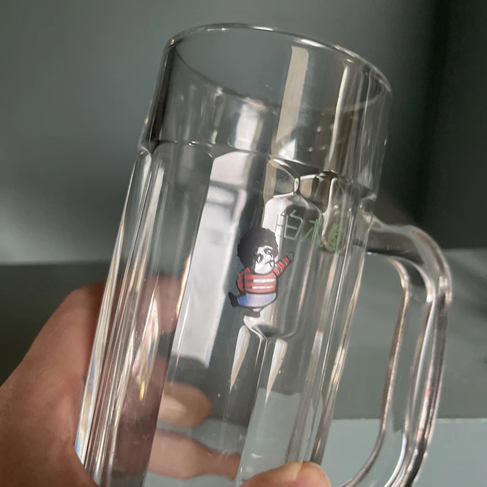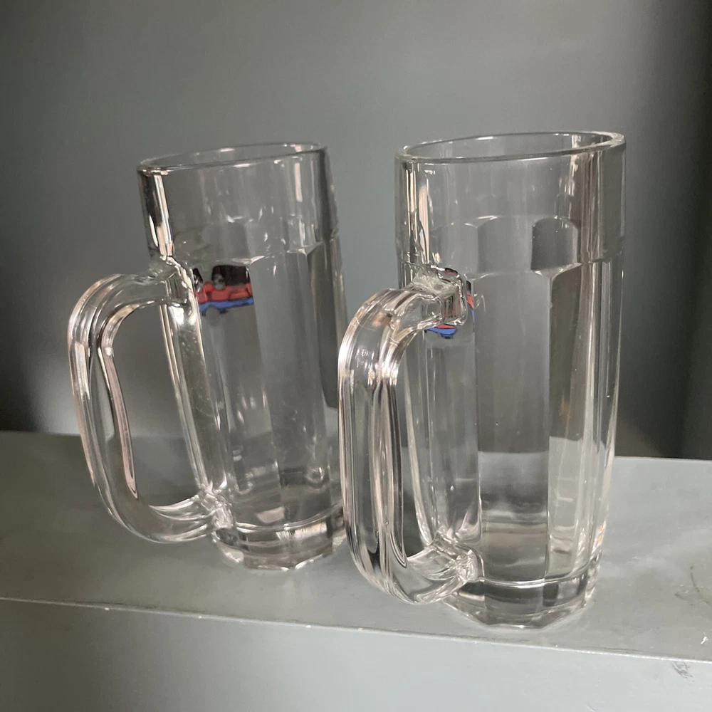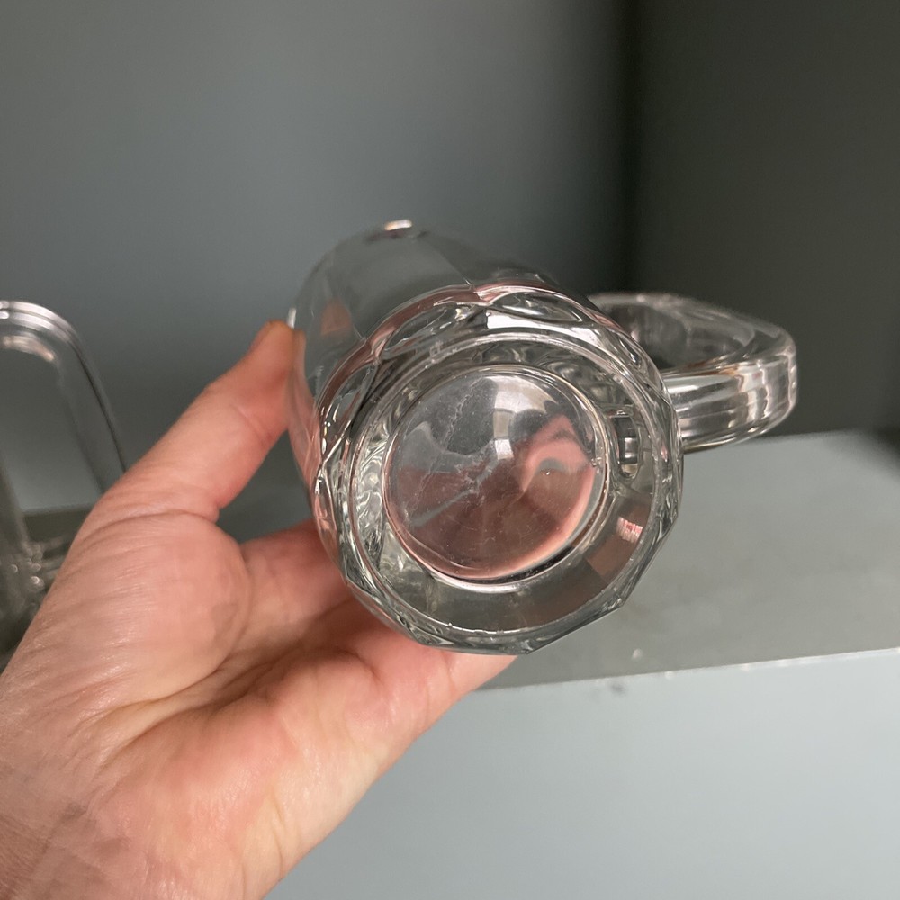 These glasses have a great shape that is slightly more unusual than a typical beer mug. Finer in a way, more svelte. You’ll know what I mean when you hold them in your hand. Really cool graphics too, cartoonish sad mime which have a Yoshitomo Nara feel, and both are in excellent condition. Measure 6.5” tall Opening is 2.5” Width to outer handle is 4-3/8”