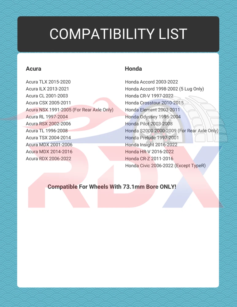 Adapter Thickness: 8mm each side Quantity: 2 Pieces Bolt Pattern: 5X114.3 to 5X114.3 (Equivalent to 5x4.5" Inch) Center Bore: 64.1mm (Hub) to 73.1mm (Wheel) Hubcentric w/ Lip design - Only works on aftermarket wheels w/ 73.1mm Bore EXTENDED STUDS ARE REQUIRED FOR THIS SET UP