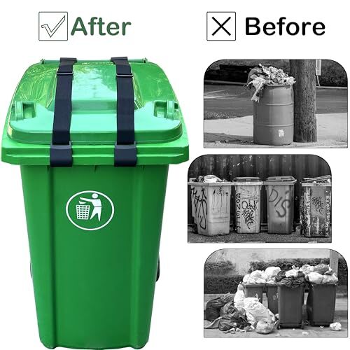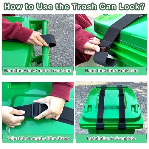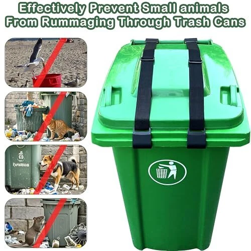 2 Metal Claws: This trash can lock is equipped with two metal claws and adopts heavy-duty metal hooks to ensure extremely high strength and durability. The trash can lid lock strap is made of abs plastic, which has excellent elasticity. It can not only effectively prevent animals from rummaging through the garbage, but also resist external power impact, reduce the risk of breakage and wear, thereby greatly improving the safety and service life of the trash can. Adjustable Trash Can Lock: The trash can lid lock adopts an adjustable design, the size can be adjusted from 23 inches to 48 inches, and it is elastic. This design is suitable for various style of trash cans to meet your different needs. The trash can lock double claws can be hung in multiple positions of the trash can, which is more flexible to use. Wide Compatibility: Whether it is a small 28-gallon trash can or a large 96-gallon trash can, our adjustable trash can straps can easily adapt and securely fix all style of trash cans. The flexible adjustment design of the bear proof trash can ensures a perfect fit for various sizes. The installation process is simple and fast, and it will not cause you any trouble. You don't need to worry about the garbage bag slipping or loosening, which makes it more convenient and safe to use. Sturdy and Easy to Install: The trash can lid lock adopts an innovative screw-free design, which is easy to install and avoids cumbersome tools and complicated steps, effectively preventing wild animals such as raccoons from entering the trash can, thereby preventing garbage from overturning or scattering on the driveway, keeping the environment clean. Clean and Tiny: Keep animals out of your trash can with our animal trash can locks. Designed to keep out wild animals like raccoons, squirrels, and even bears, this lock keeps your trash securely stored and prevents animals from rummaging through it. Say goodbye to scattered trash and unpleasant odors, helping you maintain a clean and tidy courtyard.