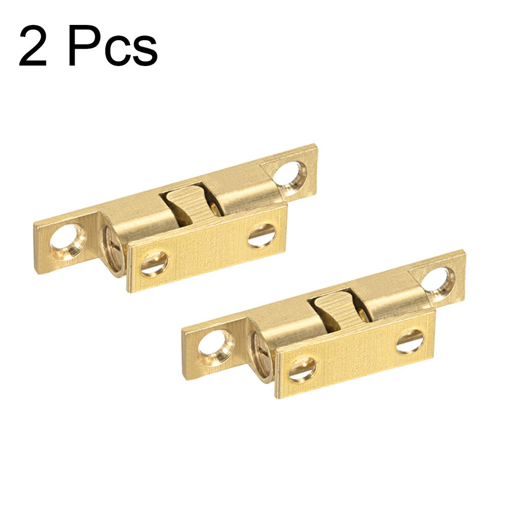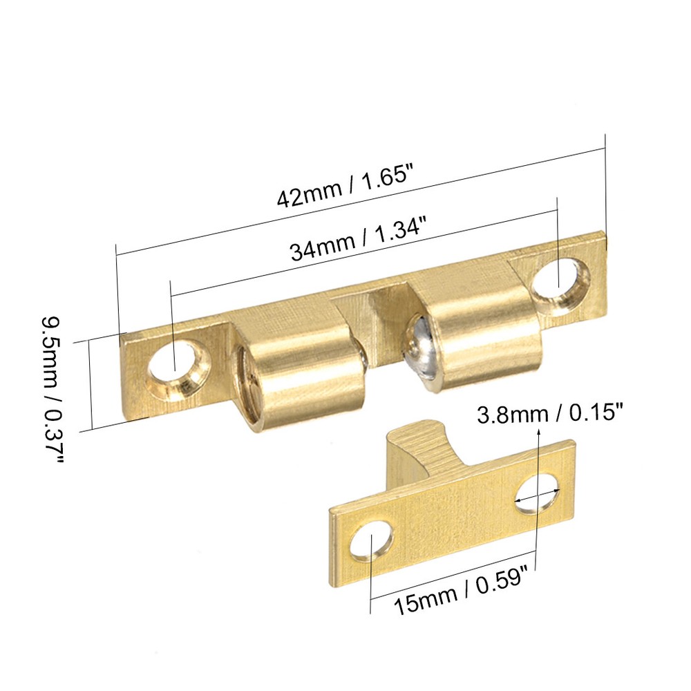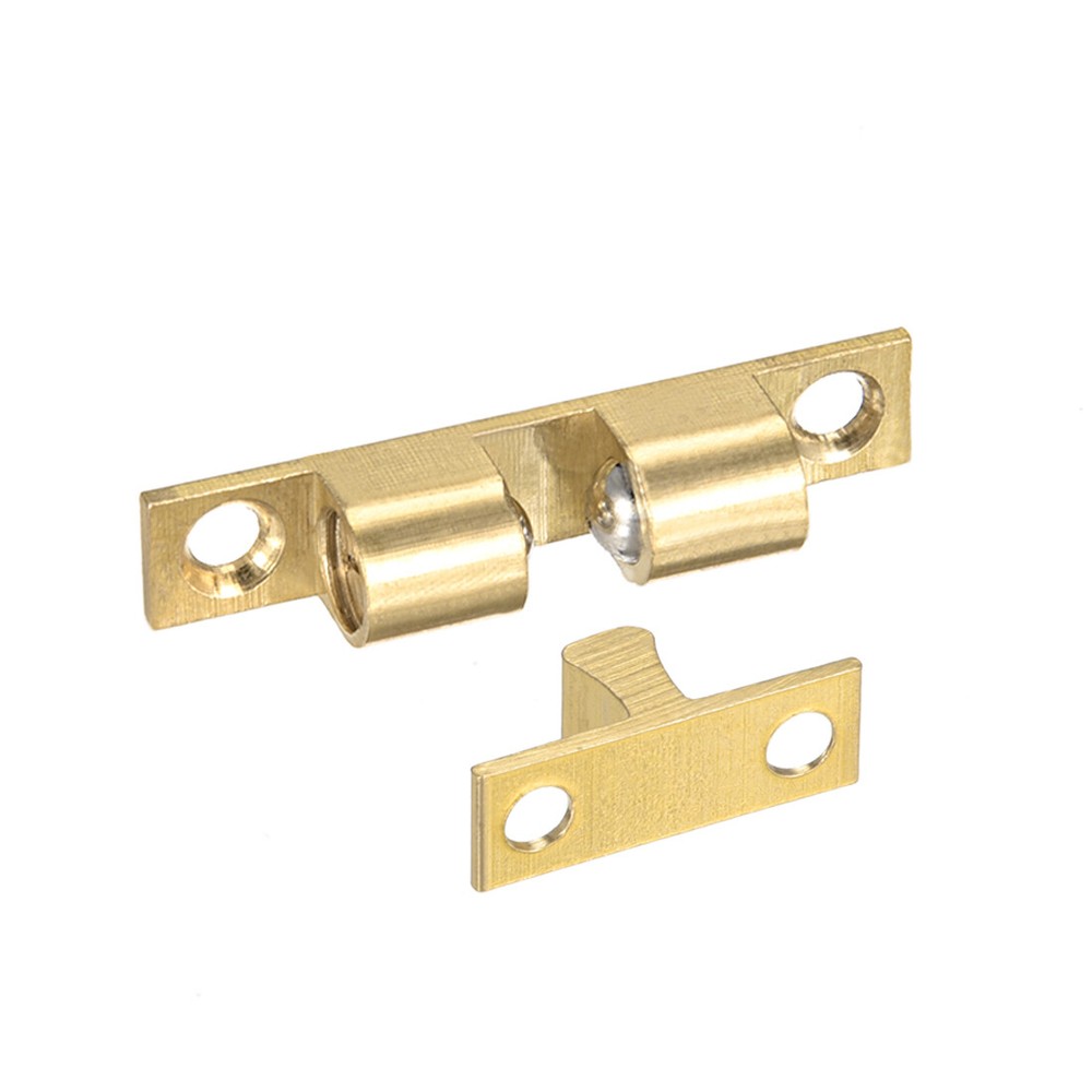 2pcs Cabinet Door Closet Brass Double Ball Catch Tension Latch 42mm Length Specification: Product Name: Double Ball Catch Material: Brass Finish: Polish Main Color: Gold Tone Dimension: 42 x 9.5 x 9.5mm / 1.65-inch x 0.37-inch x 0.37-inch (L*W*H) Mounting Hole Diameter: 3.8mm / 0.15-inch Mounting Hole Distance: 34mm/ 1.34-inch, 15mm / 0.59-inch Package Content: 2 x Double Ball Catch Description: 1.Made of solid brass in gold tone, good accessory for home, office and shop. Easy installation. 2.A stable double ball catch mechanism is adopted, the catch force can be adjusted by the slotted screws each side of the ball head. 3.Features 42mm total length, double ball, could be installed on cabinet, cupboard, drawer, door, etc. On Oct 17, 2025 at 20:36:05 PDT, seller added the following information: