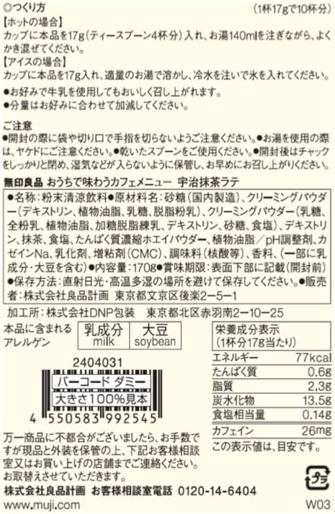 Product: Tea & Infusion Product Name: Muji Instant Matcha Latte Powder 170g Form: Powder Item Weight: 170g Serving Size: 170g Regional Cuisine/Region: Japanese Tea Origin: Japan Number in Pack: 2 Food Aisle: Pantry gtin13: Does not apply Type: Matcha Brand: Muji Tea Type: Green UPC: Does not apply Flavor: green tea, matcha Number of Servings: 10 Expiration Date: best within 6month from purchase Calories per Serving: 77 Country/Region of Manufacture: Japan