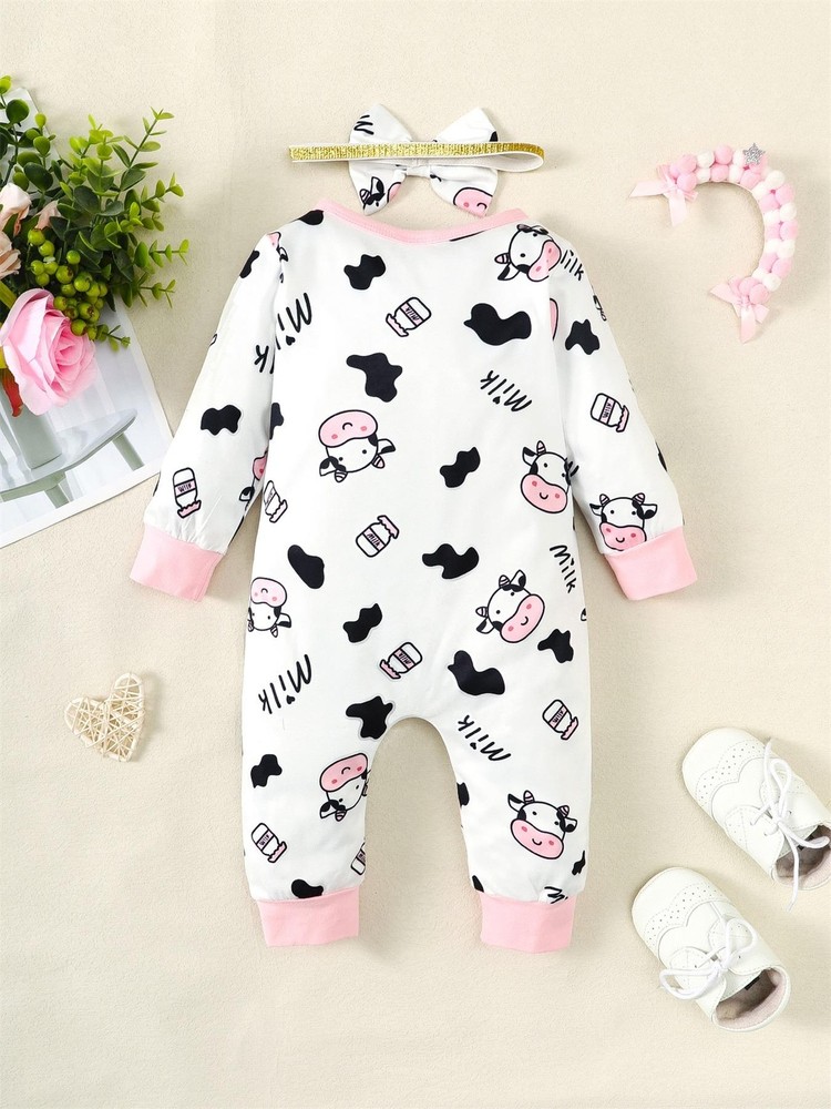 2pcs Newborn Baby Girl Fashion Jumpsuit Cute Cow Long Sleeve Bodysuit+headband