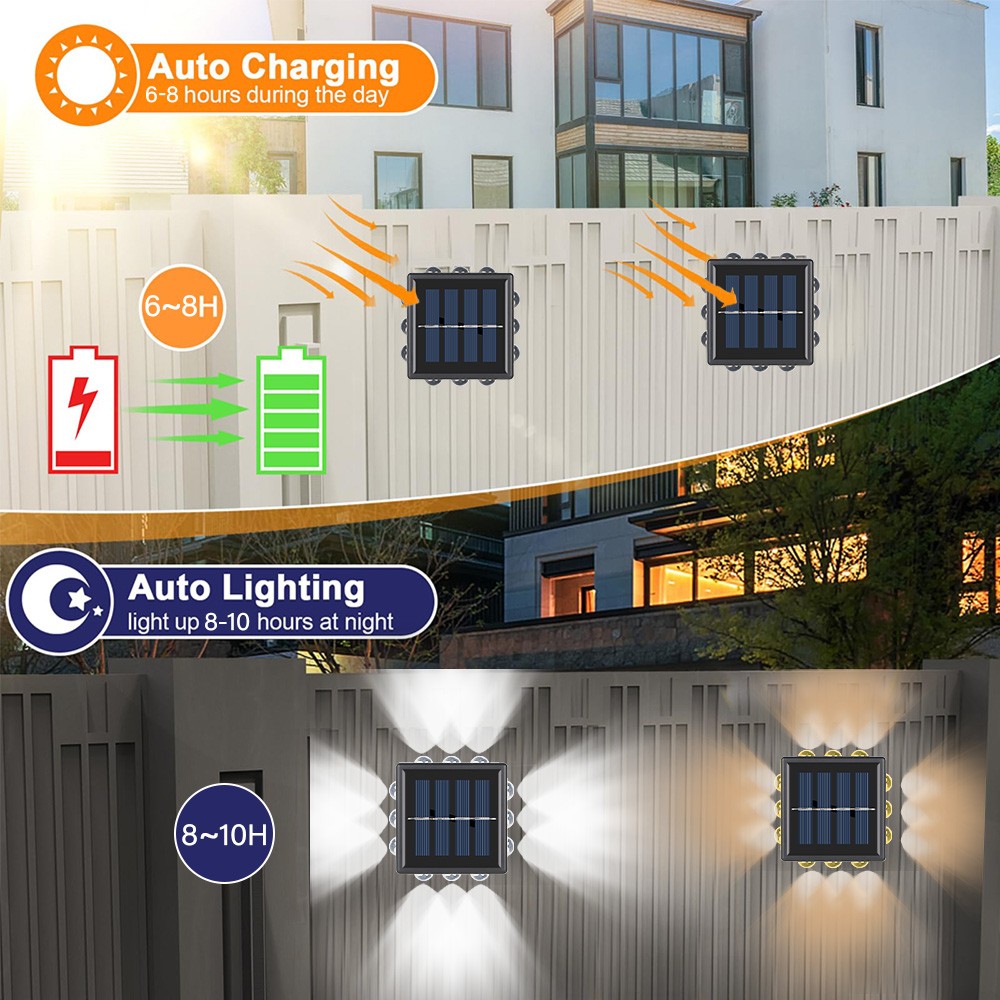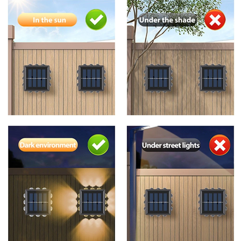 Product Description Description : 12LED Four Sides Upgraded Solar Wall Light: This bright solar lights outdoor garden equipped with 12 upgraded LED beads, which is much brighter and more cost-efficient than other fence lights on the market. This modern solar outdoor wall lights are up and down glow design. There are 3 upgrade lighting LED on the fours sides,which has a excellent lighting effects,providing better lighting and decoration for your house. Portable Size & Widely Used: Our deck lights solar powered are compact and portable, easy to handle and install in a variety of locations. Despite its small size, the outdoor step lights are very bright and suitable for enhancing security around doorways and garages, illuminating paths and backyards, and providing ample lighting for steps, fences, paths, stairs and more. Waterproof & Auto ON/OFF: This outdoor wall lights is made of weather resistant ABS material with a waterproof grade of IP65. The outdoor patio lights can withstand various outdoor conditions such as rain, snow, and extreme temperatures. And the solar powered fence lights automatically charge under sunlight. When the rechargeable battery is fully charged, the outdoor solar fence lights can light for 8-10 hours. Longer Working Time: Solar lights for steps has a wide range of lighting to illuminate your garden. The solar powered fence lights with a large battery capacity of 600mAh, it can work for up to 8-10 hours after 6-8 hours fully charged. The outdoor solar lights for fence can provide you a bright environment. Easy Installation: Fence post solar lights are relatively easy to install since they don't require any electrical wiring. outdoor fence lights can be mounted with screws (included) on outdoor walls, fences, next to the porch, or can be directly affixed with adhesive (included), which does not require a High-performance electrician to install and saves labor costs. Specification : Product Type: Solar Wall Light Weight: 191g Waterproof: IP65 Material: ABS+PC LED Quantity: 12LED Light Color: White Solar Panel: 2V/220mAh Battery Capacity: 600mAh Working Mode: Switch+Light Sensor Charging Time: 6-8hrs(in direct sunlight) Working Time: 8-10hrs(depends on battery capacity) Package Included: 2 x Solar Wall Light 2 x Screw Package 1 x User Manual Note: Due to the different monitor and light effect, the actual color of the item might be slightly different from the color showed on the pictures. Thank you! Please allow 1-2cm measuring deviation due to manual measurement. Payment Shipping Returns Contact Us 1. This is the payment method we can accept: Paypal 2. You can checkout and pay immediately after the auction ends or you complete the purchases. If you need an eBay invoice sent to you by Email, please contact us before making payments. 3. Once the checkout is completed, you will not be able to include any additional purchases. We start to process and fulfill your order once payment is received. New purchases after the checkout will be processed separately. 4. Payments are expected within 4 days after the order is confirmed. Unpaid item (UPI) strike may be filed with eBay upon non-receipt of payment. 1. How much is the shipping & handling (S&H)? Our shipping and handling charges are clearly stated in the Shipping and Payments section of the item page, and we provide Free Shipping for most items. 2. For multiple purchases, the combine shipping discount will be automatically calculated when you check out and pay all of your purchases together. Items checked out separately may not be combined and the combine shipping discount will not be offered automatically. 3. Please make sure the correct Ship-To address is entered before checking out. Once the payment is completed, you may not be able to change the shipping address. We shall not be held responsible for any wrong or undeliverable addresses. 4. We usually ship within 1-2 business days of receiving cleared payment. 1. We put buyer's satisfaction at top priority. If you're not pleased with your purchases, we'll be happy to make an exchange or refund the item total price less Shipping and Handling (S&H) charges within 30 days of your purchases. 2. For any Exchange, Refund or Return, the item must be in its original condition, including the box, packaging, and all the accessories or gifts. 3. We'll provide prepaid return shipping label if the return is a result of our error. Postage reimbursement is offered only on standard mails, and it needs to be approved by our staff prior to returning. 4. Please allow up to 7 business days for returns to be processed. 5. Shipping and Handling (S&H) charges are not refundable. 1. Customer satisfaction is very important to us and our feedback rating reflects this satisfaction. If you have any question or concern, please contact us via eBay message. 2. We respond to all eBay messages as quickly as possible. Though your question will usually be answered very soon, please allow us up to one business day before you start thinking your message is neglected or the reply is avoided, because there would be time difference, non-working hours or public holidays that have prevented us from making an instant response. Payment 1. This is the payment method we can accept: Paypal 2. You can checkout and pay immediately after the auction ends or you complete the purchases. If you need an eBay invoice sent to you by Email, please contact us before making payments. 3. Once the checkout is completed, you will not be able to include any additional purchases. We start to process and fulfill your order once payment is received. New purchases after the checkout will be processed separately. 4. Payments are expected within 4 days after the order is confirmed. Unpaid item (UPI) strike may be filed with eBay upon non-receipt of payment. Shipping 1. How much is the shipping & handling (S&H)? Our shipping and handling charges are clearly stated in the Shipping and Payments section of the item page, and we provide Free 