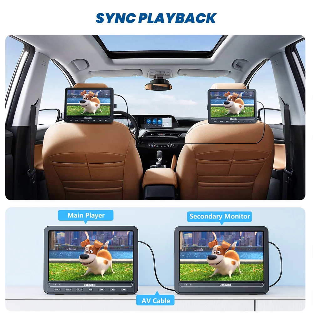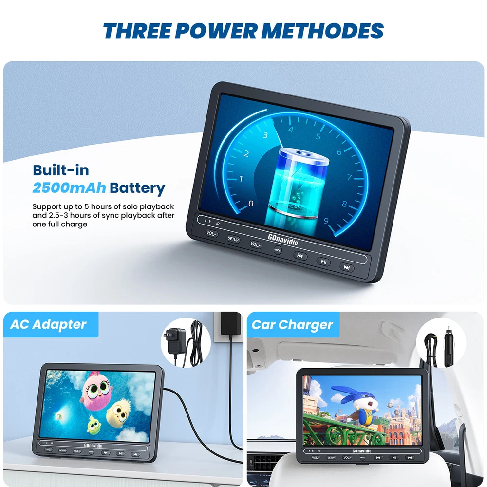 【5-hour Playing Time】With a built-in 2500mAh rechargeable Li-ion battery, these dual-screen portable DVD players support up to 5 hours of solo playback and 2.5-3 hours of sync playback after one full charge. AC power adapter and Car Charger are included in the package, the perfect rear seat entertainment system for long-time travel or daily use at home. 【Sync Playback on Both Screens】With the AV cable (included in the package), you can connect the host DVD player and slave monitor to play the same movie or video (Do not support separate playback). 【Dual Louder Speakers】Built-in 2 upgraded stereo speakers on each unit provide you with louder and clearer stereo sound, so you can hear every detail of the movie. Each unit also owns a 3.5mm headphone jack to connect with headphones (included) o 2x 10.5" Dual Screen Car Headrest DVD Player Monitor USB Battery HDMI+2x Headset Key Features: Ø 【5-hour Playing Time】With a built-in 2500mAh rechargeable Li-ion battery, these dual-screen portable DVD players support up to 5 hours of solo playback and 2.5-3 hours of sync playback after one full charge. AC power adapter and Car Charger are included in the package, the perfect rear seat entertainment system for long-time travel or daily use at home. Ø 【Sync Playback on Both Screens】With the AV cable (included in the package), you can connect the host DVD player and slave monitor to play the same movie or video (Do not support separate playback). Ø 【Dual Louder Speakers】Built-in 2 upgraded stereo speakers on each unit provide you with louder and clearer stereo sound, so you can hear every detail of the movie. Each unit also owns a 3.5mm headphone jack to connect with headphones (included) or external speakers for various listening experiences. Ø 【Support USB and SD Card】With built-in USB port and SD card slot, the DVD player for car allows you to play all of your downloaded media (VOB, AVI, MPEG1, MPEG2, XVID, MPG, 3GP, MP3, WMA, JPG, JPEG), you can enjoy your videos, music, and photos on the road. Ø 【Region Free & Last Memory】No restriction for discs from all regions: CD, DVD, CD-R/RW, DVD±R, DVD±RW, VCD, SVCD, etc (Blu-Ray not Supported). The Last Memory function keeps your viewing progress and always starts from where you leave off. Enjoy all your collections from now on! Ø 【HDMI Input】 : The players support the playback of 1080P videos from your mobile phone, Firestick, PS3, PS4, Xbox, Raspberry Pi and computers in sync. More choices, better entertainment. Technical Specification: Screen Size: 10.5 inch HD TFT LCD Screens Resolution:1024*600 LED back light Supported Formats: DVD/SVCD/VCD/CD/MP3/JPG/AVI/AVI/MPEG/DIVX Battery: 1 Lithium Polymer batteries required. (included) Charging Time: more than 6 hours Playing Time: the main player can keep running for 5 hrs, or the both monitors could work together for about 2.5-3 hrs Box size: 15.9 x 9.7 x 5.4 inches Gross weight: 5.49 Pounds Package 1x DVD player 1x LCD monitor 1x AC adapter 1x Car charger 1x IR Remote control 1x DV cable 1x AV cable 1x User manual 2x Mounting Strap 2x Headphones Payment Shipping Warranty Contact US Working Time Payment We only accept payment by Paypal. If you pay by paypal with E-check, it normally takes 5 business days to clear, Once your E-check payment clears, your item will be dispatched within 1-2 working days. Payment must be received within 7 days after the auction ended. Shipping We ship the item From USA Warehouse. Usually it just take 2-3 business days! Warranty We provide 12 months warranty to our products. Return shipping is to be paid by the Buyer.We will refund or replace, upon receipt of the item in its original condition anda packaging with all components and accessories included. All returned items MUST BE in the original packaging and you MUST PROVIDE us with the shipping tracking number, specific reason for the return, and your eBay ID. Contact US Any technical guidance or further information , please contact us with eBay Message. Any accessories required, please kindly take a pitcure to our email. If return products for warranty repair, replacement or full refund, please email us and then ship it back. Working Time Our Duty Time China Time USA(pacific time) Start End Start End Monday AM 9:00 PM 18:00 Sunday PM 17:00 Monday AM 2:00 Tuesday AM 9:00 PM 18:00 Monday PM 17:00 Tuesday AM 2:00 Wednesday AM 9:00 PM 18:00 Tuesday PM 17:00 Wednesday AM 2:00 Thursday AM 9:00 PM 18:00 Wednesday PM 17:00 Thursday AM 2:00 Friday AM 9:00 PM 18:00 Thursday PM 17:00 Friday AM 2:00 Saturday Out of Duty Friday Saturday Sunday Out of Duty Saturday Sunday (During the duty time ,we can give you a quick respond. If we are out of work. please kindly be patient and considerable to give us a little more time, thanks for your supporting!