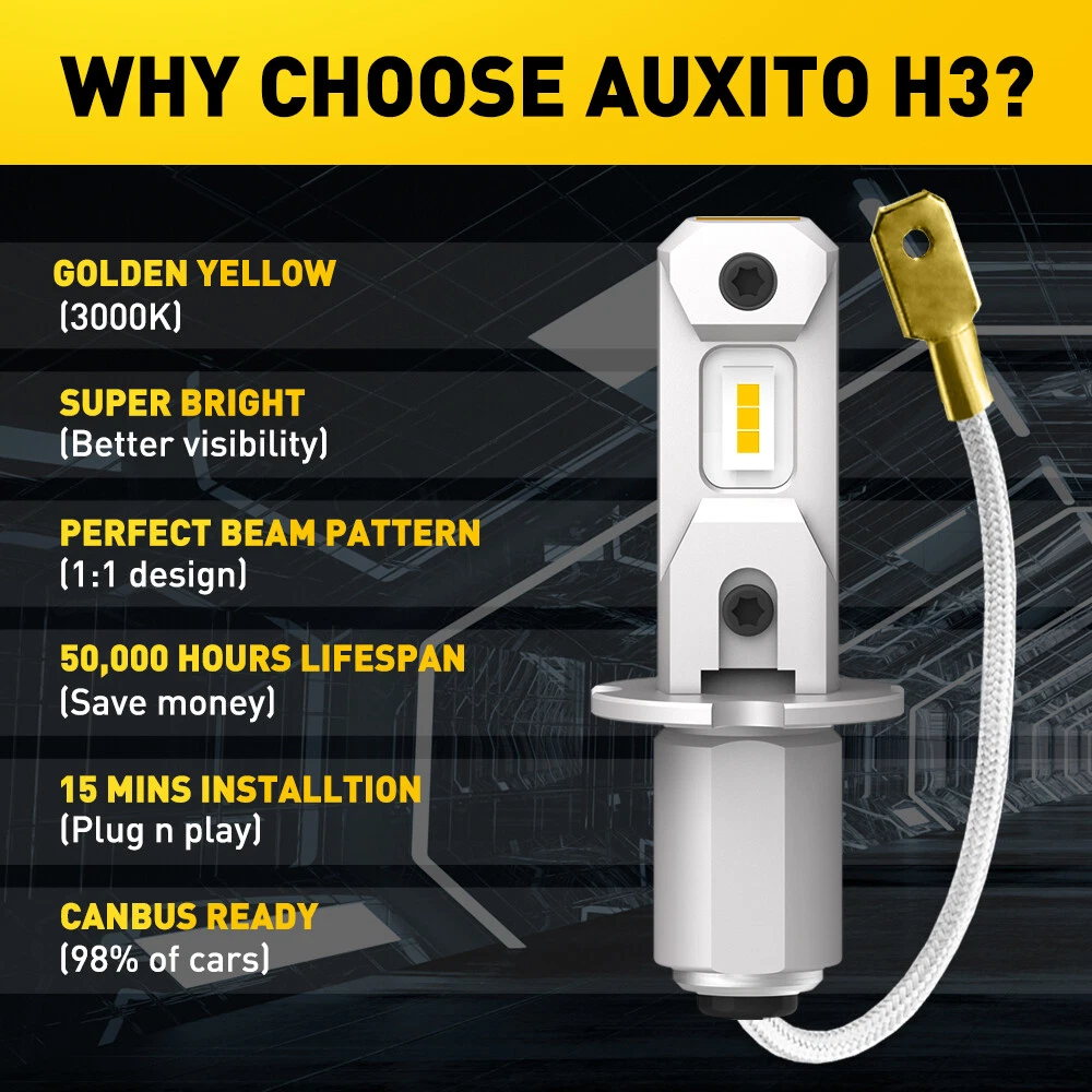 The compatible vehicle lists is only partial lists,no fully included due To Ebay listing compatible vehicles limitation. IF your car plug is H3,the item is fit your car About this item CSP Chips, Brightness Improved AUXITO h3 LED fog light bulb is designed with 6 CSP chips, 3000K Golden Yellow, about 3 times brighter than stock halogen bulbs, allowing you to see better and drive safer in snow, fog and rain Non-polarity, Easy to Install AUXITO H3 fog light bulb adopts the latest 1:1 mini size design, no polarity, one wire connection, so you can stay away from all kinds of installation problems. Plug and play without any modification 2x AUXITO H3 LED Fog Light 3000K Super Yellow 8000LM High Power Bulbs S The compatible vehicle lists is only partial lists,no fully included due To Ebay listing compatible vehicles limitation. IF your car plug is H3 ,the item is fit your car About this item CSP Chips, Brightness Improved AUXITO h3 LED fog light bulb is designed with 6 CSP chips, 3000K Golden Yellow, about 3 times brighter than stock halogen bulbs, allowing you to see better and drive safer in snow, fog and rain Non-polarity, Easy to Install AUXITO H3 fog light bulb adopts the latest 1:1 mini size design, no polarity, one wire connection, so you can stay away from all kinds of installation problems. Plug and play without any modification IP67 Waterproof, Widely Use AUXITO led fog lights are used for upgrading stock dim h3/h3ll halogen bulb on most vehicles. With a IP67 waterproof design, you can use it in all kinds of extreme weather without worrying about water and dust entering Super Cooling, Long Lifespan Using the new LED technology, power consumption reduced by 60%. The entire aviation aluminum fuselage provides superior cooling capacity. Guaranteed up to 50,000 hours of life, saving you from the hassle of frequent bulb replacements 98% Error Free, No Worries AUXITO H3 LED bulbs are suitable for most of vehicle computer systems without error or flicker, but some sensitive models may require a canbus decoder. Specifications: Model: Common for H3 Voltage: DC 9V-16V Light source: CSP Color : 3000K Yellow Operating Life: >50000hrs Application: Fog light, daytime running light, headlight Package include: 2X H3 LED BULB lights Item Specifics Features CANbus Compatible Bulb Fitment Code H3 Manufacturer Warranty 5 Years OE/OEM Part Number AUXITOH3LED Voltage 9-16 V Fitment Type Direct Replacement Performance Part Yes Lighting Technology LED Suitable For Fog Light Lumens 4000 lm To Fit Foglight, Daytime Running Light, Headlight Color Temperature 3000K Light Color Yellow Number of Bulbs 2 Placement on Vehicle Front Manufacturer Part Number AUXITOGFH3 Brand AUXITO Light source CSP Bulb Life Hours Up to 50,000 Hours Type Light Bulb Performance Part Yes FAQ ♥ If you have a decoding problem or any other problems, please contact us first, we will help you with it. We will reply you within 24 hours in working days. I'm a new seller, thanks a lot for your trust and convince! I will serve you with all my heart. ♥ Q1: Will this bulb fit my vehicle? A: We can match almost any vehicle to one of our bulb sizes. eBay only lets us include some vehicle fitments per listing, but if your vehicle does not show up on the compatibility table at the top of our listings, welcome you to contact us for free consulation before purchasing a product. Q2: My item has not arrived, what's taking so long? A: Sometimes items take longer than expected, especially if it’s going far or to rural area. Check with your post office to see if your item has been held up. Sometimes Royal Mail will not update a tracking number until it has arrived at its destination. If your item still don't arrive after a few days, let us know so we can double check for you and help solve it asap. Q3: My bulbs won't fit, help! A: Special bulb holder may be required. See if you can take the holder from the stock bulb. If not, let us know. The bulb size may be wrong, double check the item you received with the item you ordered. Do you have an aftermarket lighting housing? These may not be perfectly fitted for aftermarket bulbs and will require some manual modifications. Q4: Neither side lighting up? Both sides flicker, hyper flash, or work inconsistantly. A:Check the light fuses, and then check the ballast plugs to insure correct installation. If this doesn't work, there may be a voltage problem with the vehicle. You probably just need a relay or capacitor. Even though some bulbs are builtin resistors, they may still need a decoder. Payment (1). We gladly accepts payment via PayPal, We will ship your item(s) within 24 hours. (2). Before payment, please keep the consistency of Paypal address and ebay address. (3). Quantity orders are welcome! Returns (1). We offer 60 days free return policy. Please contact us within 60 days from the date you receive your order if you have any issues with the product or want return. Refund will be send after we got your resend package. (2). All returned items should be in the original packaging , return tracking information should be provided . Contact us (1).Negative feedback will not help resolve any problems you have, please contact us via eBay messages before leaving negative feedback , our customer service will make best effort to help you with the issues. (2).We maintain high standards of excellenceand strive for 100% customer satisfaction! Feedback is very important to us. We request that you contact us immediately before you give us neutral or negative feedback, so that we can satisfactorily address your concerns. About us We're professional in car and motorcycle accessories, especially in LED bulbs. We have our own factory and R&D team. Our belief is to sell top quality items that fit your car and serve you with our heart. Anything please feel free to contact us! Our customer service is very responsibility. Come and follow us! DESCRIPTION PAYMENT SHIPPING RETURN POLICY CONTACT US Shop Category Store Home Other Ho