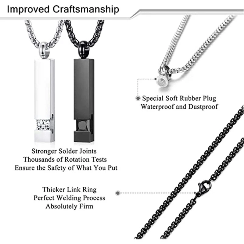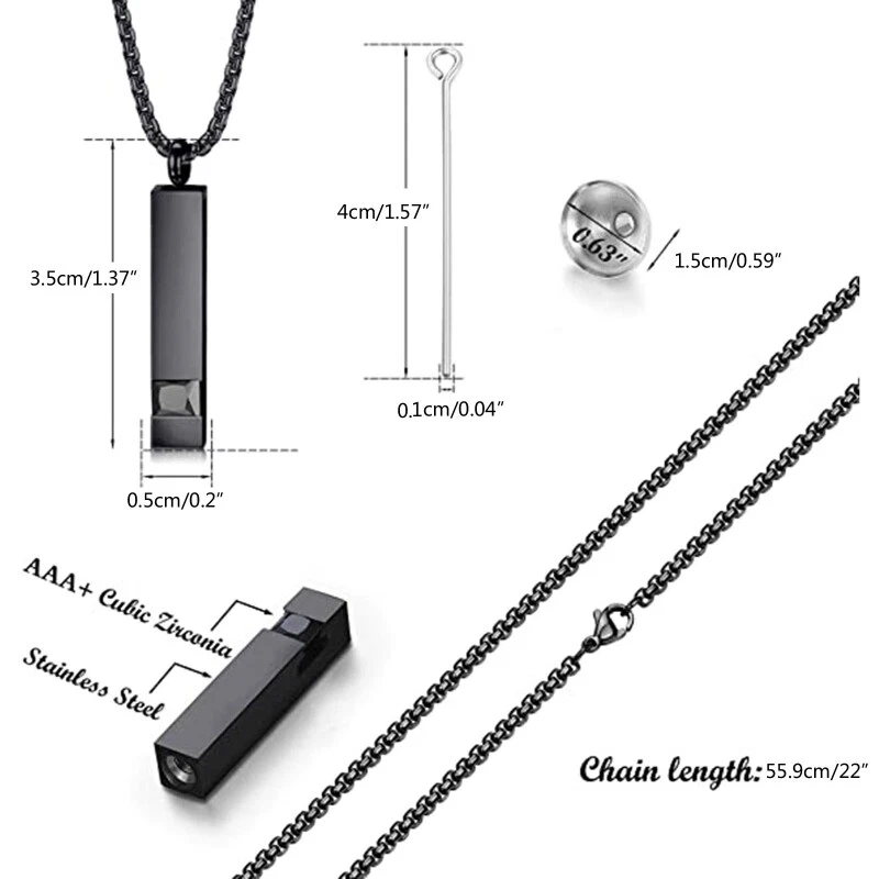 2x Cremation Urn Pendant Necklace for Memorial Stainless Steel with Zircon Features: Memorial Ashes Necklace: Keep your loved ones close to your heart for always. Cremation Jewelry, also known as funeral jewelry, memorial jewelry, or remembrance jewelry can hold the ashes or a lock of hair/fur of your loved ones, dried flowers. Large Space Large space You can easily fill ashes inside It is size-able enough to hold a nice amount of ashes. Hand-crafted urn necklace, ashes necklace, jewelry for urns, cremation urn, memorial jewelry, or remembrance jewelry is used as a remarkable way to memorialize your loved ones. It is available in the form of pendants, rings, bracelets, necklaces, lockets A meaningful present for family and to cherish loved ones will have special meaning, for storing items as a souvenir. Cremation Urn Pendant: The urn necklace is Stainless Steel, Pendant size:approx.38x6mm/1.49x 0.23in; chain length: 60cm/23.62inch, it works great for about everyone. Specifications: Stainless Steel Pendant:Approx.38x6mm/1.49x0.23inch Necklace:Approx.60cm/23.62inch Package Includes: 2 Pieces/set Pendant Necklace note: Please allow 1-2cm errors due to manual measurement,pls make sure that you do not mind before you order. Due to the difference between different monitors, the picture may not reflect the actual color of the item.