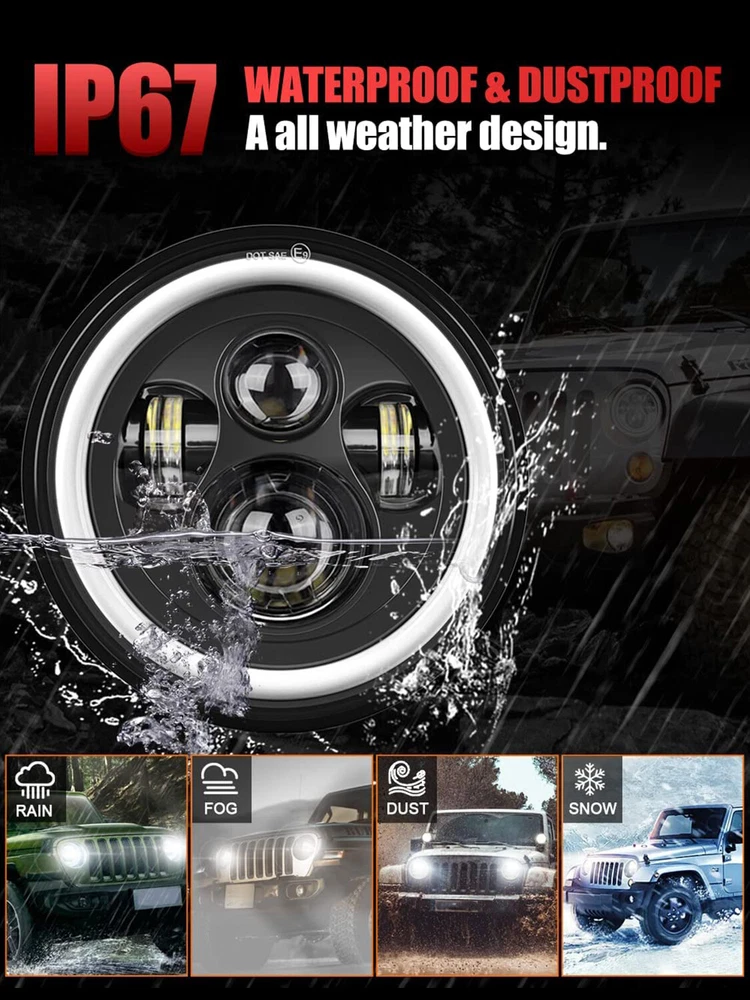 Package include: 2pc 7" round led headlights 2pc H4-H13 adapter Features: Newest Unique Design- 7 inch led headlight with Exclusive Honeycombed LEDs. Special design provides a more steady and concentrated beam pattern to improve the efficiency of illumination. Durable & High Performance- 7 inch Led Headlights comes with exlusive anti-scratch lens. Built in anti-flicker EMC functions to avoid flickering. Shock-proof and IP 67 waterproof. DOT,SAE,E- Mark approved, work well in all kinds of harsh weather conditions. Plug-N-Play Installation- Super easy to install and very straight forward - Usually in 20 Minutes or Less. LED CANBUS, Included 2pc H4-H13 Adapter. Specification: Voltage: DC 9V~36V Luminous Flux: 6000LM@high beam/PC,4800LM@low beam/PC Color Temperature: 5600-6800K White Wattage: 60W/PC Material: high quality black aluminum housing Lifetime: More than 80000 hours Waterproof Rating: IP 67 Dimensions: 7 Inch Surface Finish: Black Housing Connection: H4/9003 Plug Fitment: For Freightliner Coronado 2001-2016 Century Class For jeep Wrangler TJ 1997-2006 For jeep Wrangler CJ-7 1976-1986 For jeep Wrangler JK 2 Door 2007-2015 For jeep Wrangler TJ Unlimited/LJ 2003-2006 For jeep Wrangler JK 4 Door Unlimited 2007-2015