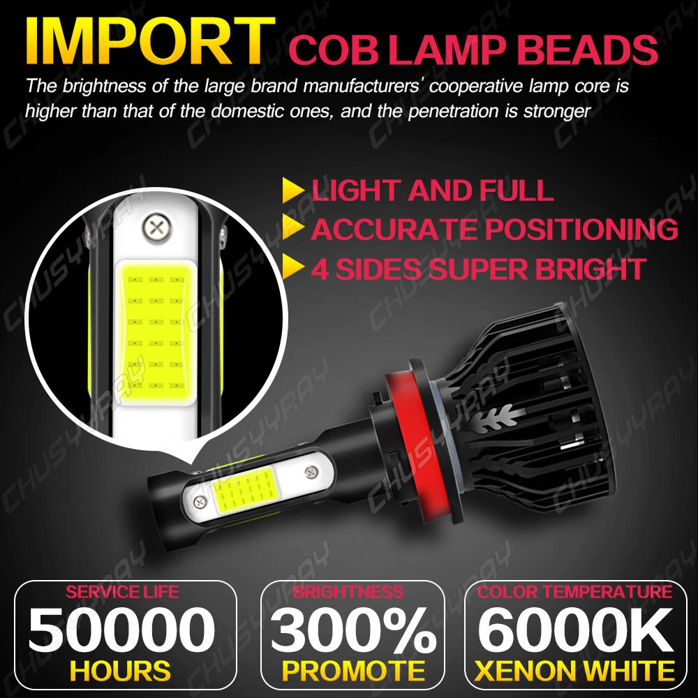 If the product is not suitable or there is a quality problem, please contact our customer service directly to solve the problem. We will give you a satisfactory solution. Spesification: Plug Type: H11/H9,Hi/Low Beam LED Quantity(each bulb): 4-sides Operating Voltage: DC fit 12V,24V vehicles Color Temperature: Pure White 6000K - 6500K IP67 rated water and dust seal,over 50000hrs lifetime Material: Aviation 6063 aluminum profile Operating Temperature: -40-80 degree Celsius Usage: Headlight, Foglight (2pcs/set)H11 COB Hi-Lo Beam LED headlight conversion kit Latest COB chip light source,4 luminous faces no blind zone Engineering beam pattern design throw more light on road evenly at appropriate angle without foggy light Xenon white light reflect road paint/signs better to show clearer road situation during night driving All-in-one heat conduction+high speed mute fan system keep the light bulb in appropriate working temperature Built-in constant current CPU, instant full brightness without start-up relay Two-way heat dissipation channel: 1.All-in-one aluminum profile as heat conduction system, 360 degree heat radiating 2.High speed mute fan (12000R/Min),high Air flow for faster cooling rate Compatible Models and Years: - Universal for most vehicles on the market like SUV, bus, truck, sedan, pickup, sport utility etc. Specifications: * Brand: CHUSYYRAY * Condition: 100% Brand New * Light Source:4 Sides COB LEDs * Material: Aviation Aluminum + ABS * Color Temperature: 6000K White * Working Voltage: 12V * Output Power (Each): 100W * Number of Bulbs: 2 * Waterproof Rate: IP67 * Luminous Flux: 10000lm/ Bulb * Working Temperature: -40℃ - +80℃ * Bulb Type: H11 * Beam Type: High Beam/ Low Beam * Beam Angle: 360 Degrees * Lifespan: Over 50,000 hours * Heat Dissipation Principle: Heat Pipe Technology + Aluminum Radiator * Fitment Type: Direct Replacement * Placement on Vehicle: Front, Left, Right * Color: Black * Net Weight: 112g Parcel Content: - 2 * 4-side H11 LED Headlight Bulbs - 1 * Packaging Box Information: a)Compatible List can not show up all Car model. Please check the Correct item size of your vechicle. it will work and fit.Thank you! b)If you are unsure the item fit or not , please do remember send message to tell us your car make, model, year and other information which is helpful to check the item fit or not.For example: For 2004 Ford F 150, high/low beam For 2015 RAM 1500 with projector-type, high beam For 2019 Ford F 150 ,XL Crew Cab Pickup 4-Door 2.7L On Nov 22, 2024 at 02:14:28 PST, seller added the following information:
