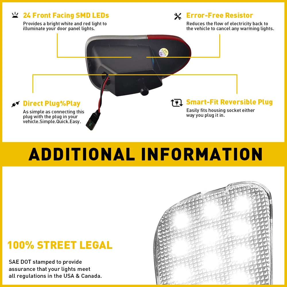 Fit for: 1997-2003 Ford F-150 1997-1999 Ford F-250 Specifications: OE:F65Z13B724AA, F65Z13B725AA Service life: 50000+ Waterproof: IP67 Light color: red/white LED quantity: 18LED(White) 6LED(Red) Lumen: 570LM(White) 380LM(red) Color temperature: 6000K(White light) Light housing:Transparent + red Placement on vehicle: left, right Features: *High brightness Built with 100% advanced high brightness LED chips,6X brighter than OEM light bulbs. *Superior material Superior LED beads with efficient energy-saving expand the service lifespan. *Long service life 2x LED Interior Door Panel Courtesy Light Lamp Pair For 1997-2003 Ford F150 Fit for: 1997-2003 Ford F-150 1997-1999 Ford F-250 Specifications: OE:F65Z13B724AA, F65Z13B725AA Service life: 50000+ Waterproof: IP67 Light color: red/white LED quantity: 18LED(White) 6LED(Red) Lumen: 570LM(White) 380LM(red) Color temperature: 6000K(White light) Light housing:Transparent + red Placement on vehicle: left, right Features: *High brightness Built with 100% advanced high brightness LED chips,6X brighter than OEM light bulbs. *Superior material Superior LED beads with efficient energy-saving expand the service lifespan. *Long service life ABS plastic housing and strong PC lens with waterproof, dustproof, and shockproof functions make the light more durable. *Easy installation Plug and Play, direct installation without wiring or modification. *Perfect match It is the perfect LED interior door panel light for your car. Packaging include: Door light*2(left+right) Item Specifics Brand AUXITO Color White/Red Color Temperature 6000K Features DOT-Certified,SAE-Certified Finish Powder-Coated,Textured Housing Color Chrome (Crystal) Interchange Part Number F65Z13B724AA, F65Z13B725AA Item Height 7.6cm Item Length 11.4cm Item Width 7.3cm Items Included Bulbs Lens Color Clear Light Color Cold White,Red Lighting Technology LED Manufacturer Part Number OEM#F65Z13B724AA, F65Z13B725AA Manufacturer Warranty 3 Years Mounting Style Simple Installation, Plug&Play Number of Bulbs 24LEDs OE/OEM Part Number F65Z13B724AA, F65Z13B725AA Performance Part Yes Placement on Vehicle Door Front Left Rear Right Type Interior Door Panel Courtesy Light Universal Fitment Yes Vintage Part Yes Voltage 12 V Wattage 3 W Material ABS FAQ ♥ If you have a decoding problem or any other problems, please contact us first, we will help you with it. We will reply you within 24 hours in working days. I'm a new seller, thanks a lot for your trust and convince! I will serve you with all my heart. ♥ Q1: Will this bulb fit my vehicle? A: We can match almost any vehicle to one of our bulb sizes. eBay only lets us include some vehicle fitments per listing, but if your vehicle does not show up on the compatibility table at the top of our listings, welcome you to contact us for free consulation before purchasing a product. Q2: My item has not arrived, what's taking so long? A: Sometimes items take longer than expected, especially if it’s going far or to rural area. Check with your post office to see if your item has been held up. Sometimes Royal Mail will not update a tracking number until it has arrived at its destination. If your item still don't arrive after a few days, let us know so we can double check for you and help solve it asap. Q3: My bulbs won't fit, help! A: Special bulb holder may be required. See if you can take the holder from the stock bulb. If not, let us know. The bulb size may be wrong, double check the item you received with the item you ordered. Do you have an aftermarket lighting housing? These may not be perfectly fitted for aftermarket bulbs and will require some manual modifications. Q4: Neither side lighting up? Both sides flicker, hyper flash, or work inconsistantly. A:Check the light fuses, and then check the ballast plugs to insure correct installation. If this doesn't work, there may be a voltage problem with the vehicle. You probably just need a relay or capacitor. Even though some bulbs are builtin resistors, they may still need a decoder. Payment (1). We gladly accepts payment via PayPal, We will ship your item(s) within 24 hours. (2). Before payment, please keep the consistency of Paypal address and ebay address. (3). Quantity orders are welcome! Returns (1). We offer 60 days free return policy. Please contact us within 60 days from the date you receive your order if you have any issues with the product or want return. Refund will be send after we got your resend package. (2). All returned items should be in the original packaging , return tracking information should be provided . Contact us (1).Negative feedback will not help resolve any problems you have, please contact us via eBay messages before leaving negative feedback , our customer service will make best effort to help you with the issues. (2).We maintain high standards of excellenceand strive for 100% customer satisfaction! Feedback is very important to us. We request that you contact us immediately before you give us neutral or negative feedback, so that we can satisfactorily address your concerns. About us We're professional in car and motorcycle accessories, especially in LED bulbs. We have our own factory and R&D team. Our belief is to sell top quality items that fit your car and serve you with our heart. Anything please feel free to contact us! Our customer service is very responsibility. Come and follow us! DESCRIPTION PAYMENT SHIPPING RETURN POLICY CONTACT US Shop Category Store Home Other Hot Item 2PCS O2 Oxygen Sensor Up+Downstream For 08-14 Chevrolet Equinox/GMC Terrain 2.4L USD 29.99 BLACK ROOF TOP TRIM MOLDINGS FOR 2006 2007 2008 2009 2010 2011 2012 TOYOTA YARIS USD 17.99 Front Headlight Lamp Filler Molding Trim Panel For Toyota 2012-2015 Tacoma S USD 18.99 AUXITO 7440 7443 7444 LED Backup Reverse Back Up Light Bulbs Super Bright White USD 12.59 5/16" Marine Outboard Boat Motor Fuel Gas Hose Line Assembly with Primer Bulb US USD 20.99 New List Item 4x AUXITO 9005 9006 Combo LED Headlight High Low Beam