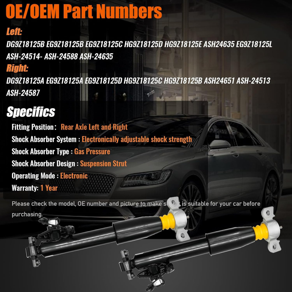 WHY OUR CUSTOMERS KEEP SHOPNG WITH US ✅All items are covered by manufacturer warranty. ✅FAST FREE SHIPPING. ✅Most orders ship within 1 business day with Tracking Number. Customer also can choose two-day or expedited shipping. ✅100% customer satisfaction is backed by a 30-Day Money Back Guarantee for New items and a 30-Day Money Back Guarantee for Recon. FEATURES 【High Standard Shock Absorbers for MKZ】 Manufactured with high quality materials and advanced technology, the magnetic ride control shock absorber provides stable performance and flexible adjustable support to effectively reduce rebound. 2x Left & Right Shock Struts Absorber Assembly for 13-20 Lincoln MKZ Ford Fusion WHY OUR CUSTOMERS KEEP SHOPNG WITH US ✅All items are covered by manufacturer warranty. ✅FAST FREE SHIPPING. ✅Most orders ship within 1 business day with Tracking Number. Customer also can choose two-day or expedited shipping. ✅100% customer satisfaction is backed by a 30-Day Money Back Guarantee for New items and a 30-Day Money Back Guarantee for Recon. FEATURES 【High Standard Shock Absorbers for MKZ】 Manufactured with high quality materials and advanced technology, the magnetic ride control shock absorber provides stable performance and flexible adjustable support to effectively reduce rebound. 【Replacement Part Number】Rear Left: DG9Z18125B EG9Z18125B EG9Z18125C HG9Z18125D HG9Z18125E ASH24635 EG9Z18125L ASH-24514-ASH-24588 ASH-24635;Rear Right: DG9Z18125A EG9Z18125A EG9Z18125D HG9Z18125C HG9Z18125B ASH24651 ASH-24513 ASH-24587. 【Compatible Vehicle】ASH24635 EG9Z18125L ASH24651 EG9Z18125D shocks compatible with Lincoln MKZ 2.0L 3.7L 2013-2020, for Ford Fusion 1.5L 1.6L 2.0L 2.5L 2013-2017. 【Ideal MKZ Rear Shock Absorber Swap Options】OEM standard manufacturing, perfect fit for your vehicle. Direct installation, no modification required, easy to install. Cost-effective solution to shock absorber issues.Make your vehicle run smoothly again.You will receive a pair of Rear Shock Absorber Assemblies (Rear Left & Rear Right). 【Quality Guarantee】 If you encounter any problems when you receive the item, we will quickly solve the problem for you. Satisfying you is our greatest joy. FITMENTS For Lincoln MKZ 2013-2020 For 2013-2020 Lincoln MKZ 3.7L V6 Gas DOHC For 2013-2020 Lincoln MKZ 2.0L l4 Electric/Gas DOHC For 2013-2020 Lincoln MKZ 2.0L l4 Gas DOHC Turbo OEM NUMBER Rear Left: DG9Z18125B EG9Z18125B EG9Z18125C HG9Z18125D HG9Z18125E ASH24635 EG9Z18125L ASH-24514-ASH-24588 ASH-24635; Rear Right: DG9Z18125A EG9Z18125A EG9Z18125D HG9Z18125C HG9Z18125B ASH24651 ASH-24513 ASH-24587. ITEM INCLUDES 2x Rear Shock Absorber Struts Assembly FREE RETURN If you are unhappy with your purchase for any reason, you can return it to us in an un-used condition in the original packaging within 30 days of purchase and we'll give you a refund or exchange. The refund/Exchange will not include postage/eBay costs. Please note you MUST contact us to obtain a Return Authorization Number before returning any part. Any parcel without the Return Authorization Number will be rejected *If your item is faulty or was incorrect, you must contact our sales representative before returning the parcel and we will endeavour to solve the problem effectively. Video or picture is required to show the item 、condition before we issue the Return Authorization Number. * Professional installation is highly recommended (No Instruction Included) * For any needs please contact us Item Specifics Brand : susucar Items Included : 2x Rear Shock Absorber Struts Assembly Type : Shock & Strut Set Placement on Vehicle : Rear Shock Absorber Type : Gas OE/OEM Part Number : ASH24635 EG9Z18125L ASH24651 EG9Z18125D Interchange Part Number : DG9Z18125B EG9Z18125B EG9Z18125C HG9Z18125D HG9Z18125E Superseded Part Number : ASH24635 EG9Z18125L ASH-24514-ASH-24588 ASH-24635 Other Part Number 1 : DG9Z18125A EG9Z18125A EG9Z18125D HG9Z18125C Other Part Number 2 : HG9Z18125B ASH24651 ASH-24513 ASH-24587 Manufacturer Warranty : 2 Years Material : Aluminum Style : Modern Exterior Finish : Machined Shock Absorber Design : Suspension Strut Operating Mode : Electronic Fitment Type : Direct Replacement OE Spec or Performance/Custom : OE Spec About My Store : 100% SATISFACTION, 100% Source manufacturer Manufacturer : SUSUCARpartsWhosale Why choose US? Susucar is passionate about maintaining our culture of demonstrating value and building personal client relationships in perfecting the client experience. We are also a culture of giving back to the community and preserving our precious planet - a passion that runs deep throughout our Company. Every single item we sell goes through thorough inspection processes to make sure it works perfectly for you. If for any reason you are not satisfied with our product, please shoot us a message. We will do everything in our power to make things right Returns and Exchanges Hassle Free Returns! All our new and refurbished products come with a 30-Day Free Return Policy. If you would like to return your item and you are within 30 days of the purchase, and it is still in its original condition, you can request a return label and return the item by contacting us through eBay messaging. We offer Free Returns in the USA and will provide you with a prepaid return label. Once the item has been received and verified, a refund of the purchase price and any taxes paid will be issued. Shipping & Payment Policy Ground Shipping is always Free within the US (48 contiguous states)! Once payment is received, your order will be processed and shipped the same or next business day. A tracking number will be provided on all orders. Please note that we can only ship to addresses verified with PayPal. We may contact you for additional verification if needed. We cannot ship to APO or FPO addresses, and orders to Puerto Rico, Hawaii, and Alaska will incur additional shipping charges. For your safety and convenience, we process all payments through PayPal w