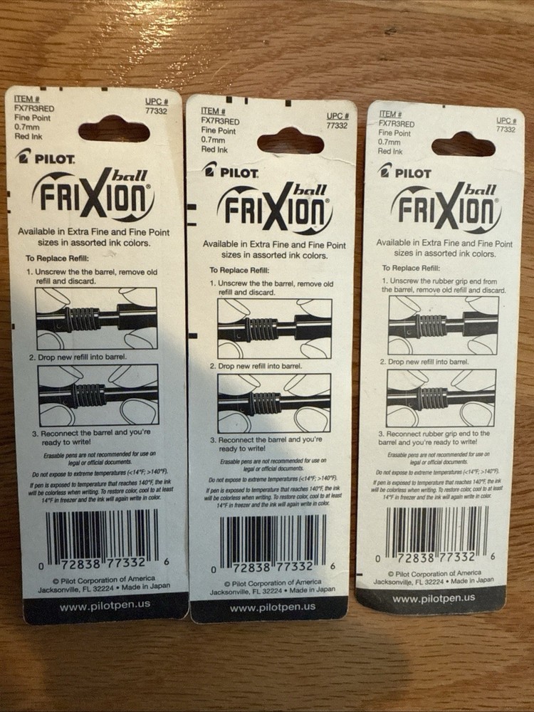 Model: Frixion Gel Ink Refills MPN: FX7R3RED Bundle Description: 2 Packs (3 Refills Per Pack) Country of Origin: Japan Brand: Pilot Modified Item: No Custom Bundle: Yes