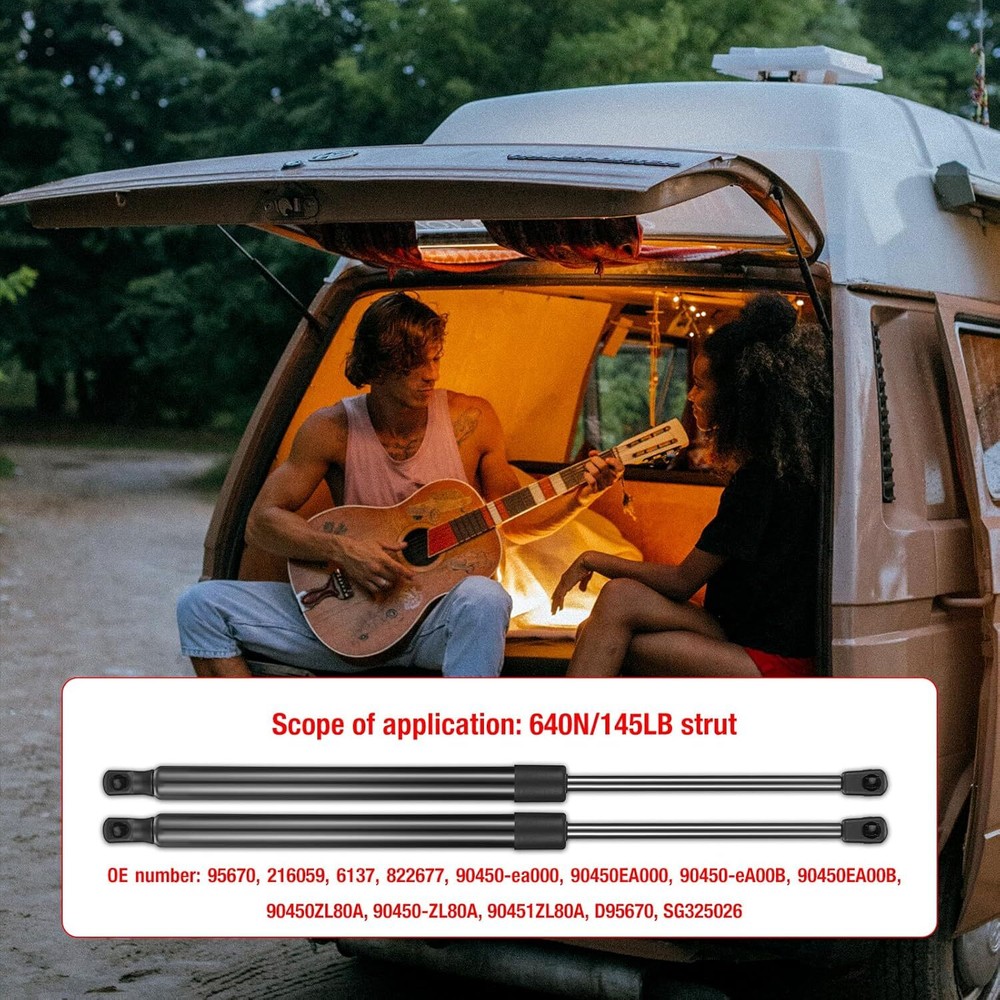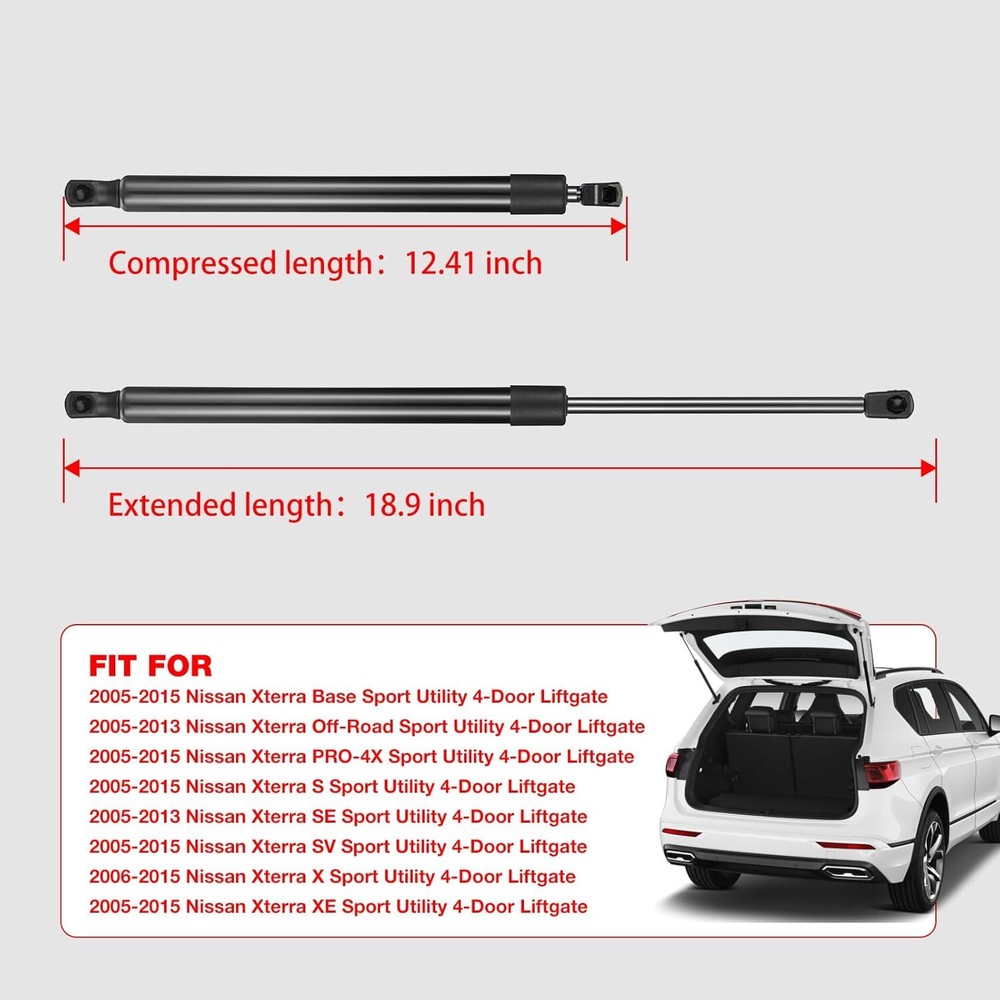 【Basic Info】BDFHYK lift supports are compatible with 2005-2015 Nissan Xterra Base Sport,2005-2013 Nissan Xterra Off-Road Sport.etc.More information can be found in the pictures or on the details page.It has 2 items in one set and is installed at front hood. Extended Length: 18.9 inch; Compressed Length: 12.41 inch. 145 lbs 640 N per prop. No ball studs. 【Precautions】Please confirm compatibility based on your vehicle's year, brand, model, and the OE number of the replacement parts.Front hood struts lift support are compatible with OE:95670, 216059, 6137, 822677, 90450-ea000, 90450EA000, 90450-eA00B, 90450EA00B, 90450ZL80A, 90450-ZL80A, 90451ZL80A, D95670, SG325026. 【Easy to install】BDFHYK gas struts are very easy to install. You can install it only by yourself with a flat screwdriver. 2x Rear Hatch Struts for Nissan Xterra 2005-2015 Liftgate Tailgate Lift Supports Fits the following Years: Fits for Nissan Xterra Base 2005-2013 Sport Utility Fits for Nissan Xterra Off-Road 2005-2013 Sport Utility Fits for Nissan Xterra PRO-4X 2005-2013 Sport Utility Fits for Nissan Xterra S 2005-2013 Sport Utility Fits for Nissan Xterra SE 2005-2013 Sport Utility Fits for Nissan Xterra SV 2005-2013 Sport Utility Fits for Nissan Xterra X 2006-2013 Sport Utility Fits for Nissan Xterra XE 2005-2013 Sport Utility Interchangable with: 6137,216059, 90450ZL80A,90450-ZL80A,90451ZL80A,90450-ea000,90450EA000,90450ZL80A,90450EA00B,90450-eA00B,1040305 Package: 2x Lift Supports Product Description Installation instructionsqth Payment Delivery details Terms of sales About us Contact us Payment 1.We only accept PayPal. PayPal is the only online payment method we accept. Please make sure you have a valid/confirmed PayPal account prior bidding. 2.All Paypal Payments must be Confirmed. Payment must be made within 48hrs of the auction end time. Non-Paying bidders will be reported. 3.When you get your package,maybe you will pay some charges, it's taxes for local customs,not pay to us, and the fees are depends on the customs, all buyer are same. Delivery details 1.Items will be shipped within 2 business days after payment is received. 2.We ship to your eBay address. Please make sure your eBay address is correct. Buyer takes responsibility if eBay address is wrong. 3.Import duties, taxes and charges are not included in the item price or shipping charges. Please check with your country customs office for these additional charges. 4.We shipping using UPS or USPS from our nearest warehouse to you. Tracking numbers will be emailed upon shipment. Terms of sales 1.Please feel free to email us if you have any question. 2.We appreciate you contact us via eBay message when you are not satisfied rather than open case or leave negative feedback directly. We'll try our best to solve the issue. 3.Refund will be issued once we receive your returned items. Buyer is responsible for all return shipping charges. 4.Please contact us for return process before you return the item. 5.All items for exchange or refund must be returned in "as new" condition. About us We are the responsible seller ,always provide high-quality products and best service .If you have any questions, please contact us, and will try our best to help you. Please contact us by eBay Message, and we will reply you within 24 hours. Thank you very much! Contact us We are the professional auto parts manufacturer , and provide line lock, AN hose end fittings , fuel line , fuel filter , fuel regulator , exhaust cutout , exhaust tips , exhaust muffler and so on .The quality of the product to be secured. If you have any questions or any needs , please contact us , and will try our best to help you.