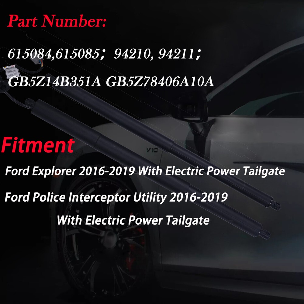 2x Rear Tailgate Power Lift Support For 2016 2017 2018 2019 Ford Explorer Package includes: Rear Left & Right (1 Pair) Power Lift supports Fitment: (For Reference Only) 2016-2019 Ford Explorer Features: 100% test before shipping to ensure product safety, stability and durability. OE Qualify Guaranteed.From manufacturer that maintains complete strict quality control. Direct-fit replacement ensures proper fit, form, and function. Plug and play design ensures ease of installation. Designed to meet Federal Safety Standards. Specifications: Condition: Brand New & Perfect Packed Quantity: 2 Power Strut Part Number: 615084,615085;94210, 94211;GB5Z14B351A GB5Z78406A10A Note: Please Check Carefully To Make Sure the OE Number And Picture are Exactly Listed Are The Same As Your Orignal One.If You are Not Sure Whether It Fits, Please send VIN number to us. No Instruction Included, professional installation is highly recommended. Payment Delivery details Terms of sales Payment We accept payment by Credit Card,Bank Transfer and other Payment that Aliexpress support. Payment must be receive within 7 days of auction closing. Please list your special requests(color,packages,value of declaration,etc.) when you make payment,or you send message to us. Delivery details Item Location : USA Shipping Method :USA post parcel (about 3 to 8 business days ) Handling Time: The items will be sent in 24 hours after clearing the payment. Shipping address: The items will be sent to your ebay address, anything change , pls contact us before payment. Terms of sales All the destination country local tax is the buyer responsibility. All the items will a "GIFT" description and a Low value for faster custom process. We suggest all buyers to insure their items. Color Black Manufacturer Part Number GB5Z14B351A GB5Z78406A10A UPC Does not apply Material Steel Vintage Part No Placement on Vehicle Rear, Rear Left,Rear Right Brand autoled Type Electric Power Tailgate Strut Interchange Part Number 615084,615085 OE/OEM Part Number 94210, 94211, 615084,615085, GB5Z14B351A GB5Z78406A10A Manufacturer Warranty 5 Years Features Automatic Opening, Hands-Free, Height Adjustment Universal Fitment No Finish Painted Performance Part No