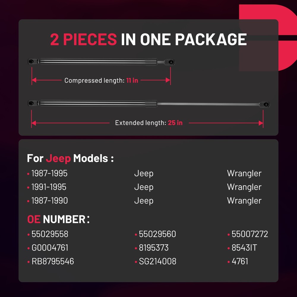 2x Rear Window Lift Supports Gas Struts for Jeep Wrangler 1987 1988-1995 SUV