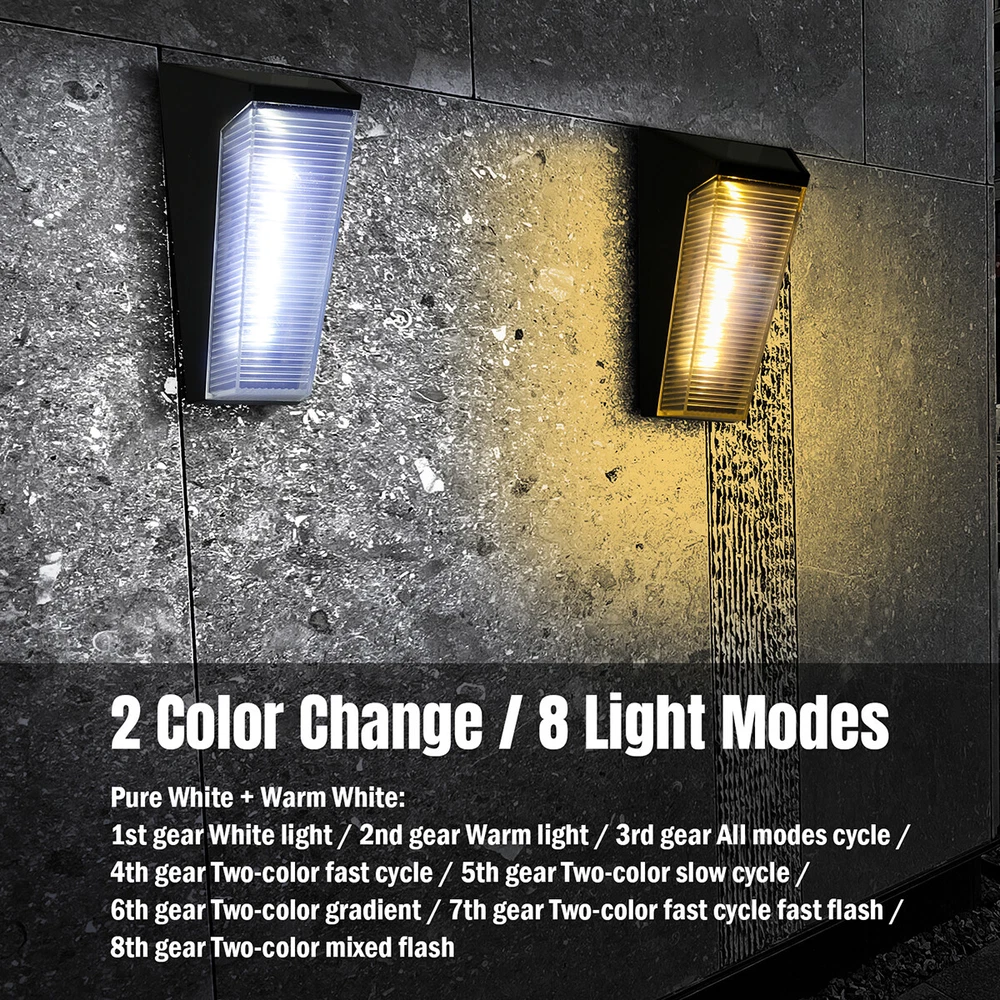 2x Solar LED Deck Lights Path Garden Patio Pathway Stair Step Fence Lamp Outdoor 2x Solar LED Deck Lights Path Garden Patio Pathway Stair Step Fence Lamp Outdoor 100% Brand New & Excellent quality Free & fast shipping, with tracking number provided Multicolor[5 Modes] Feature: * Solar Charging: The Solar Wall Light can be charged by solar energy, absorbing energy during the day and automatically lights up at night. * Outdoor Waterproof: The Solar Wall Light has IP55 waterproof rating, fearless of wind and rain, and can be used normally on rainy days. * ABS Material: The Solar Wall Light is made of ABS material with excellent impact resistance, which can effectively prevent damage due to accidental impact during use. * Intelligent Light Control System: Solar Wall Light adopts intelligent light control system, which can intelligently sense the change of external light and automatically turn on and off the light. * Easy to Install: Solar Wall Light is an independent power generation system, no need to lay complicated wires and cables, installation is more convenient and quick. Specification: Solar Panel: polycrystalline silicon 2V*130mA Battery Parameters: Ni-MH AA 1.2V/600mA Voltage: 1.2V Power: 3W LED Parameters: 6LED Charging Method: solar charging Charging Time: >8 hours Working Hours: >8 hours Waterproof Grade: IP55 Switch Mode: hand control + light control Material: ABS Color: black Light Color: Colorful Size: 6x7x12cm/2.36x2.76x4.72in Package Includes 2 x Solar Wall Lights 2 x Screws 2 x Expansion Tubes Warm White+White Light[8 Modes] Feature: * Solar Charging: The Solar Wall Light can be charged by solar energy, absorbing energy during the day and automatically lights up at night. * Outdoor Waterproof: The Solar Wall Light has IP55 waterproof rating, fearless of wind and rain, and can be used normally on rainy days. * ABS Material: The Solar Wall Light is made of ABS material with excellent impact resistance, which can effectively prevent damage due to accidental impact during use. * Intelligent Light Control System: Solar Wall Light adopts intelligent light control system, which can intelligently sense the change of external light and automatically turn on and off the light. * Easy to Install: Solar Wall Light is an independent power generation system, no need to lay complicated wires and cables, installation is more convenient and quick. * Working Mode: Solar Wall Light has 8 working modes, 1 speed white light, 2 speed warm light, 3 speed full mode cycle, 4 speed dual color fast cycle, 5 speed dual color slow cycle, 6 speed dual color gradient, 7 speed dual color fast cycle fast flash, 8 speed dual color mixed fast flash. Specification: Solar Panel: polycrystalline silicon 2V*130mA Battery Parameters: Ni-MH AA 1.2V/600mA Voltage: 1.2V Power: 3W LED Parameters: 6LED Charging Method: solar charging Charging Time: >8 hours Working Hours: >8 hours Waterproof Grade: IP55 Switch Mode: hand control + light control Material: ABS Color: black Light Color: warm light + white light Size: 6x7x12cm/2.36x2.76x4.72in Package Includes: 2 x Solar Wall Lights 2 x Screws 2 x Expansion Tubes Payment Shipment Return Feedback Contact us Payment * We Accept Payment via PAYPAL ONLY . * Payment Must be Made within 4 Days of Auction Closing. * Non-Payment may Result in a UPI (Unpaid Item) being Put on Your Account. eBay will Automatically Close Your Account if You Accumulate 4 UPI's total. * Please List Your Special Requests ( Color, Size, Packages, etc. ) in the PAYPAL NOTES SECTION when you make payment. Shipment * Shipping will be handled in 24 business hours after payment got. Ship to PayPal Address only , please confirm it before paying. * Please leave your phone number in the address in case there is an address problem. Return * Returns and Exchange accepted within 60 Days. * Refund will be given as Money Back. * Free Return shipping. * Before you return the defective item,please email us for the RMA, and we will reply you in 24 hours in working days. If you do not get reply please check if your mail box has refused our reply or not, then send to us again, thanks! Feedback If you are satisfied with the transaction please remember to leave us a positive feedback (5-Star) will be much appreciated. Please DO remember to contact us before leaving the neutral (3 stars) , negative feedback (1-2 stars) or opening a case/dispute if any problem caused by the item . Normally your email would get replied within 24 hours on working day and your issue would be followed up carefully until we've reached a consensus! We will try our best to solve the problem and leave you a happy shopping mood here. Thank you! We are not only selling good items, but also selling with excellent after-sale service and a strong sense of responsibility. We will always try our best to find you a satisfactory solution if any problem takes place! Contact us Email muchbuy-outlet at Paypal registered email or ebay message.