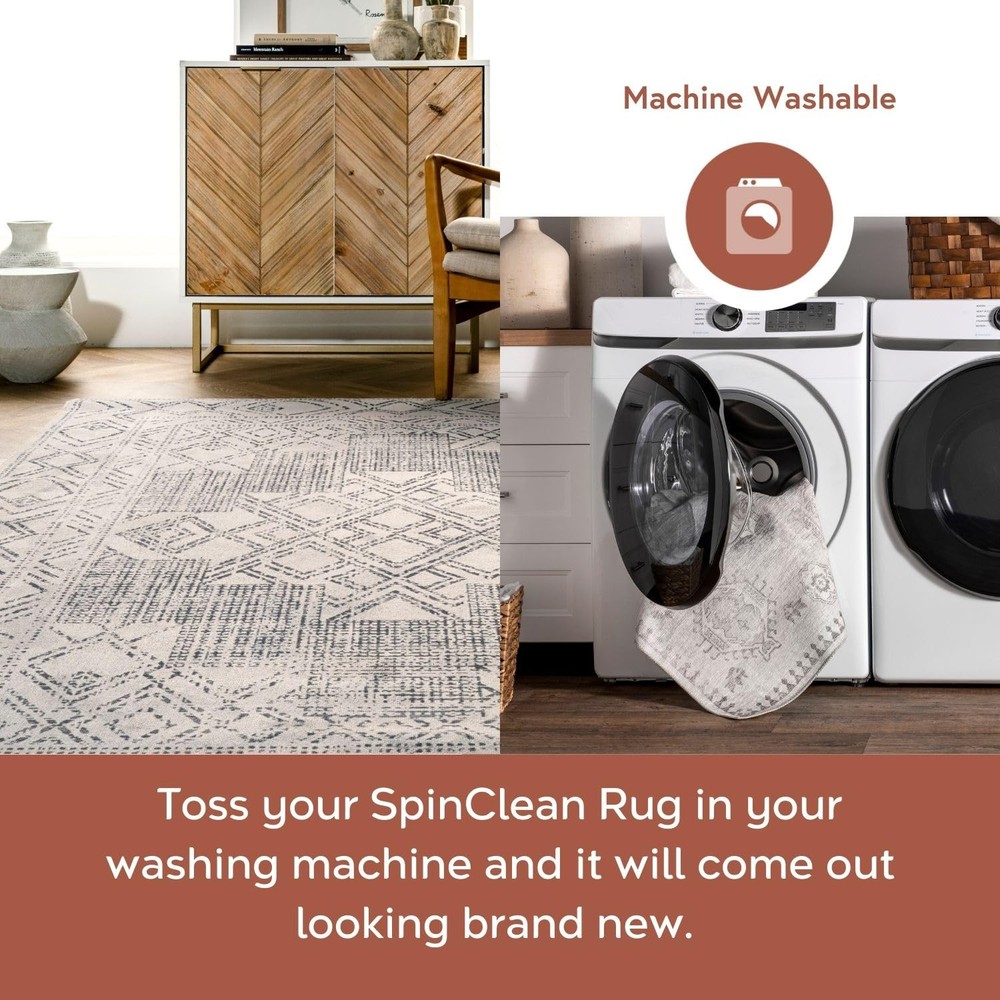 At , we believe that floor coverings and art should not be mutually exclusive. Founded with a desire to break the rules of what is expected from an area rug, was created to fill the void between brilliant design and affordability., The images we display have the most accurate colors possible.Rug Colors, sizes, patterns may vary slightly depending on how your rug is made and the size ordered.Due to different monitor resolutions and lighting you may notice a slight difference in color. Each handmade rug is unique to the artisan who weaved it.These are not considered defects Bunching, Creases and Folded Corners: You may see some creases and bunching in the pile and around the corners when you unroll your new rug. These waves will flatten within 2 -3 weeks as you begin to use your new rug. Use these tricks to help flatten your rug: Back Rolling: Roll the carpet out, then roll it back up reversely with the backside up. Let it sit rolled up reversely for a day or 2, or until it flattens out. Heavy Objects: Lay a piece of heavy furniture or objects on affected areas for a day or 2, or until it flattens out. If the corners are sticking up, curl them back and place heavy objects on affected areas going the opposite way. Heat: Use this technique as a last resort only. Place the rug over a cleared concrete or area like a driveway or sidewalk setting during dry sunny conditions. Allow the rug to be positioned for optimal sunlight as long as possible to give the rug time to absorb the sun's heat for up to 2 hours, but use more time if needed. Blow Dryer: If a large concrete patch with optimal sunlight is not accessible, flip the rug over and use a hair dryer to affected areas to heat up the creases. Always hold the hair dryer 7 to 12 inches away from the rug going side to side on a medium setting, as heat can sometimes cause backing to melt. Stylish and Practical: The SpinClean Machine Washable Collection offers an affordable, low-maintenance solution without compromising on style. This collection features a wide array of designs, from vintage to southwestern, boho, abstract, and modern geometric. Machine Washable for Easy Care: Maintaining this rug is a breeze with regular vacuuming and spot cleaning to preserve its beauty. For tougher stains, just toss your rug in the washing machine on a gentle cycle with cold water. We recommend line drying or using the air-only drying cycle without heat. Designed for Every Room: This area rug is kid and pet-friendly, making it ideal for any space in your home that needs an elevated touch. It ensures lasting style in your living room, bedroom, dining room, kitchen, bathroom, home office, dorm room, as a hall runner or entrance rug. Sleek and Functional Pile Height: The low pile of this area rug brings a sleek, sophisticated touch while being easy to clean and maintain. Designed to be placed conveniently under furniture and doorways or as an indoor entrance rug, this is the perfect high traffic rug for your home. Stain-Resistant Material: Our machine washable rugs are crafted from synthetic materials that are stain-resistant, lightweight, and easy to clean. The stain-resistant properties ensure that the rug maintains its vibrant colors and patterns, even after enduring the demands of everyday use. If your rug is located in an area that receives direct sunlight, regularly rotate your rug to maintain its appearance. Durable Design with Non-Slip Backing: This rug’s power-loomed design is made to endure everyday wear and tear, ensuring long-lasting durability. The integrated non-slip backing keeps the rug securely in place while the reinforced, quality-stitched edges enhance its resilience. For added comfort, pair it with of our rug pads for an extra cushioned feel underfoot.