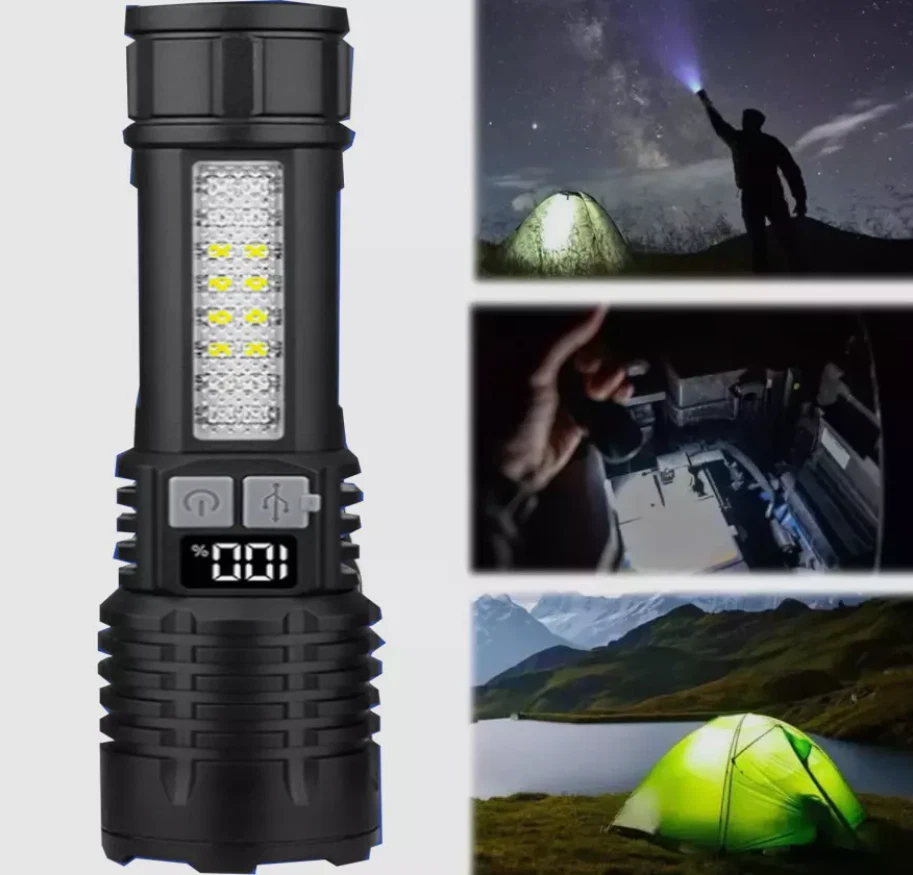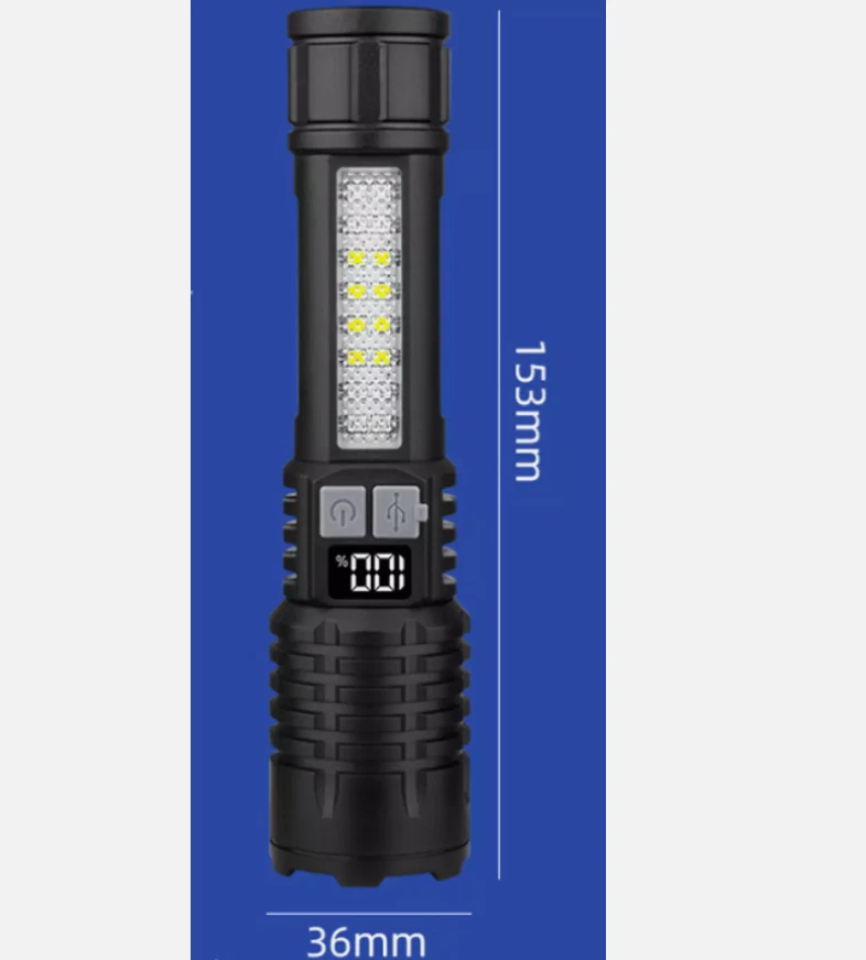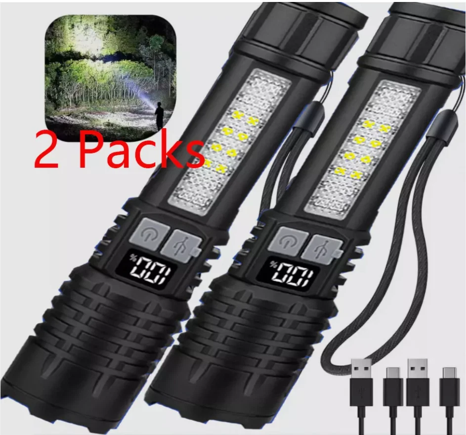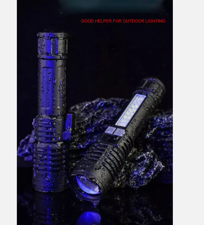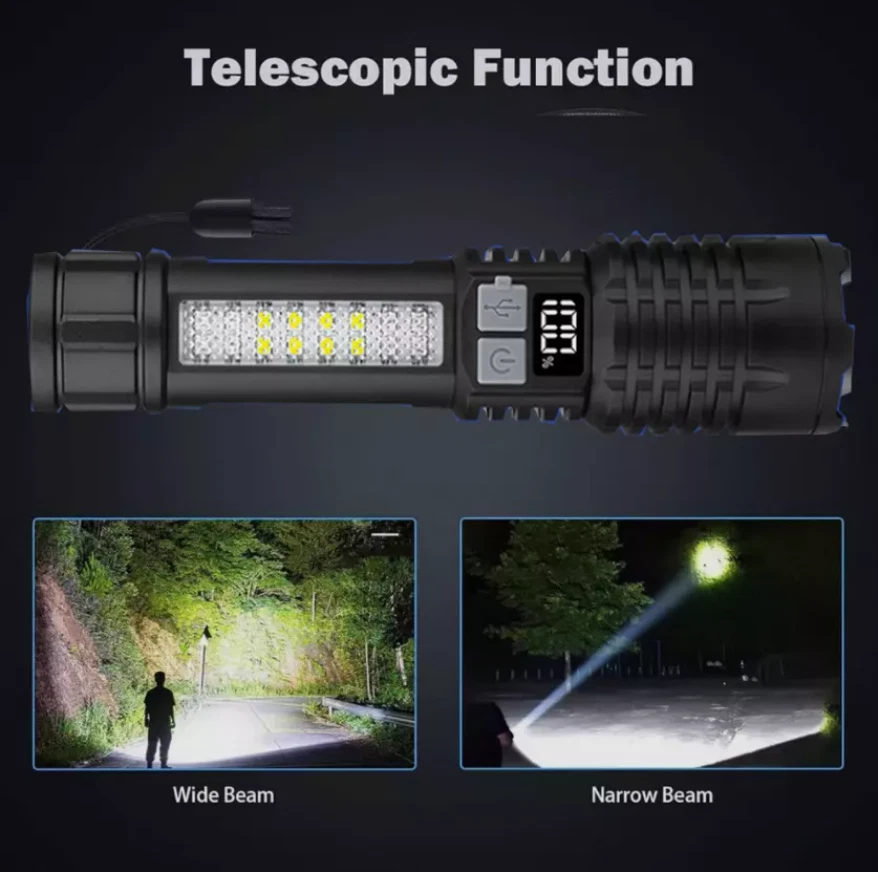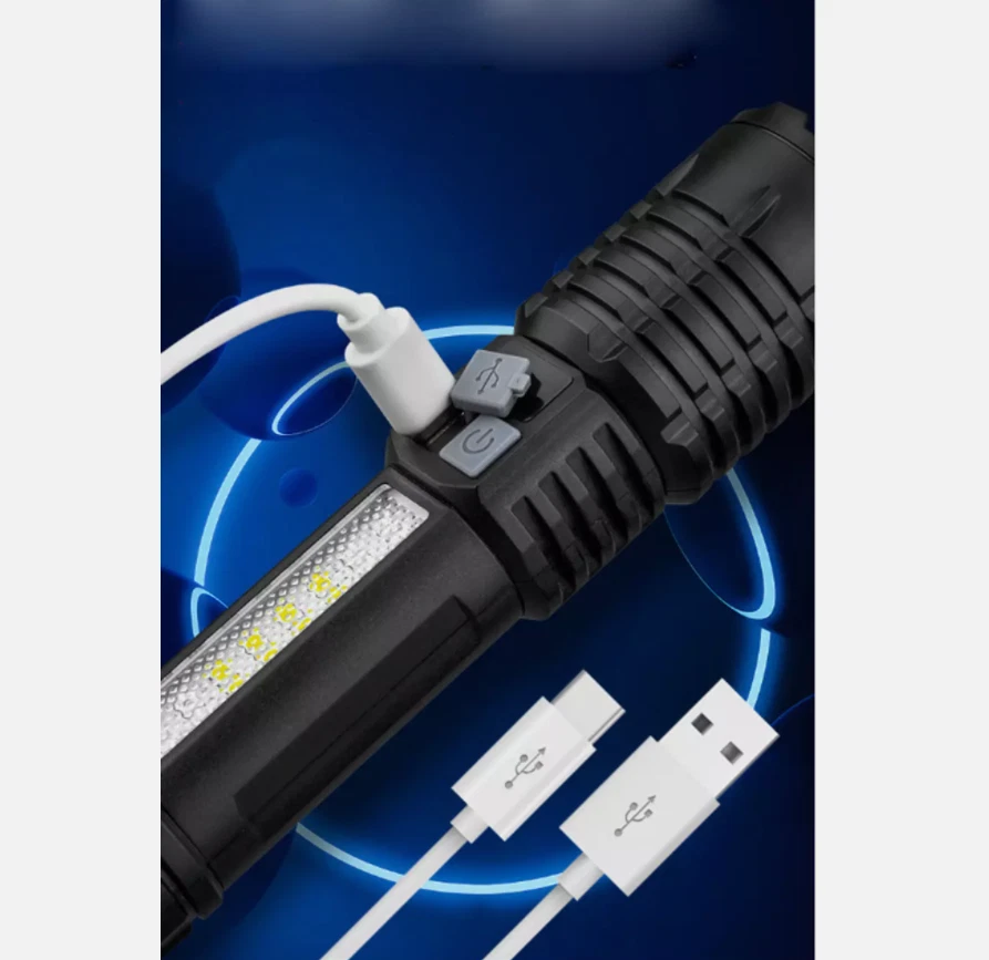 Specifications: Bulb: XHP50 High beam LED Size:15.3*3.6CM Net weight:83*2G Battery:Built-in lithium battery Zoom method: telescopic zoom Charging method: USB charging Material: aluminum alloy+ABS Switch: Push the switch Gear position: 7 gears Waterproof grade: IPX-4 life waterproof Features: 1. Equipped with XHP50 lamp beads , and a service life of 100,000 hours.White High beam LED can illuminate more than 2000 meters 2. Ideal for hunting, adventure and other outdoor adventure activities. 3. This product has a power reminder function, You can know the power status of the flashlight anytime, anywhere 4. Waterproof in accordance with IPX-4, waterproof, can be used in rainy weather, but can not be placed in water 5.Battery capacity display, Micro usb for computer USB, car USB, USB charging plug, charging flashlight.And support USB output function 6.7 lighting modes, super bright headlights equipped with floodlights can meet most of the lighting needs 7.Suitable for work, hunting, climbing, fishing, camping and outdoor activities, etc. Package list: 2 * Flashlight 2 * Battery 2 * Type C charge cable