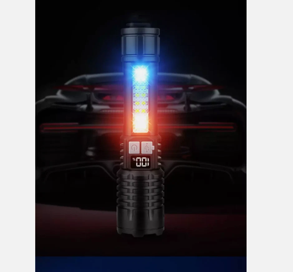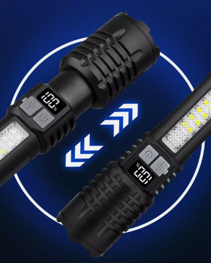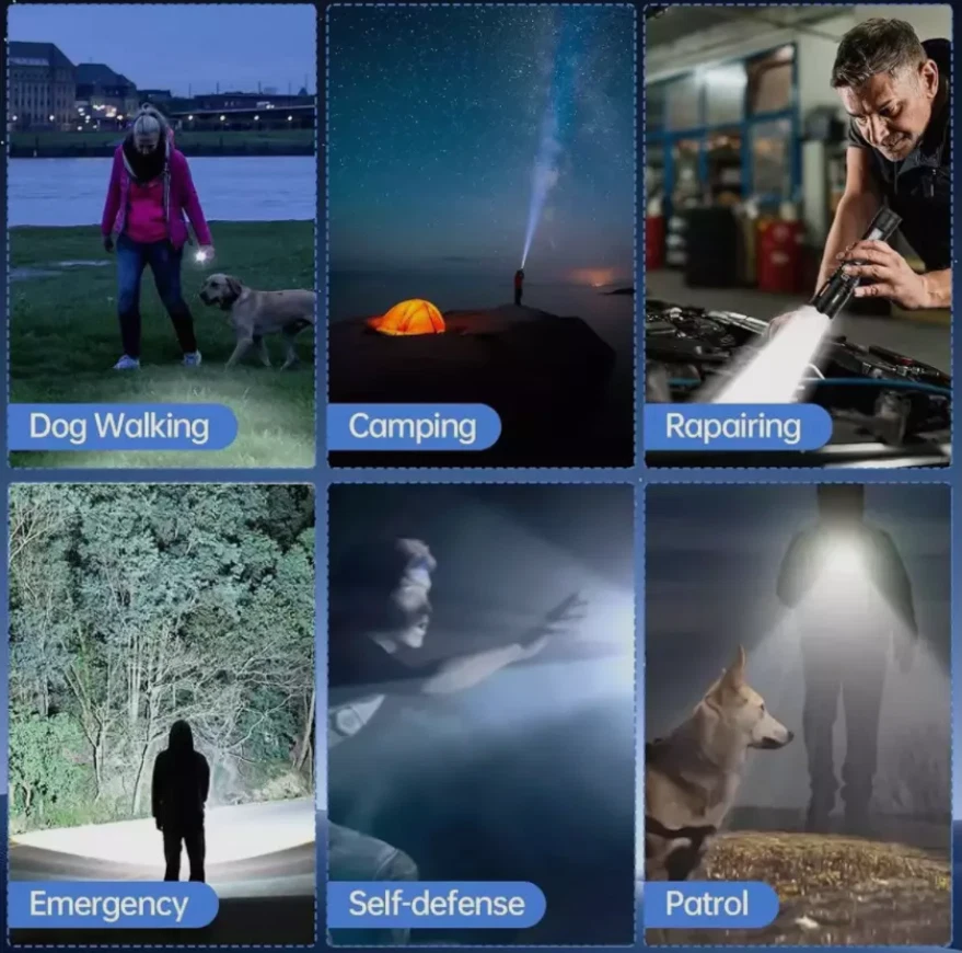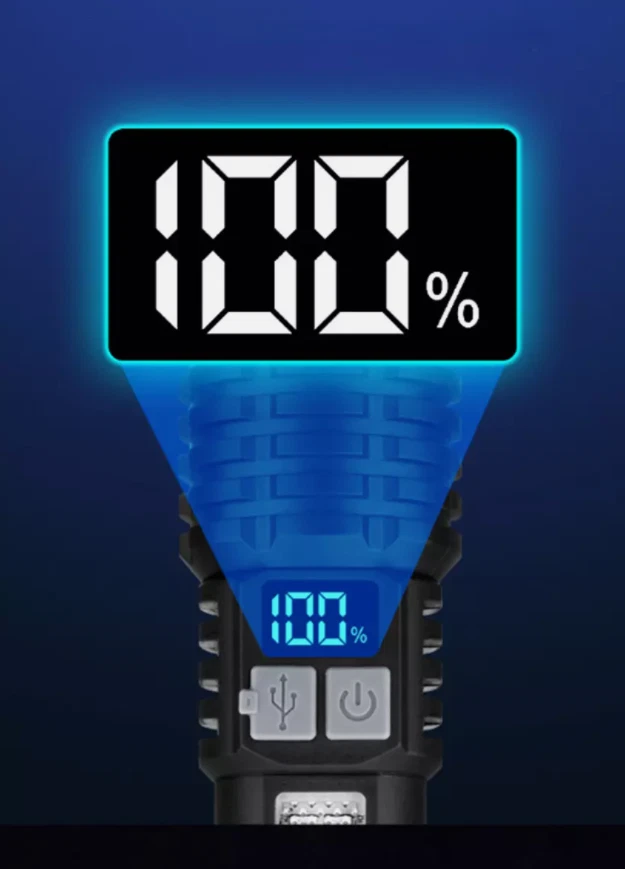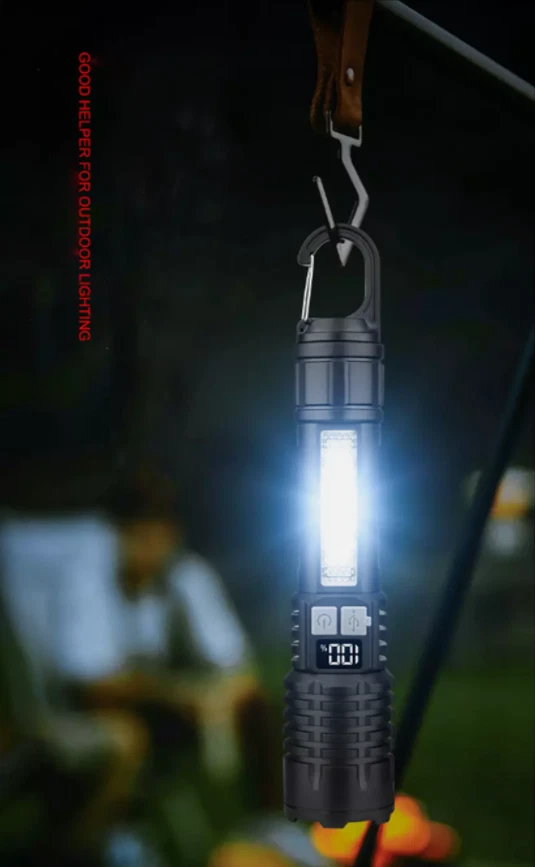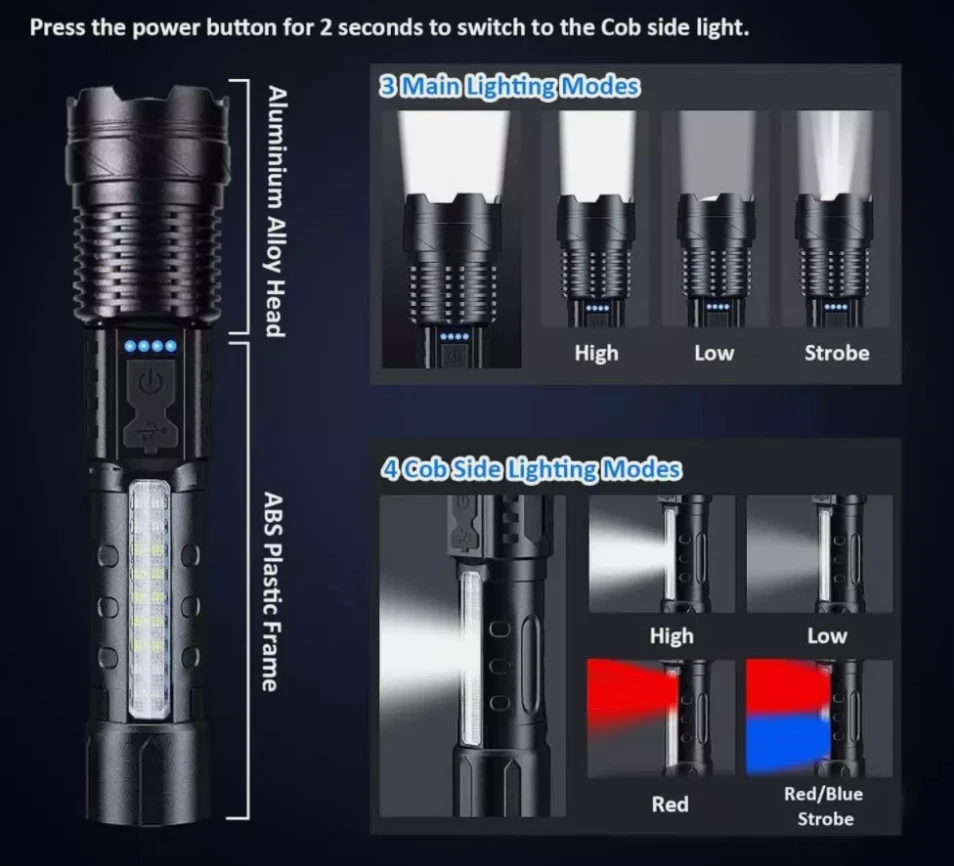 Specifications: Bulb: XHP50 High beam LED Size:15.3*3.6CM Net weight:83*2G Battery:Built-in lithium battery Zoom method: telescopic zoom Charging method: USB charging Material: aluminum alloy+ABS Switch: Push the switch Gear position: 7 gears Waterproof grade: IPX-4 life waterproof Features: 1. Equipped with XHP50 lamp beads , and a service life of 100,000 hours.White High beam LED can illuminate more than 2000 meters 2. Ideal for hunting, adventure and other outdoor adventure activities. 3. This product has a power reminder function, You can know the power status of the flashlight anytime, anywhere 4. Waterproof in accordance with IPX-4, waterproof, can be used in rainy weather, but can not be placed in water 5.Battery capacity display, Micro usb for computer USB, car USB, USB charging plug, charging flashlight.And support USB output function 6.7 lighting modes, super bright headlights equipped with floodlights can meet most of the lighting needs 7.Suitable for work, hunting, climbing, fishing, camping and outdoor activities, etc. Package list: 2 * Flashlight 2 * Battery 2 * Type C charge cable