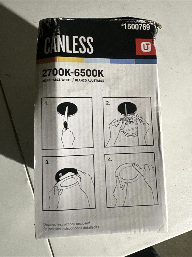 This is a modern Utilitech Canless Recessed Light Kit with a 6" diameter. It is dimmable with 5 settings and features a switch control. The LED light has a color temperature ranging from 2700k to 6500k, providing options from warm white to ultra daylight. With a power source of hardwired installation, this light fixture is suitable for indoor use in any room. It includes one unit and offers 850 lumens of brightness.