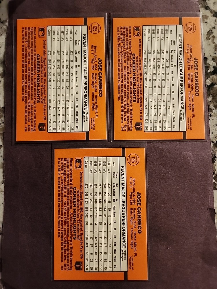 The product is a set of 3 trading cards from the 1990 Donruss series featuring baseball player Jose Canseco, who played for the Oakland Athletics in the Major League Baseball (MLB). Each card is numbered 125 in the set and is part of the Sports Trading Card category. Manufactured by Donruss in 1990, these cards are a collectible item for fans of Jose Canseco or those interested in baseball trading cards from the 1990 season. The cards are shipped in penny sleeves and a top loader.