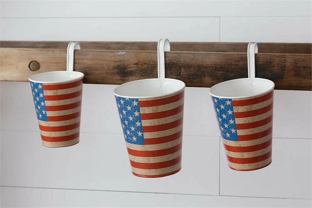 Here is a new set of 3 hanging planters, these are made of metal and each has an attached hook that will hang, these have american flag design and has a white finish insides, these measure as follows, large- 9" H x 5.5 " x 8" med- 8.5" H x 5" x 7", small- 7.5" H x 4.5" x 6" , nice set of hanging planters and are for indoors only and could add greens, etc and check out my many other nice Decor and Lighting.
