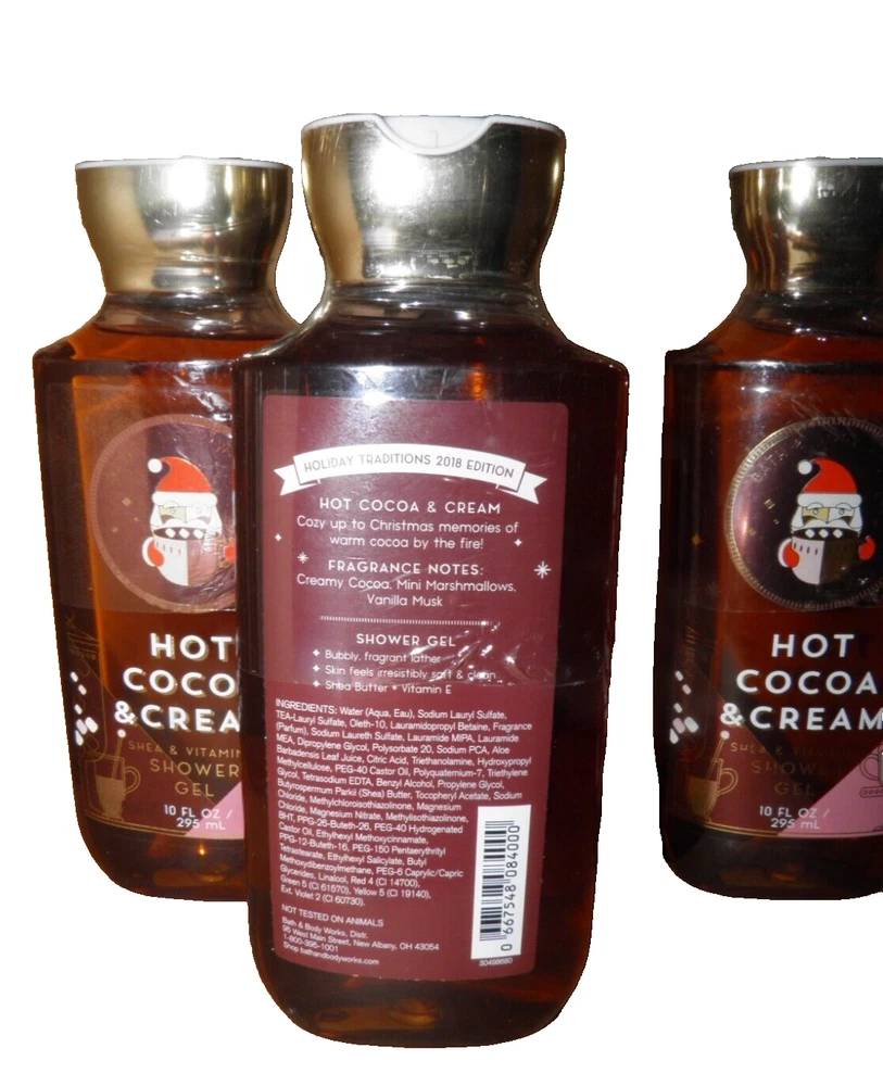 Bath & Body Works HOT COCOA & CREAM Shower Gel Body Wash NEW SEALED 3 x 10 oz bottleS PER ORDER NEW Mailing Address - We cannot change the shipping address after purchase. This policy is in place for the protection of the buyer and seller. Before making a purchase, please ensure that your address is correct. We cannot change the address after purchase and will otherwise cancel the sale. Handling Time - Our handling time is set to THREE BUSINESS DAYS. We ship packages Monday - Friday, except on holidays . This listing is NOT sponsored by, affiliated with, or representative of the mentioned brand(s), trade name(s), or trademark(s) and does not claim any ownership of such. All trademarks or brands mentioned in this listing are registered trademarks of their original owners who reserve all their rights and ownership. The use or mention of any trade name, product name, or trademark is necessary for identification and is for reference purposes only