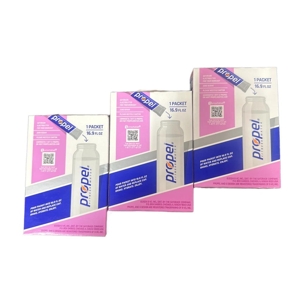 The product is a set of 3 boxes of Propel Drink Mix in Raspberry Lemonade flavor, offering 30 servings of sugar-free sports drink mix. Each serving provides Gatorade Electrolytes, essential vitamins B3, B5, B6, B12, and antioxidants Vitamin C & E. With zero calories per serving, this powdered mix is ideal for replenishing electrolytes during physical activities. The drink mix is designed to be added to water for a refreshing and hydrating beverage option.