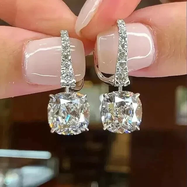 3 CT Cushion Cut Lab Created Diamond Drop Dangle Earrings 14K White Gold Plated